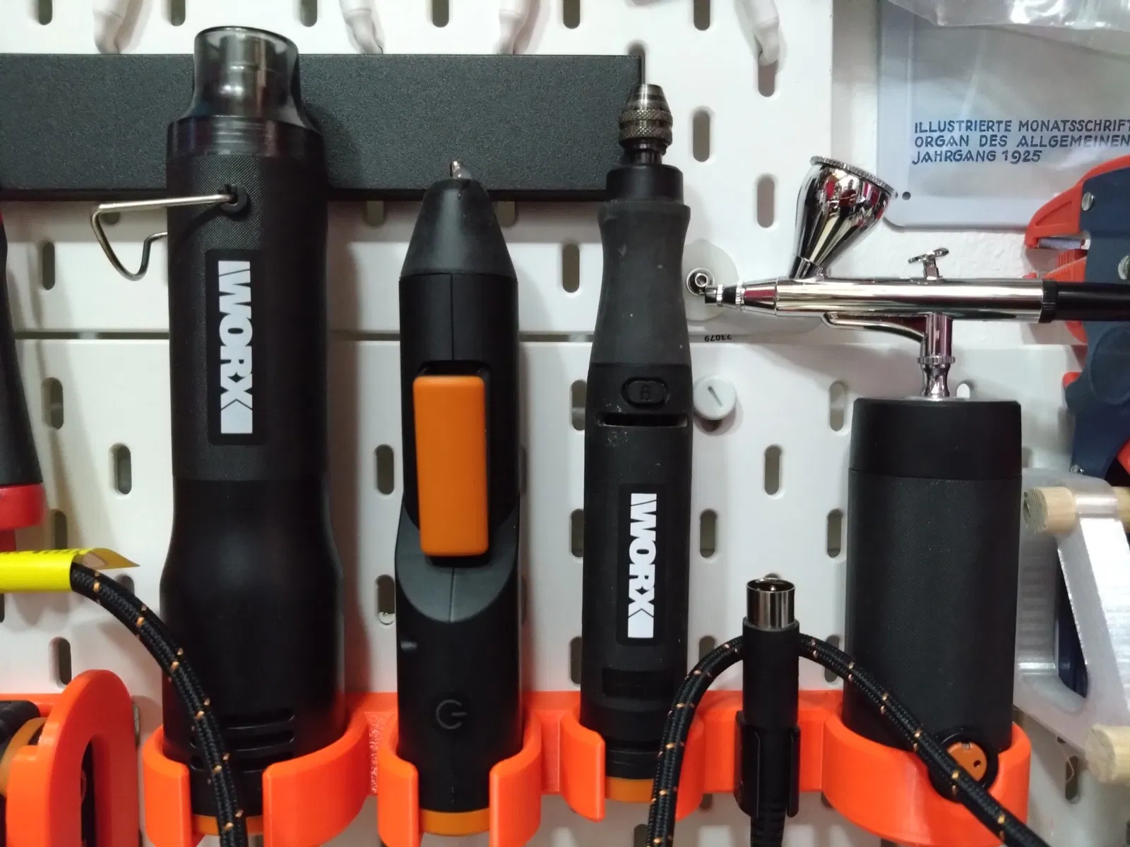 Chỉ là một giá đỡ Skadis cho các công cụ MakerX mà tôi đã có. Tôi dựa trên hệ thống Skadis T-Nut System xuất sắc. Nó có thể chứa súng hơi nóng, súng keo nóng, công cụ xoay, dây điện và súng phun.