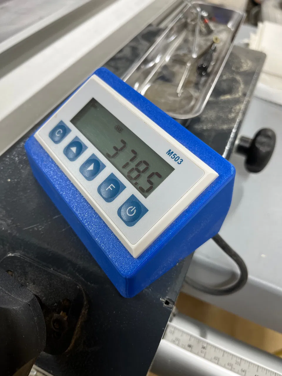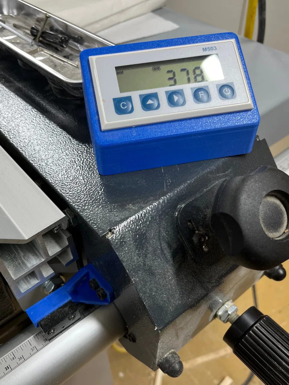 Cho bộ hiển thị này, mình đã sử dụng bộ M503 DRO kèm cảm biến và băng từ 1 mét mua từ AliExpress. Phần vỏ được giữ cố định trên thanh chặn bằng hai nam châm đường kính 15mm và dày 5mm.