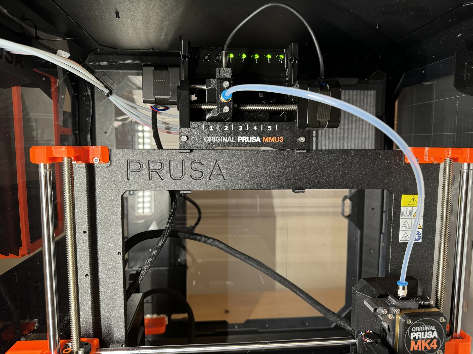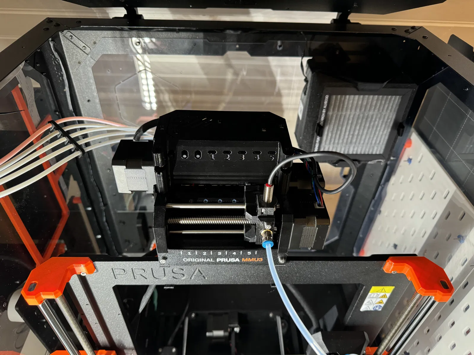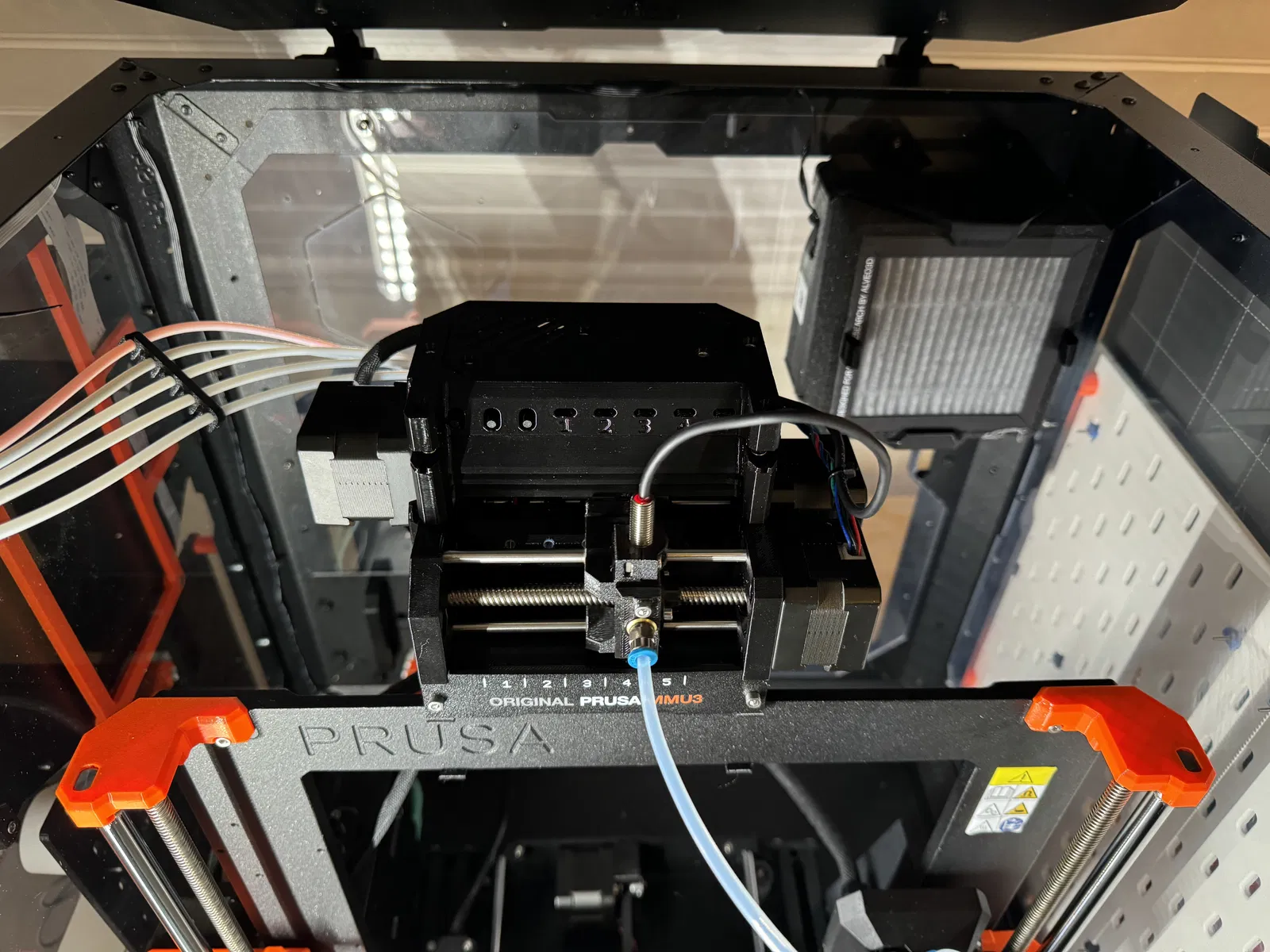 Phần giá đỡ nằm ngang này giúp sợi nhựa uốn cong mềm mại hơn khi năm sợi đi vào phía trên cùng của hộp che (enclosure). Giá đỡ này còn có thêm hai vị trí tạm thời giúp bạn dễ dàng thao tác ở phía sau MMU3.