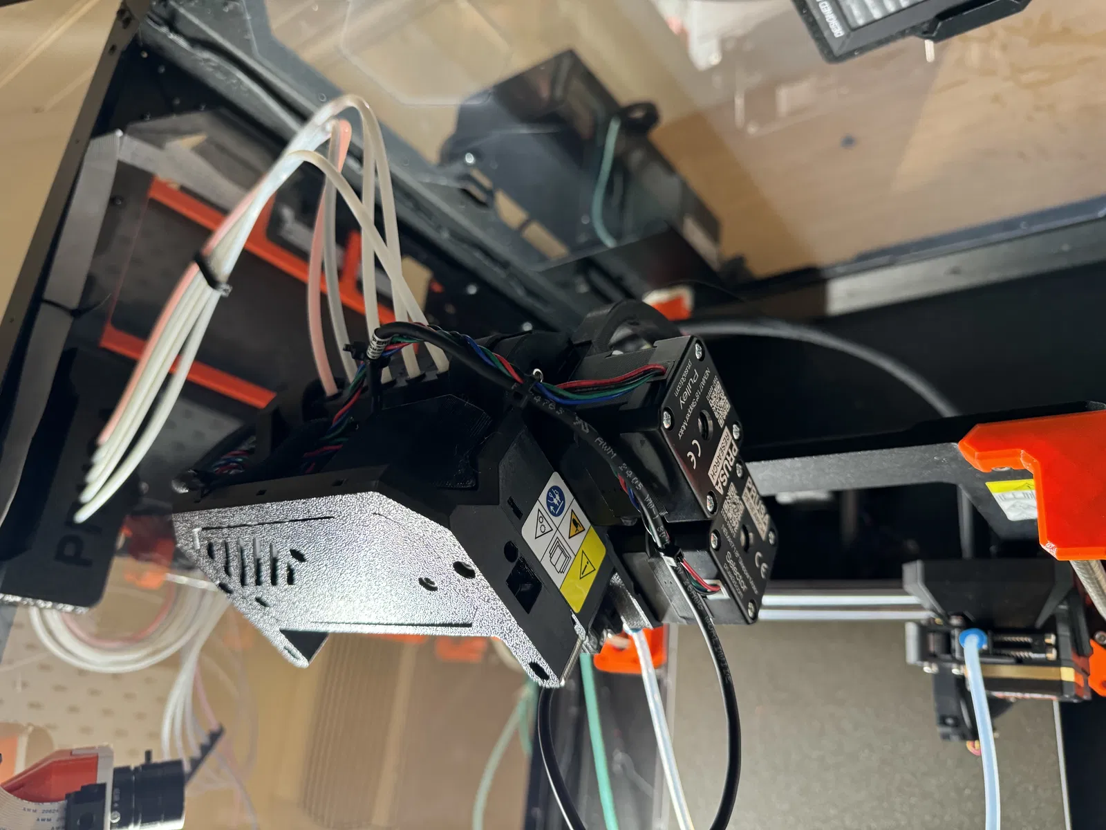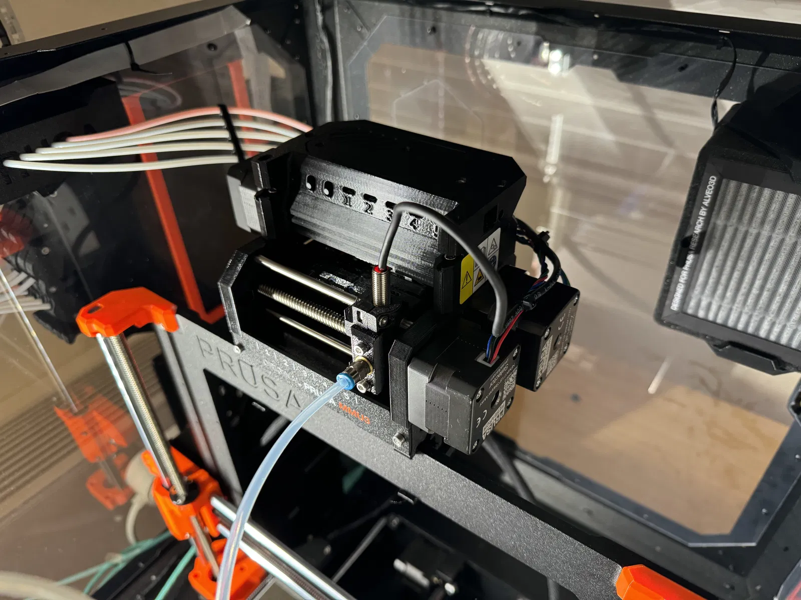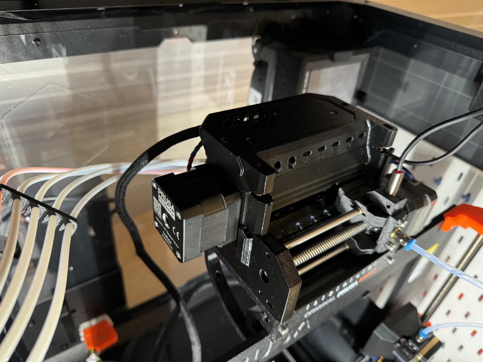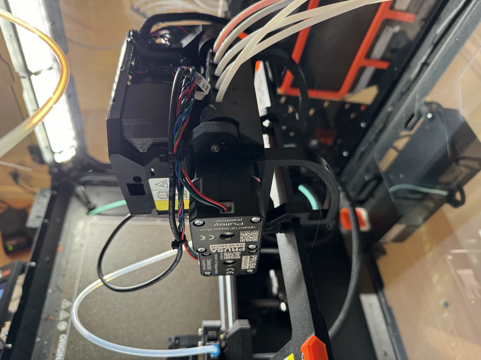 Phần giá đỡ nằm ngang này giúp sợi nhựa uốn cong mềm mại hơn khi năm sợi đi vào phía trên cùng của hộp che (enclosure). Giá đỡ này còn có thêm hai vị trí tạm thời giúp bạn dễ dàng thao tác ở phía sau MMU3.