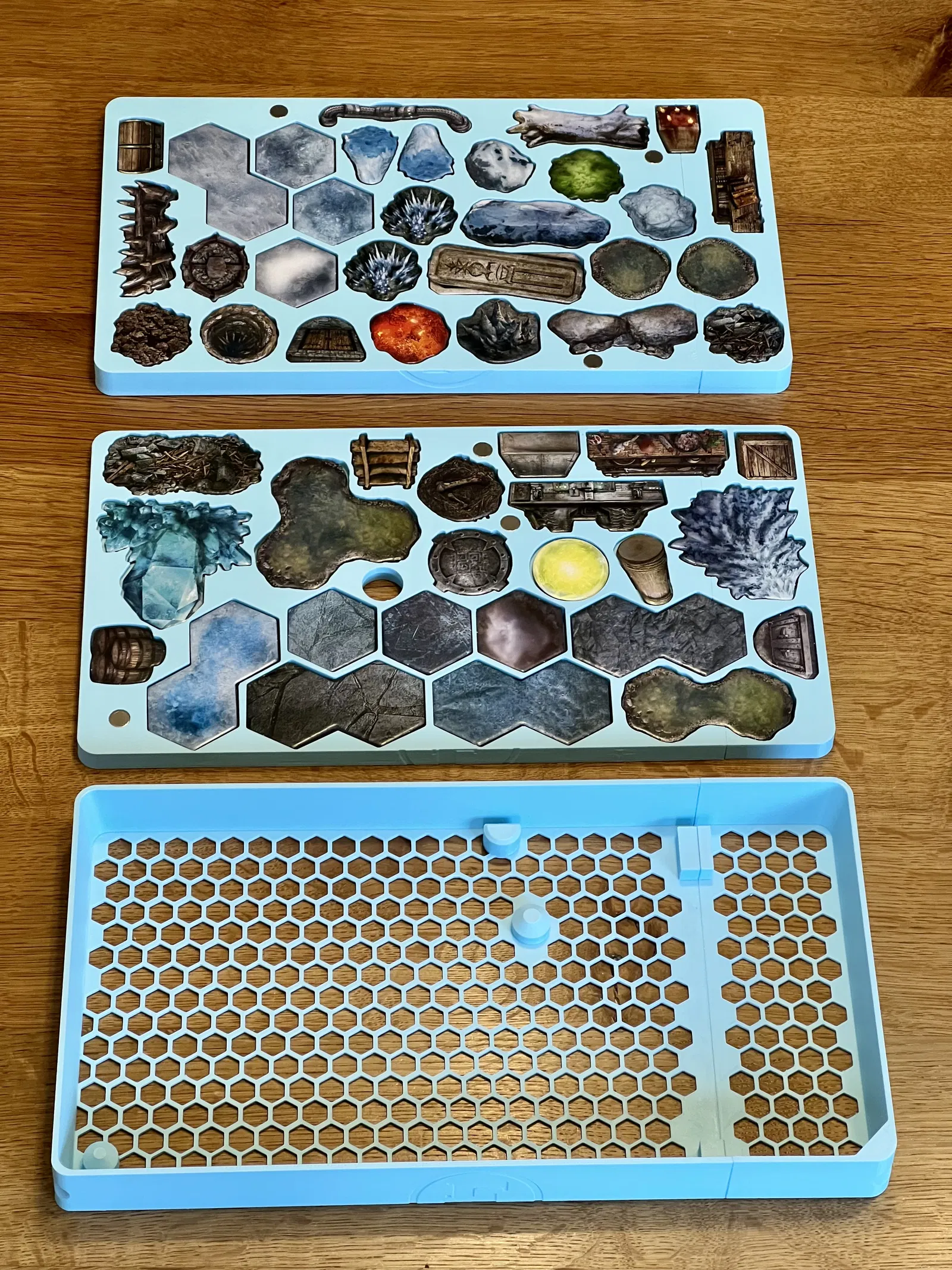 Bộ Frosthaven của mình (bản in đầu tiên năm 2022) có hai phiên bản cắt khác nhau cho token Debris (xem ảnh cuối). Một loại thì vừa với khay gốc còn loại kia thì không. Vì vậy, mình đã điều chỉnh lại khe cắm để chứa vừa cả hai loại. Mình cũng đã sửa lại khe cho token Bear Trap vì phiên bản gốc không vừa với bộ của mình. Tất cả các khe còn lại đều ổn.