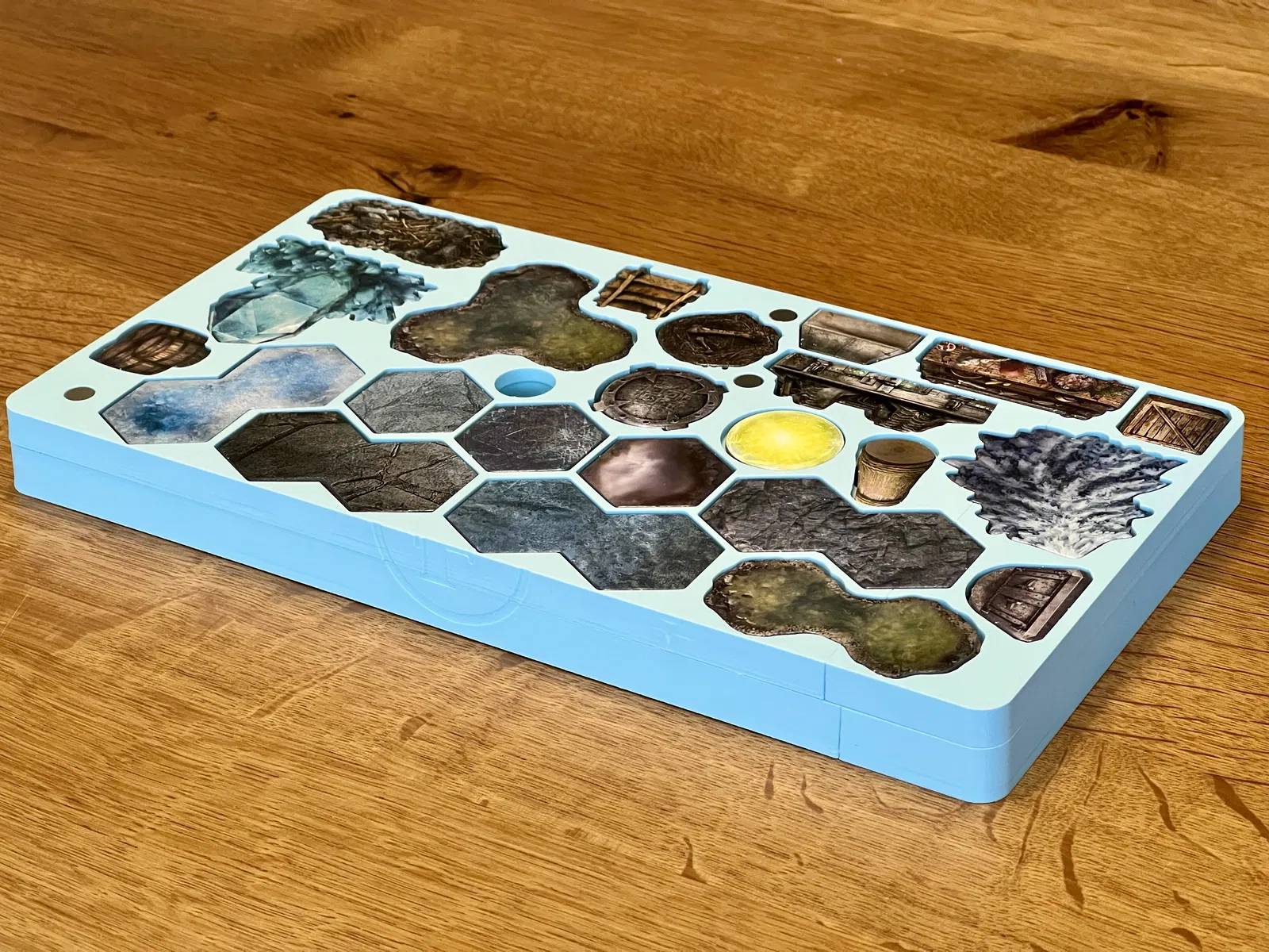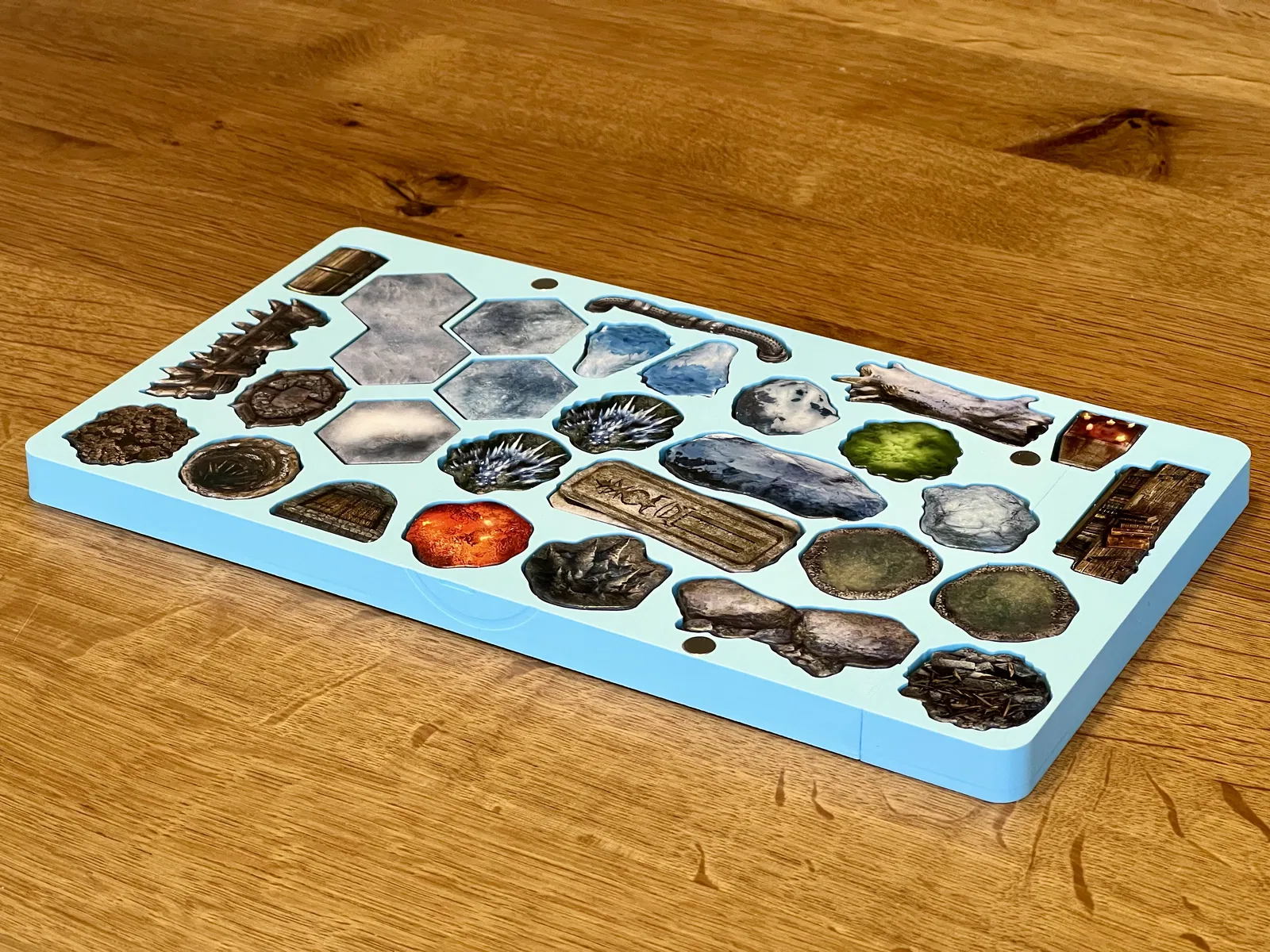 Bản remix bộ lưu trữ mảnh ghép Frosthaven của NR. Mình đã sửa các khe chứa token không vừa, bổ sung hốc nam châm còn thiếu và điều chỉnh dung sai để nam châm 8x5mm khớp hoàn hảo hơn. Kèm theo file in thử nam châm và mẹo chống cong vênh.