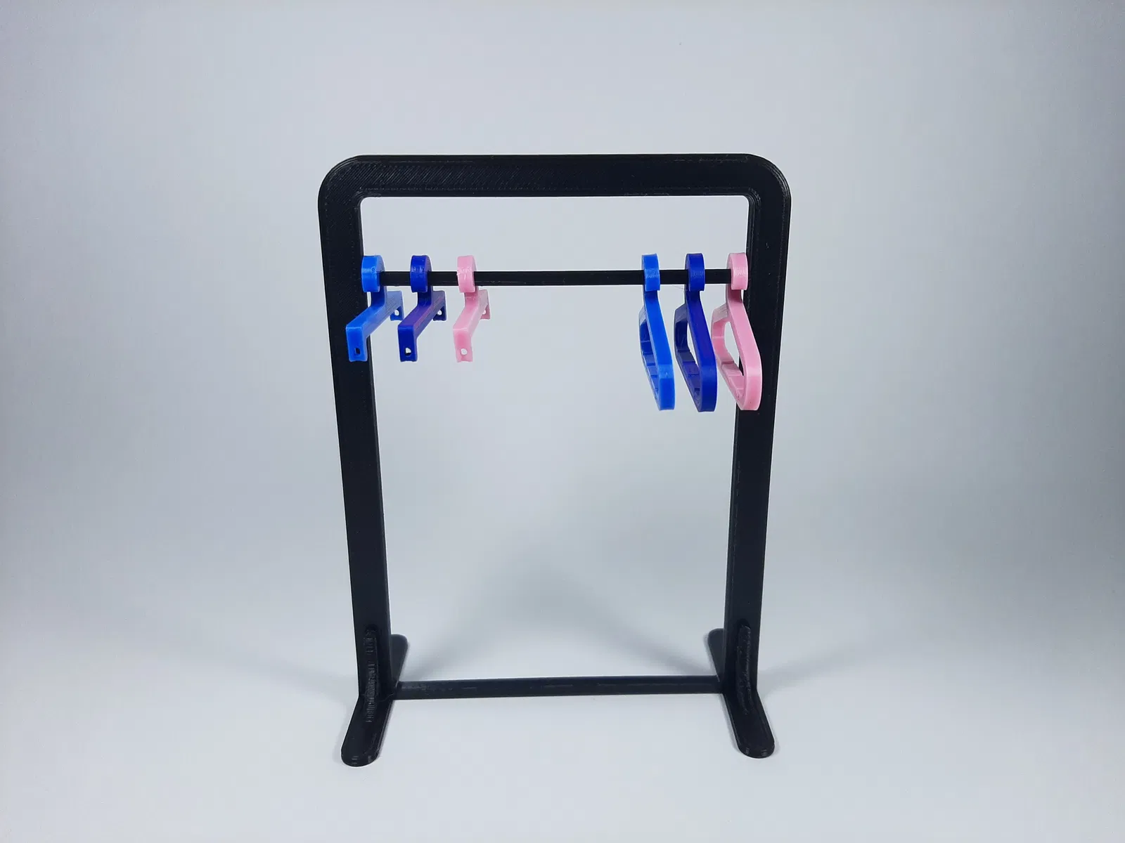 ### Thiết lập in Mình in toàn bộ bằng nhựa PLA, không cần raft hay support, độ phân giải 0.2 mm và infill 100%. Như đã nói, bạn cần hai chân đỡ và một lõi giá cho bộ hoàn chỉnh. Mình khuyên nên in lõi giá nằm phẳng và chân đỡ ở tư thế đứng. Bạn có thể in bao nhiêu móc treo tùy thích. Tương tự như lõi giá, mình khuyên nên in chúng nằm phẳng. ### Lắp ráp Việc lắp ráp cực kỳ đơn giản, chỉ cần gắn lõi giá vào hai chân đỡ rồi móc các móc treo vào. Bạn có thể dán keo cố định hoặc cứ để khớp nối tự nhiên nếu muốn tháo rời để vận chuyển cho dễ. Toàn bộ quá trình có thể xem trong ảnh gif dưới đây: