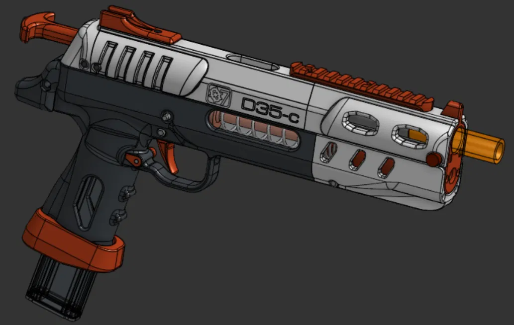 Mô tả: D35-C là mẫu súng blaster dạng lò xo in 3D với cơ chế kéo slide trên, tương thích với băng đạn Nightingale slim angled talon của Worker. Đây là phiên bản nhỏ gọn của dòng súng Desmond hand cannon gốc.