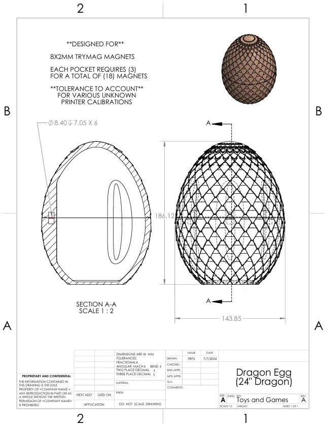 Mình thiết kế quả trứng này như một cách tiếp cận độc đáo cho mẫu trứng Crystal Dragon nổi tiếng. Hầu hết các loại trứng bạn thường thấy đều dùng cơ chế đóng mở cơ học như ren vặn, khớp cài... Nhưng quả trứng này được thiết kế các hốc để gắn nam châm neodymium! Mình có kèm đường dẫn đến file Crystal Dragon gốc (loại dài 24 inch) mà mình dùng để thiết kế mẫu này. Lưu ý rằng khối lượng của mỗi loại crystal dragon có thể khác nhau. Mình cũng đã để link nguồn mua nam châm bên dưới.