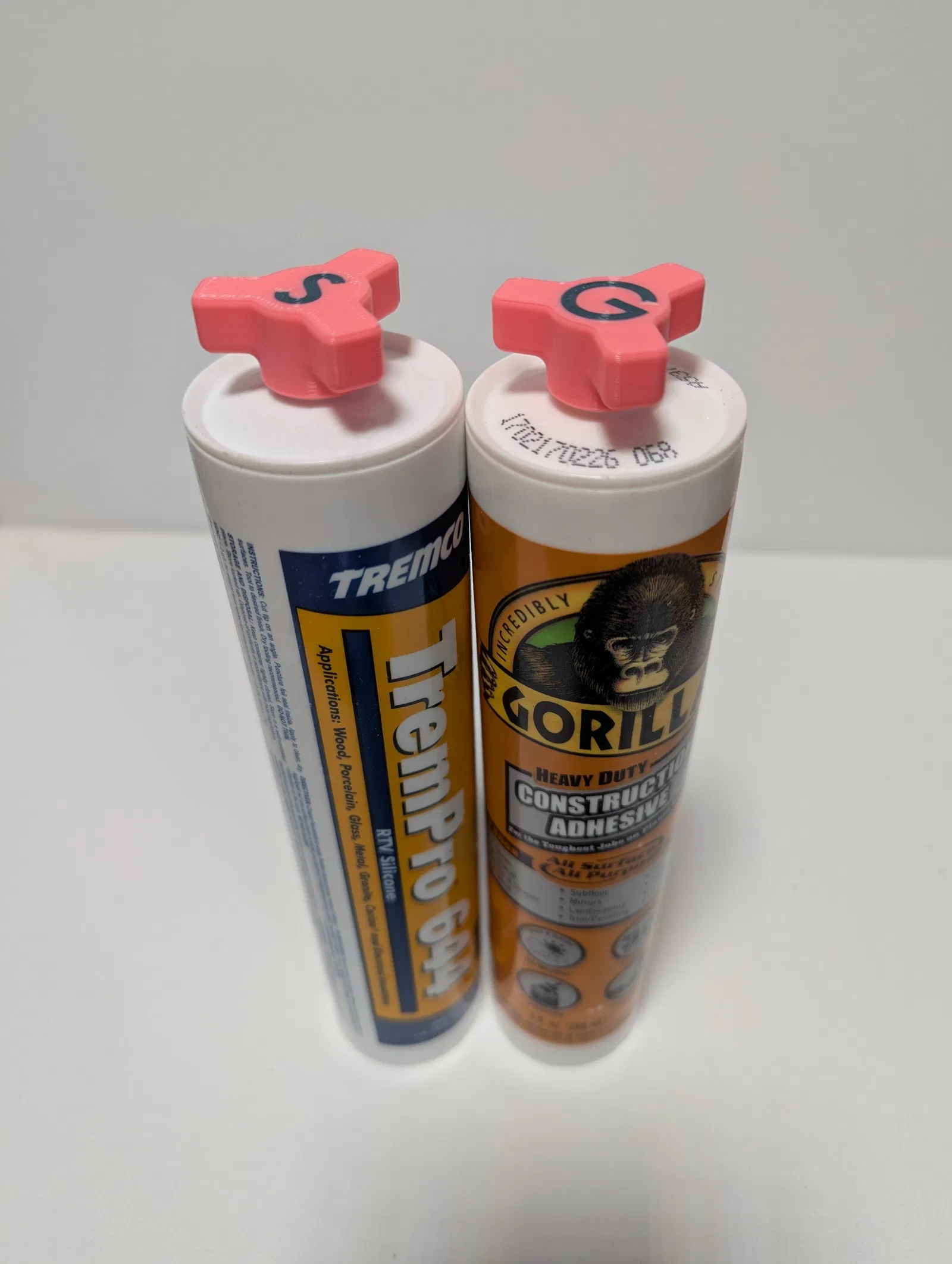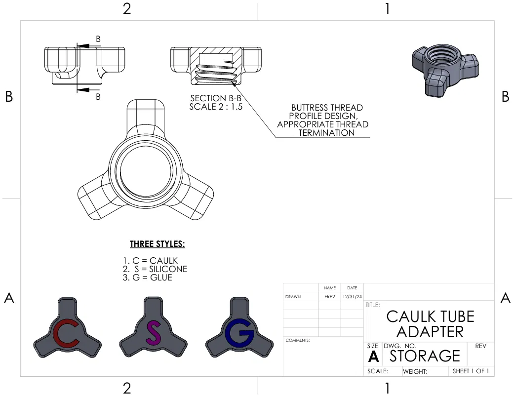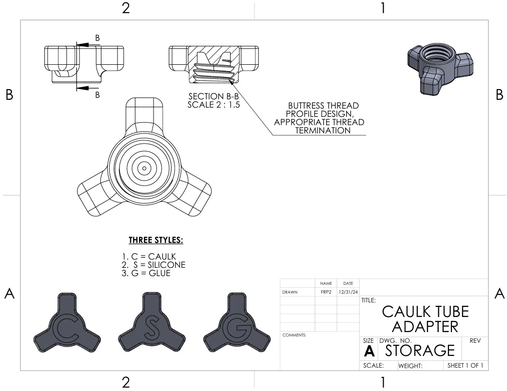 Thiết kế đầu nắp với thông số ren tựa (buttress thread) chuẩn xác, có phần kết thúc ren chỉn chu. Có thể in nhiều màu. Bao gồm các phiên bản đánh dấu cho keo, silicone và chất trám, kèm cập nhật mới có chốt chặn ở giữa.