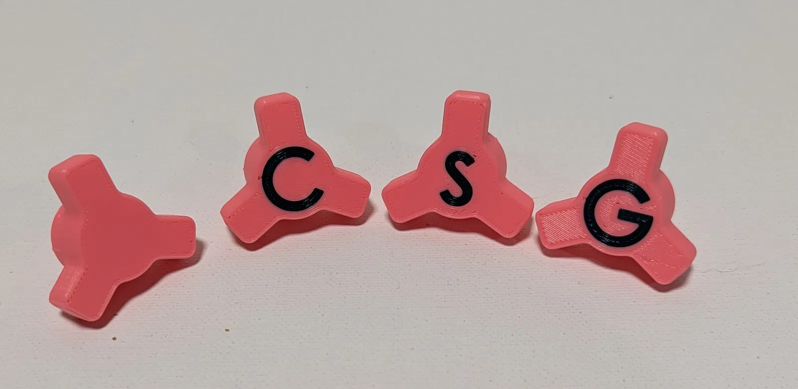 Có sẵn một bản trắng (blank) và ba bản khác có ký tự C, G và S tương ứng cho caulk (keo trám), glue (keo dán) và silicone.