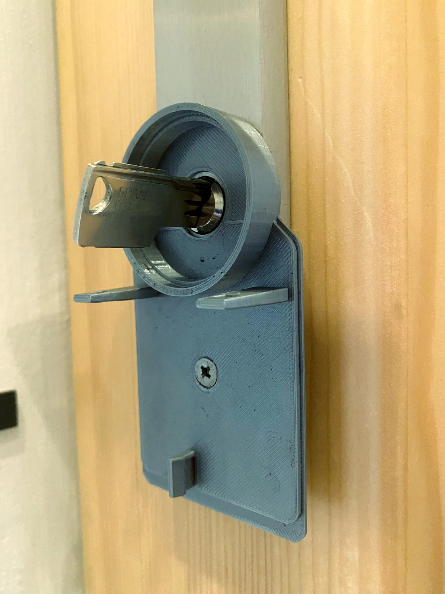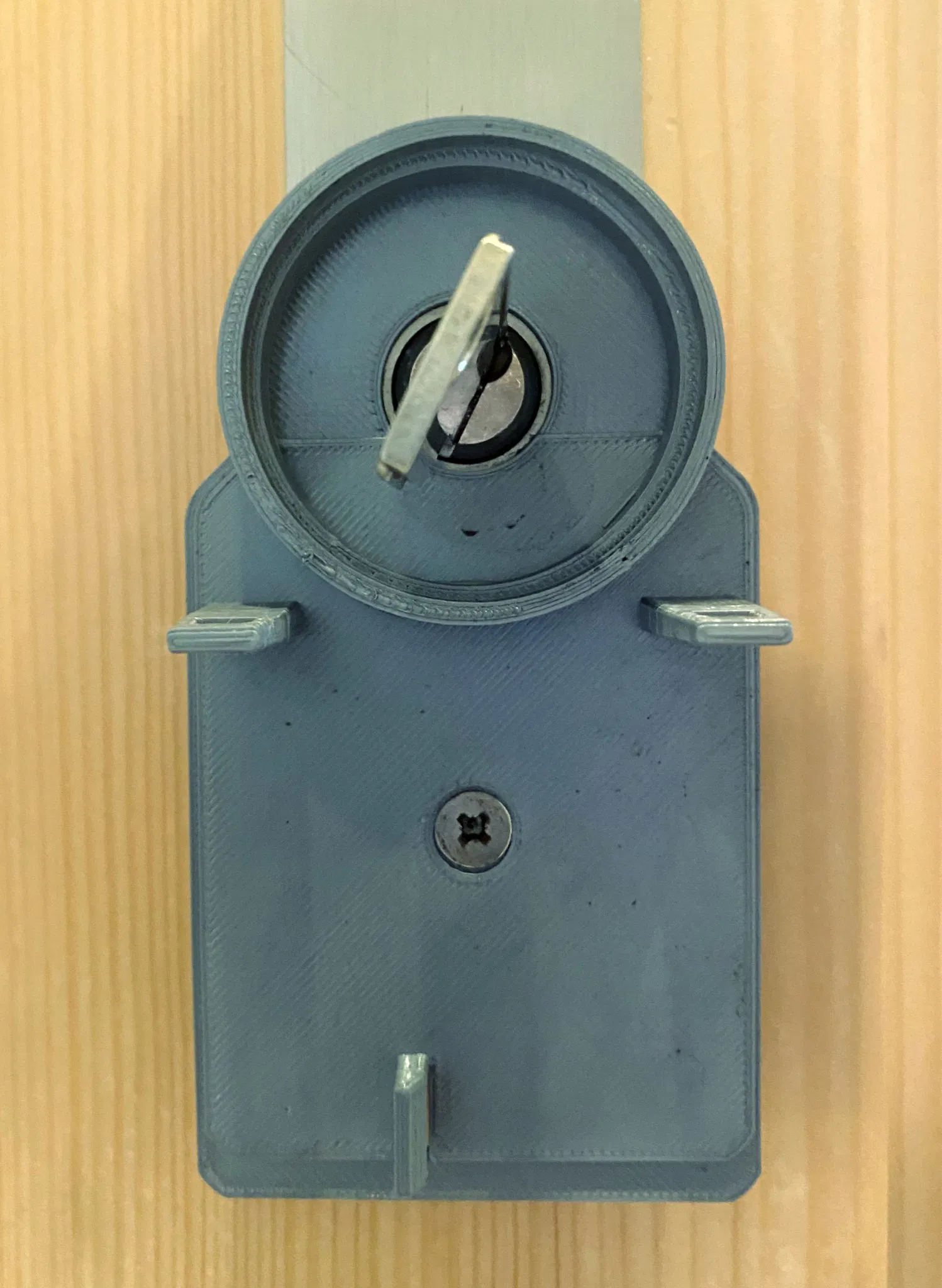 Về cơ bản, nó được gắn vào khóa cửa bằng cách dán nó bằng băng dính 3M ™. Vì băng dính đã bị rời ra, tôi đã thiết kế bộ chuyển đổi này có thể được vặn trực tiếp vào khóa cửa bằng một cái vít.