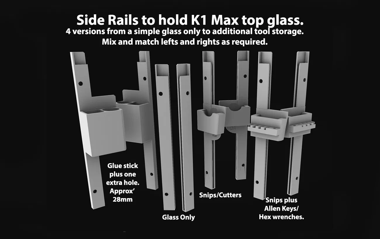 Bộ ray gắn nắp kính cho K1 Max giúp bạn cất giữ tấm kính gọn gàng bên hông máy khi không sử dụng. Thiết kế có kèm tùy chọn khay đựng kìm cắt, keo dán và lục giác rất tiện lợi, chắc chắn và dễ lắp đặt.