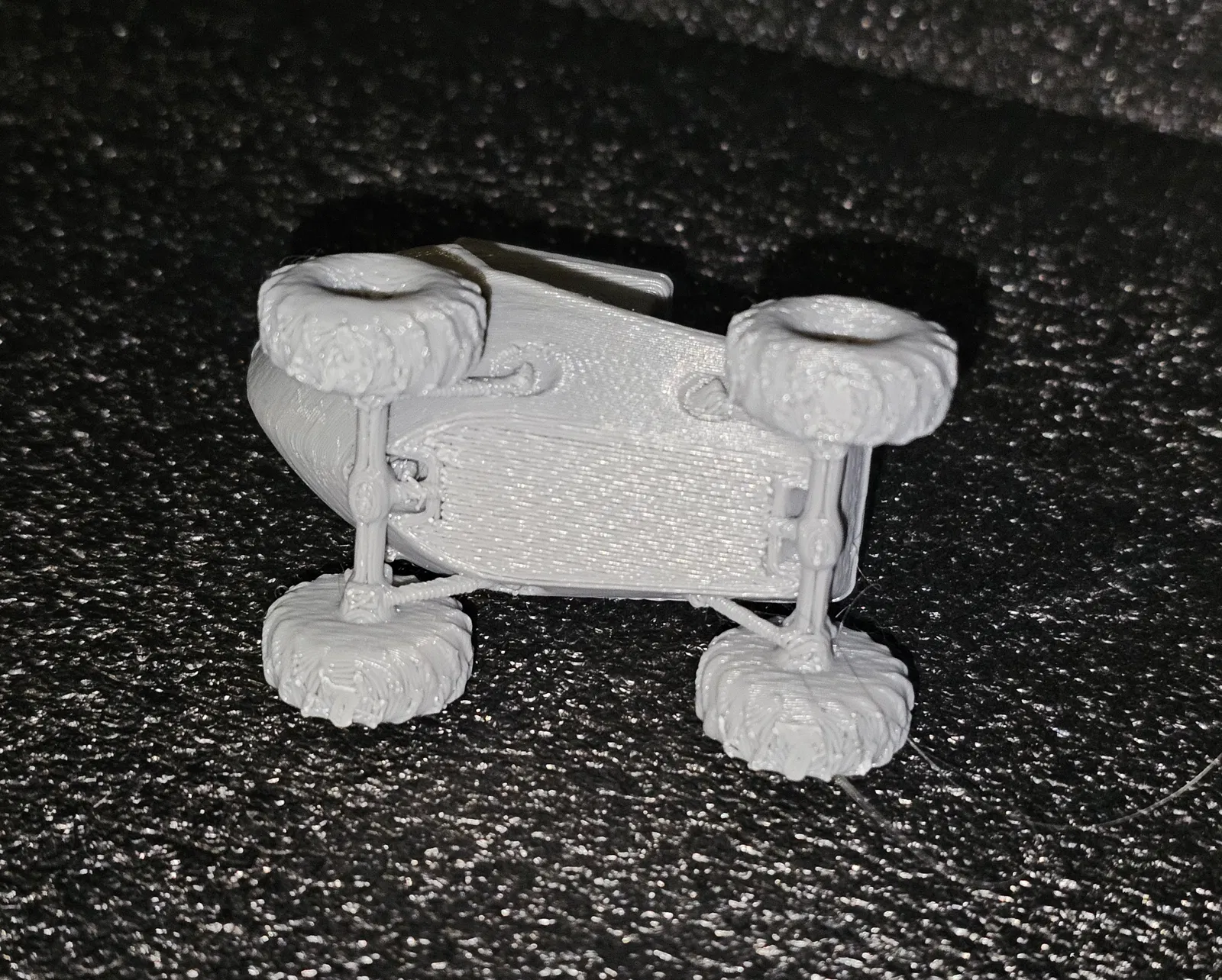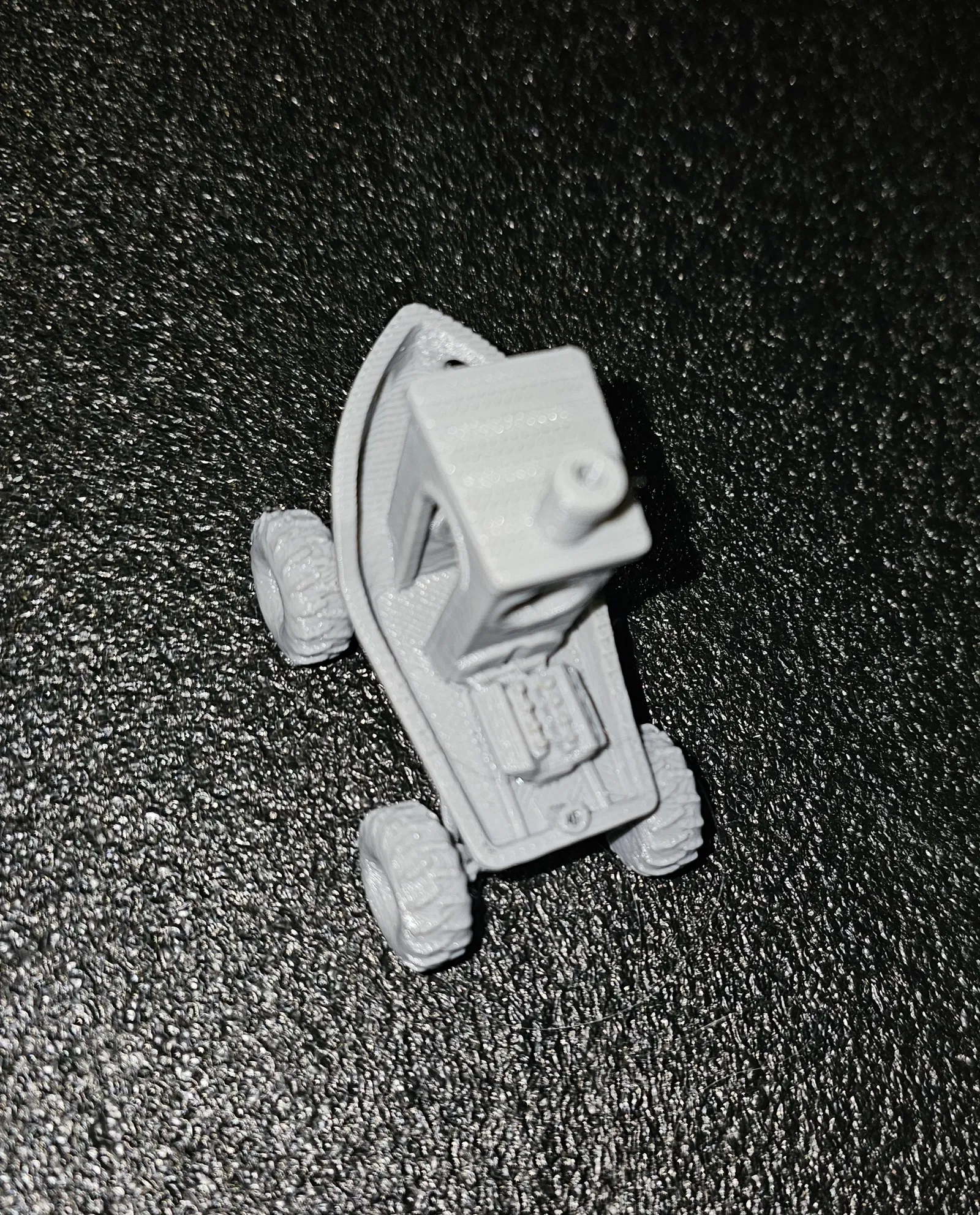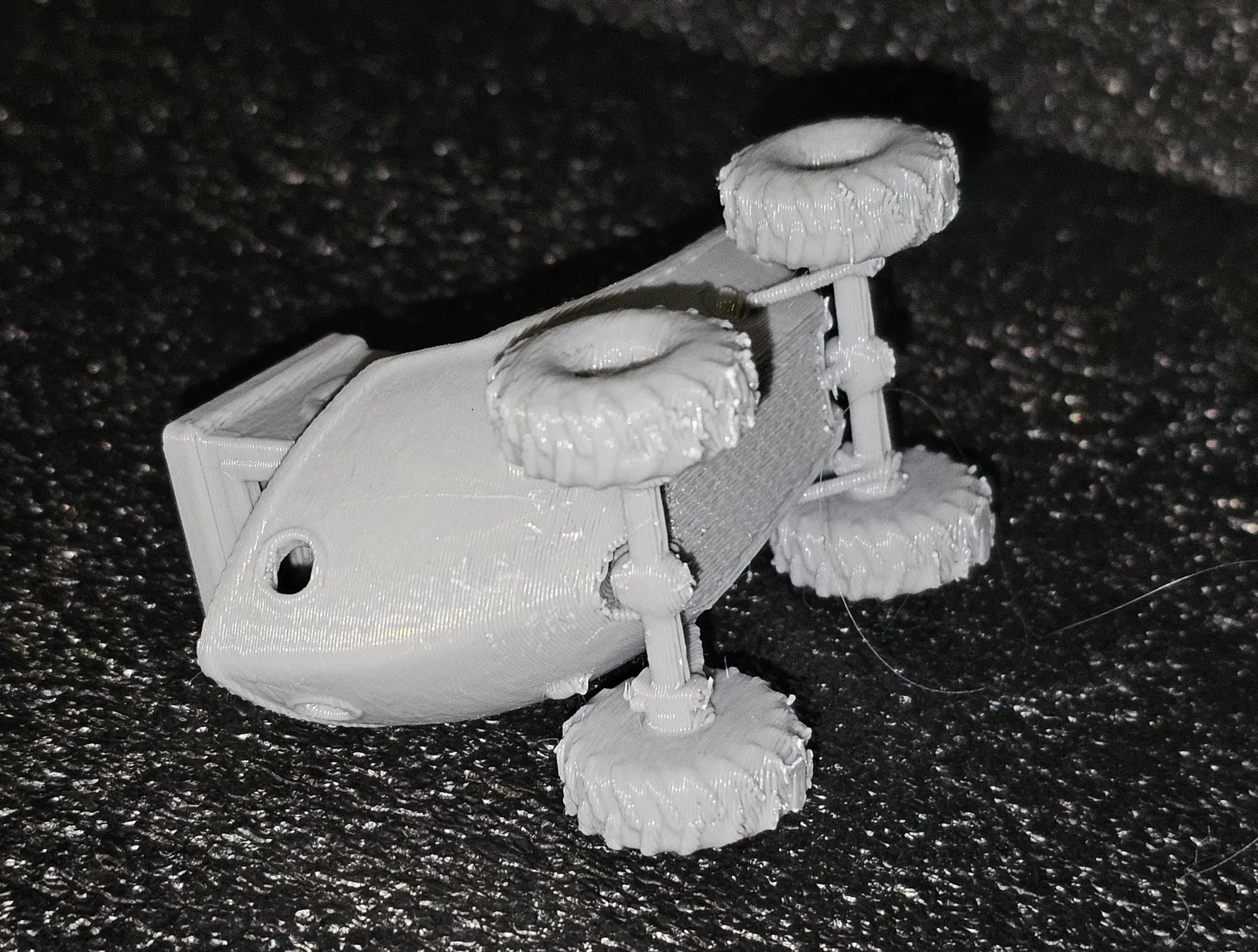 Phiên bản đầu tiên mình làm có bánh xe xoay được, nhưng nó đã rơi khỏi kệ khi mình vô tình va phải và bị vỡ khi chạm sàn. Vì vậy, mình đã thiết kế lại phiên bản mới với bánh xe cố định, đây là một mô hình tĩnh.