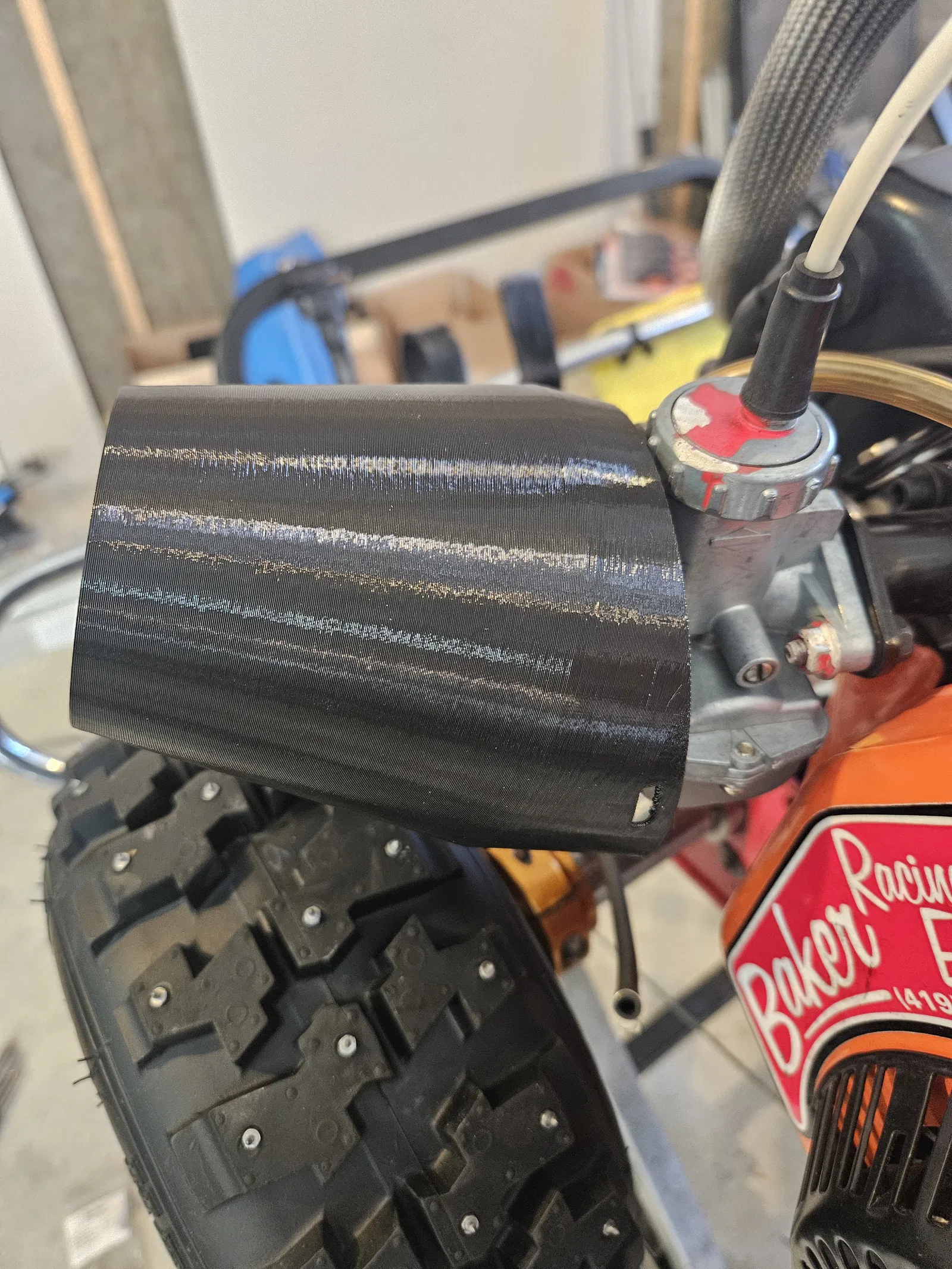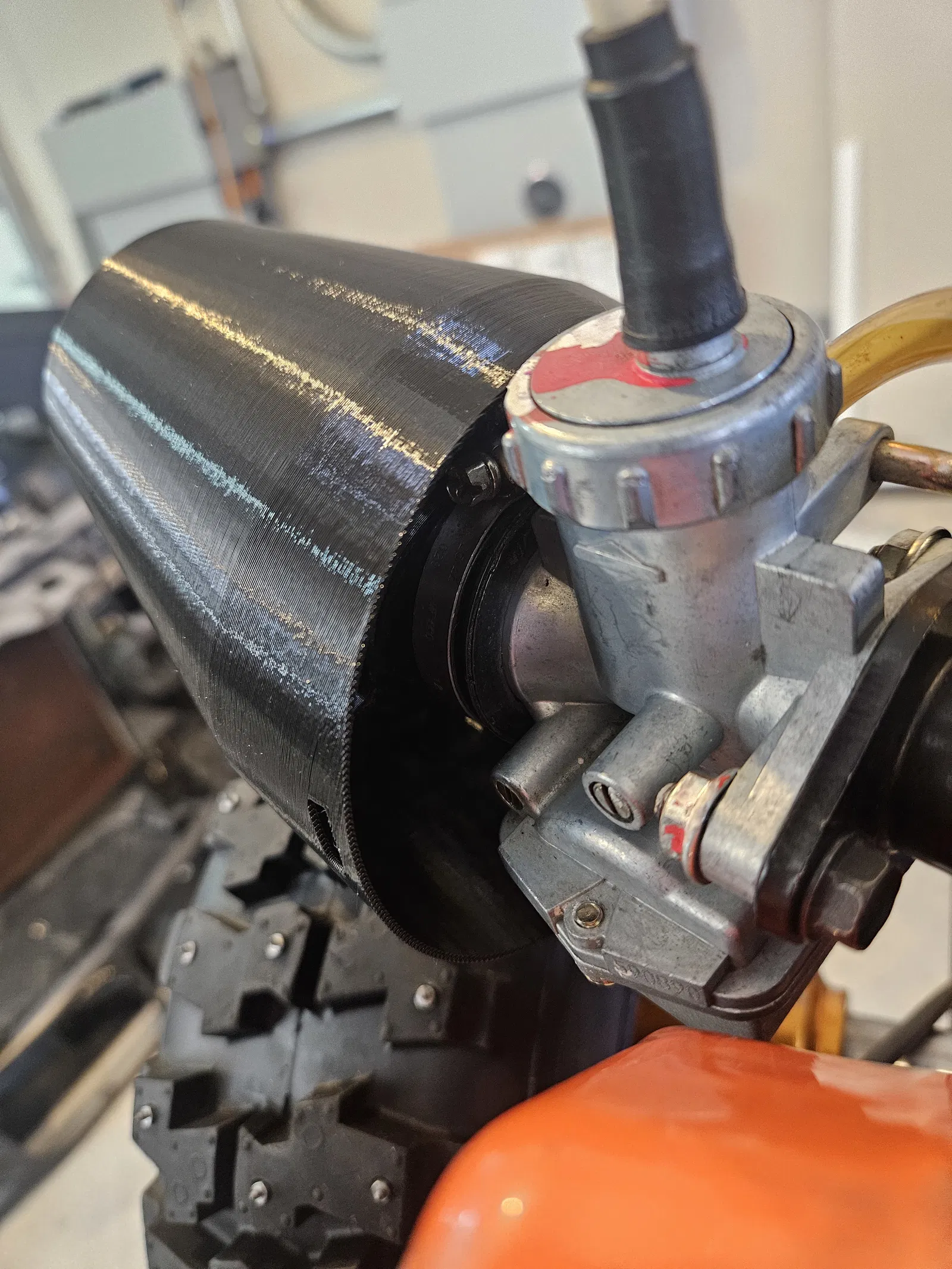 Nắp che mưa cho lọc gió giúp bảo vệ và giữ khô ráo cho bộ lọc khí khi đua xe dưới trời mưa hoặc trên mặt băng. Tôi dùng cái này cho xe kart chạy trên băng của mình và thấy nó hoạt động khá ổn khi in bằng nhựa PETG. Phần vòng đệm trượt vào phía sau lọc gió và phần nắp sẽ khớp vào đó. Nó cũng có các khe để dùng dây rút (zip tie) nhằm đảm bảo chắc chắn hơn nữa. Nếu bạn rành về phần mềm slicer thì có thể xóa luôn logo trên đó nhé.