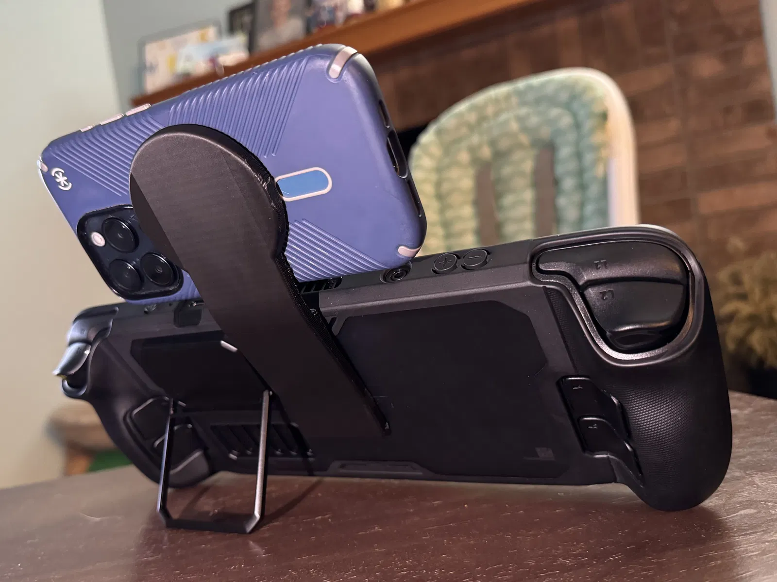 Mẫu thiết kế đế gắn điện thoại tiện lợi dành cho người dùng Steam Deck có ốp JSAUX và điện thoại hỗ trợ MagSafe. Sản phẩm cần in kèm support để đảm bảo độ chính xác.