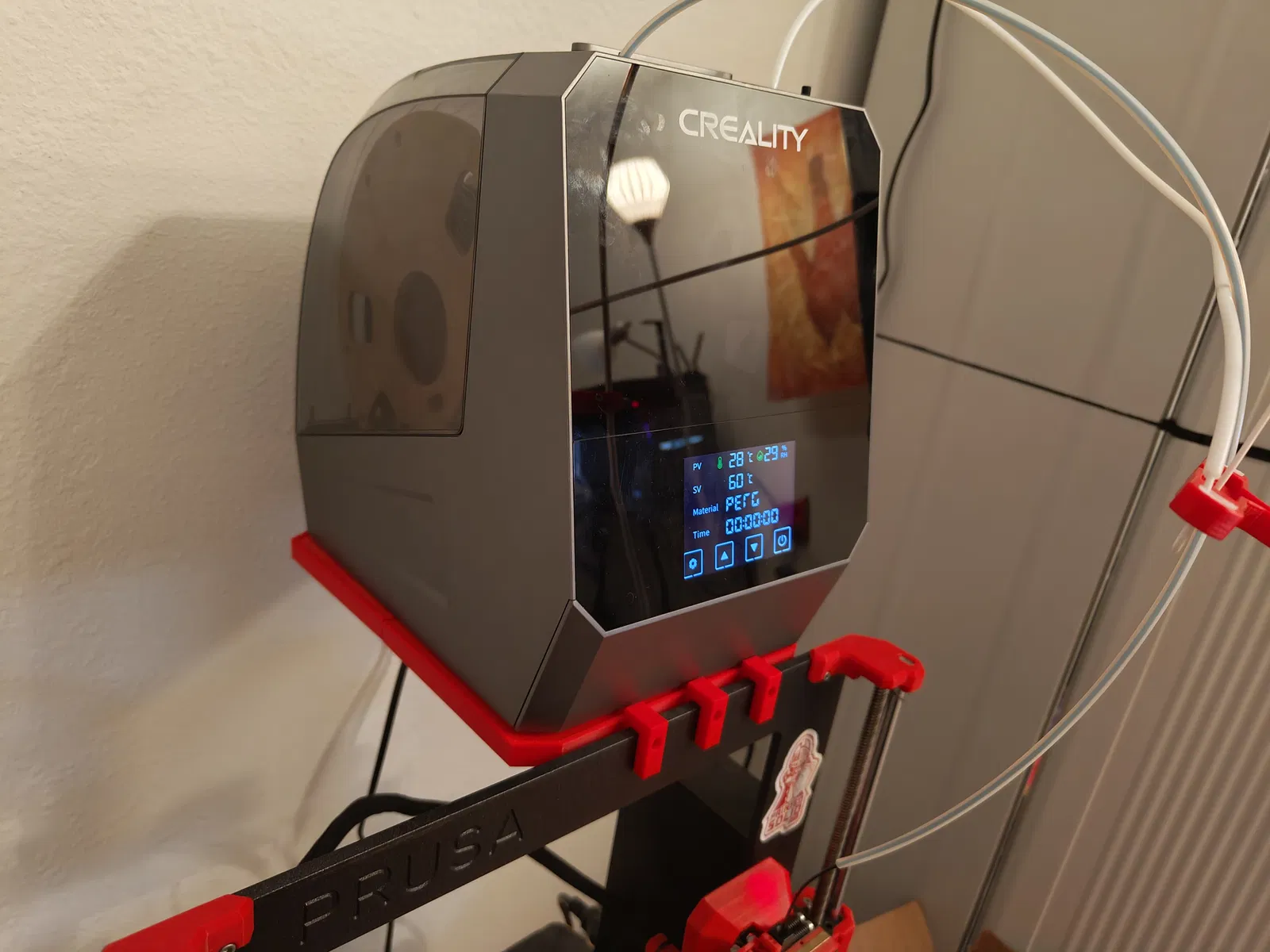 Cái kệ này được thiết kế riêng cho hộp sấy sợi nhựa Creality Space Pi Dual-spool. Nó có thể móc trực tiếp lên khung của máy in Prusa MK3 hoặc MK4.