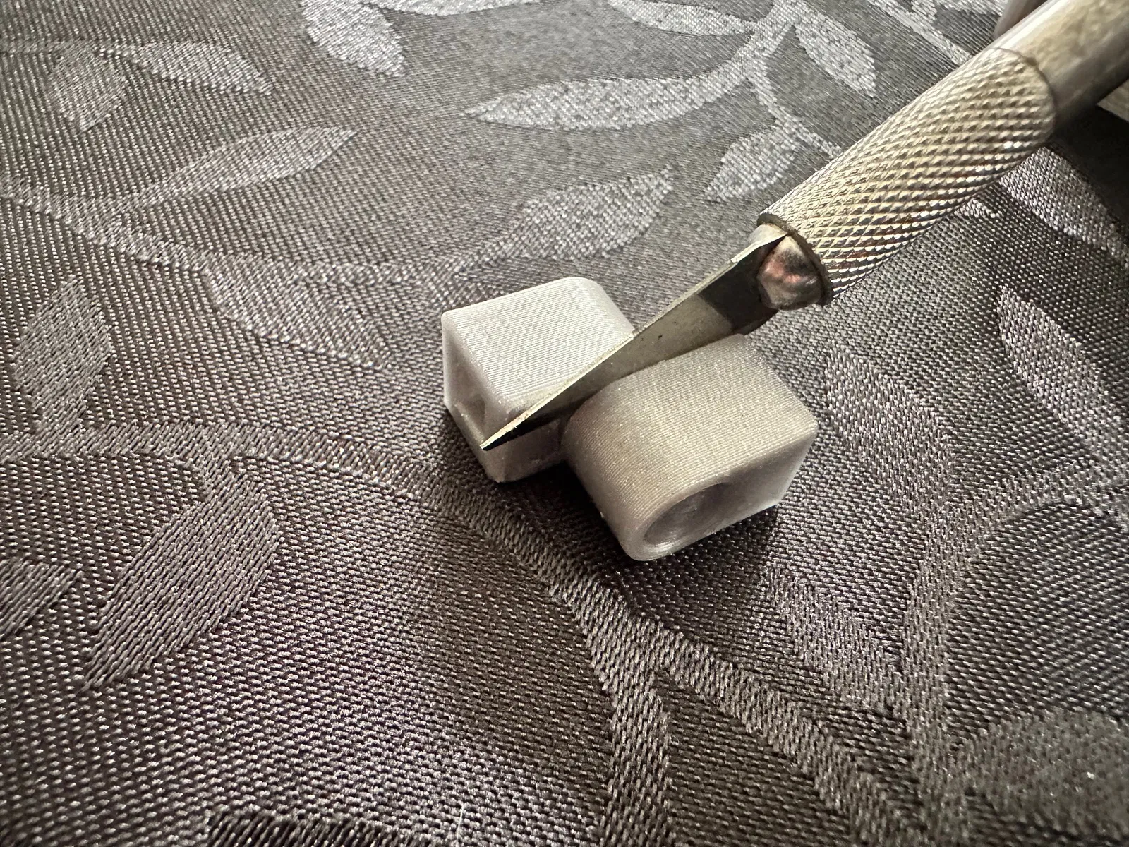 Sau khi in xong, mình dùng một lưỡi dao sắc (thực hiện nhẹ nhàng, xem ảnh minh họa) để tách hai bên của bản lề ra. Bạn chỉ cần tác động một chút lực cho đến khi khớp nối lỏng ra. Nhờ việc thiết kế bản lề nằm ở vị trí 180 độ so với nhau nên công đoạn này giờ đây đơn giản hơn nhiều.