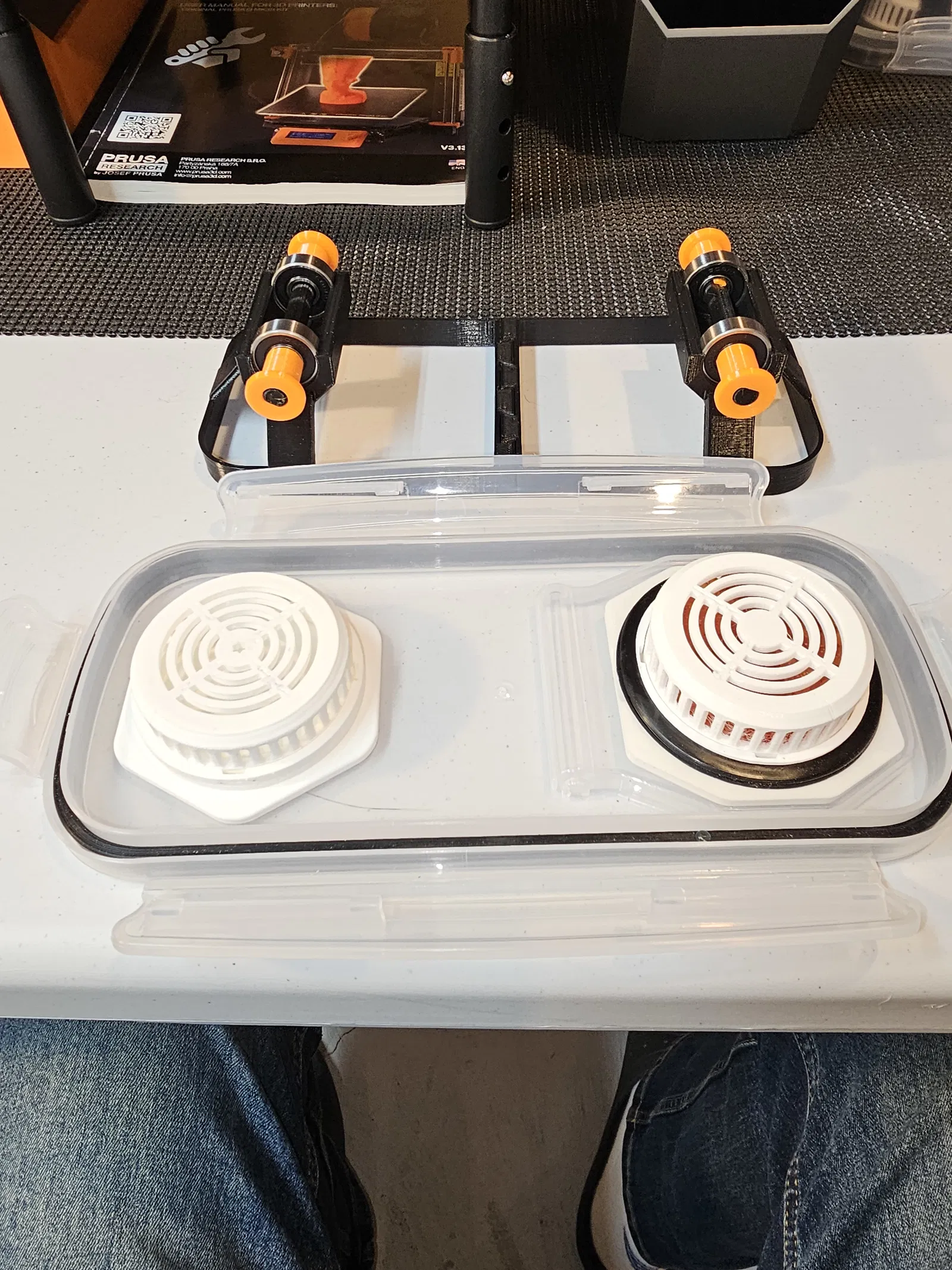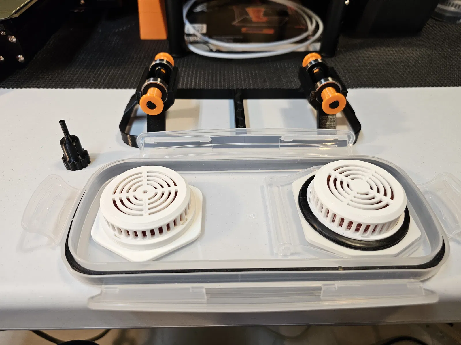 Tận dụng hộp đựng ngũ cốc chuẩn của Amazon giống như thiết kế GunplaMark, mình đã thực hiện một vài thay đổi để cải thiện các thành phần của hộp sấy. Một lưu ý nhỏ về việc tái sử dụng hạt hút ẩm silica gel: theo nhà sản xuất, bạn có thể cho chúng vào lò vi sóng trong 10 phút. Tuy nhiên, thực tế mình đã thử quay khoảng gần 30 phút chia làm các đợt 10 phút mà hạt chỉ đổ mồ hôi chứ không tái hoạt động như mong đợi. Sau đó, mình cho các hạt đã bão hòa độ ẩm vào một cái hũ mở nắp rồi đặt vào máy sấy filament, cài đặt mức nhiệt cao nhất là 70 độ C. Sau 12 tiếng, các hạt đã chuyển lại màu cam ban đầu. Tuy màu cam không còn tươi như mới nhưng vẫn đủ dùng và cho thấy chúng có thể được tái sử dụng.