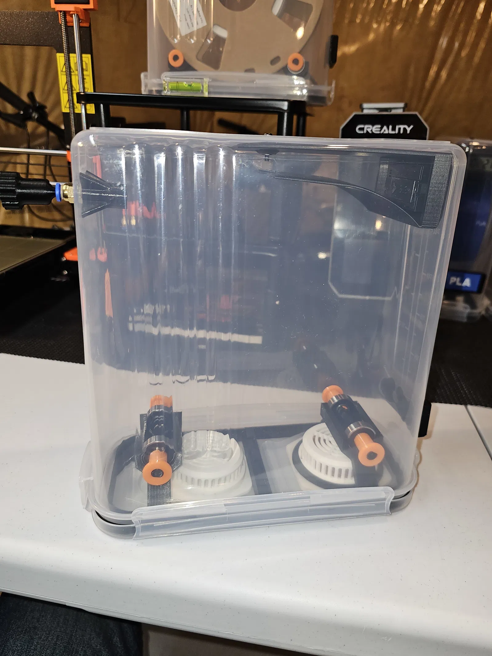 Hộp sấy filament tận dụng từ hộp đựng ngũ cốc tiêu chuẩn của Amazon. Bài viết chia sẻ các cải tiến cho linh kiện và mẹo tái sử dụng hạt hút ẩm silica gel bằng máy sấy filament ở nhiệt độ 70 độ C cực kỳ hiệu quả.