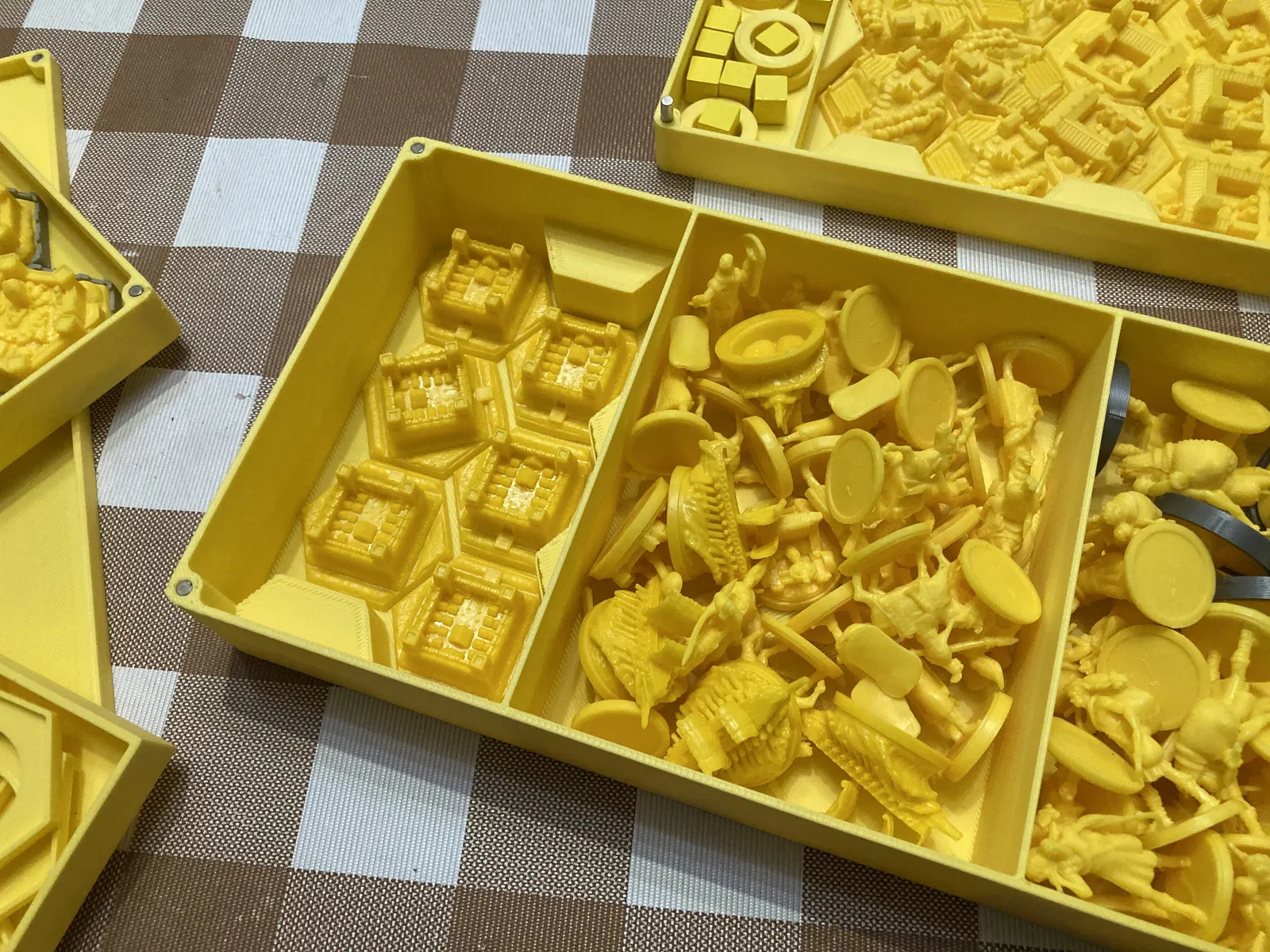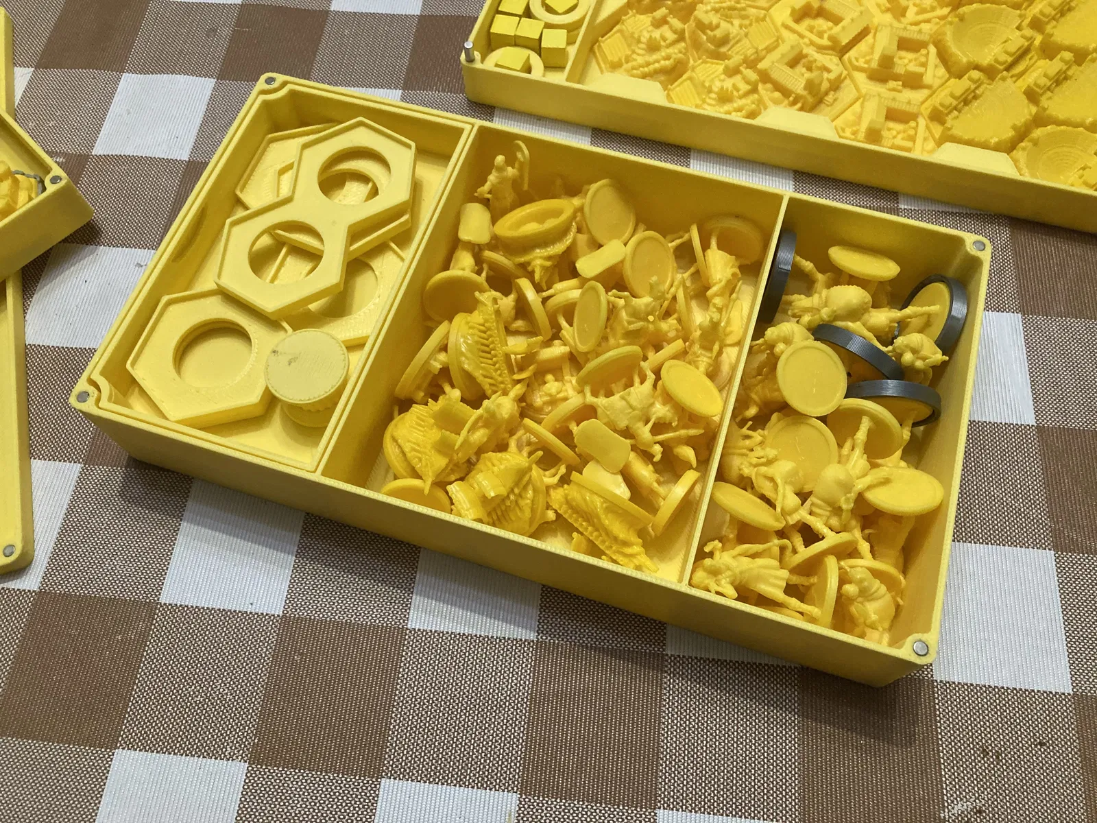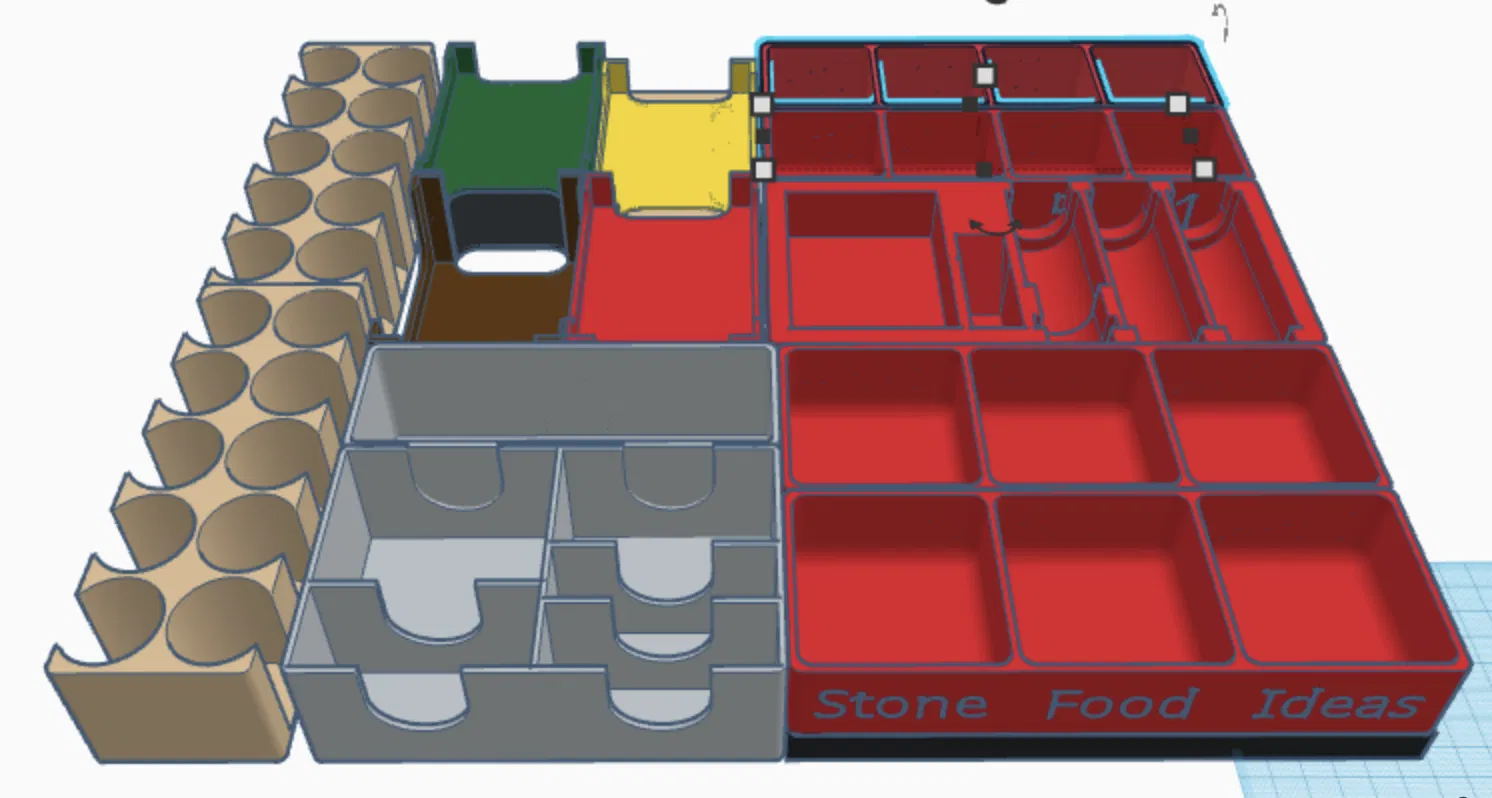 Các bản dựng 3D minh họa cách sắp xếp (để bảng người chơi bên dưới khay tài nguyên/tiền). Giống như trong ảnh, tôi in khay đựng bài và khay người chơi theo màu tương ứng.