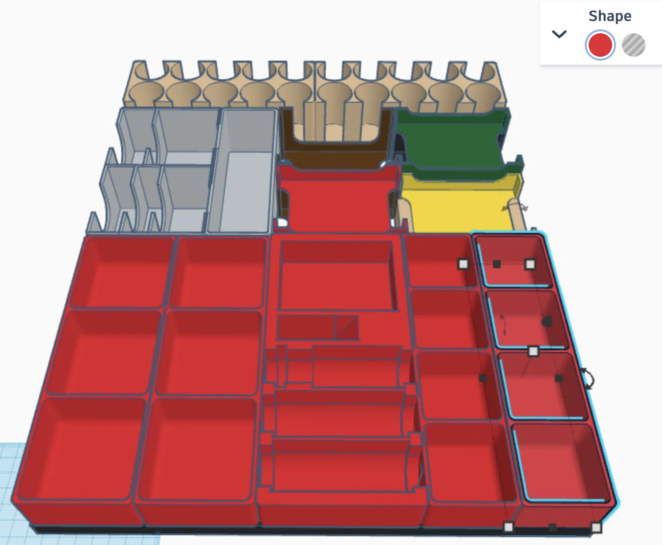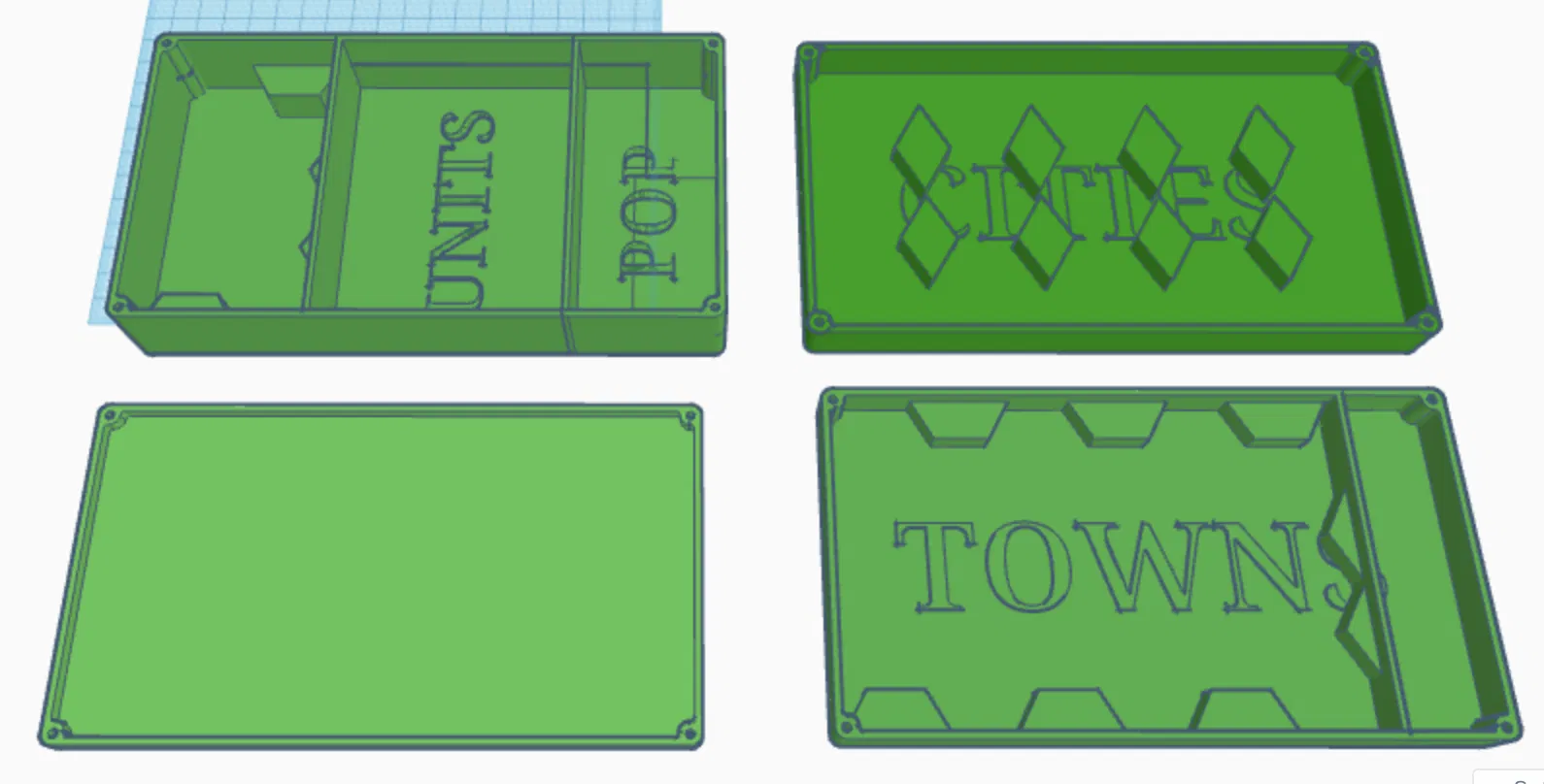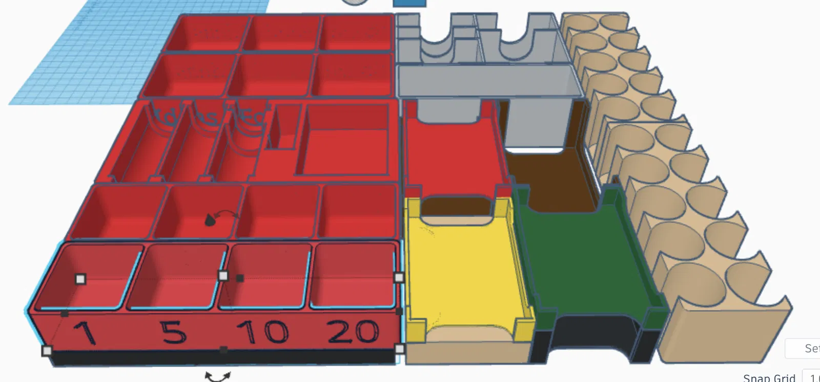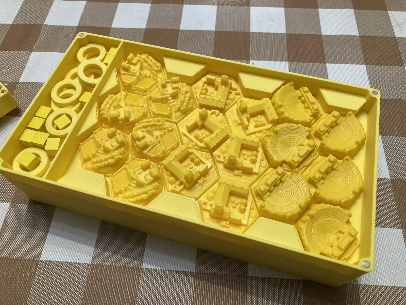 Các bản dựng 3D minh họa cách sắp xếp (để bảng người chơi bên dưới khay tài nguyên/tiền). Giống như trong ảnh, tôi in khay đựng bài và khay người chơi theo màu tương ứng.