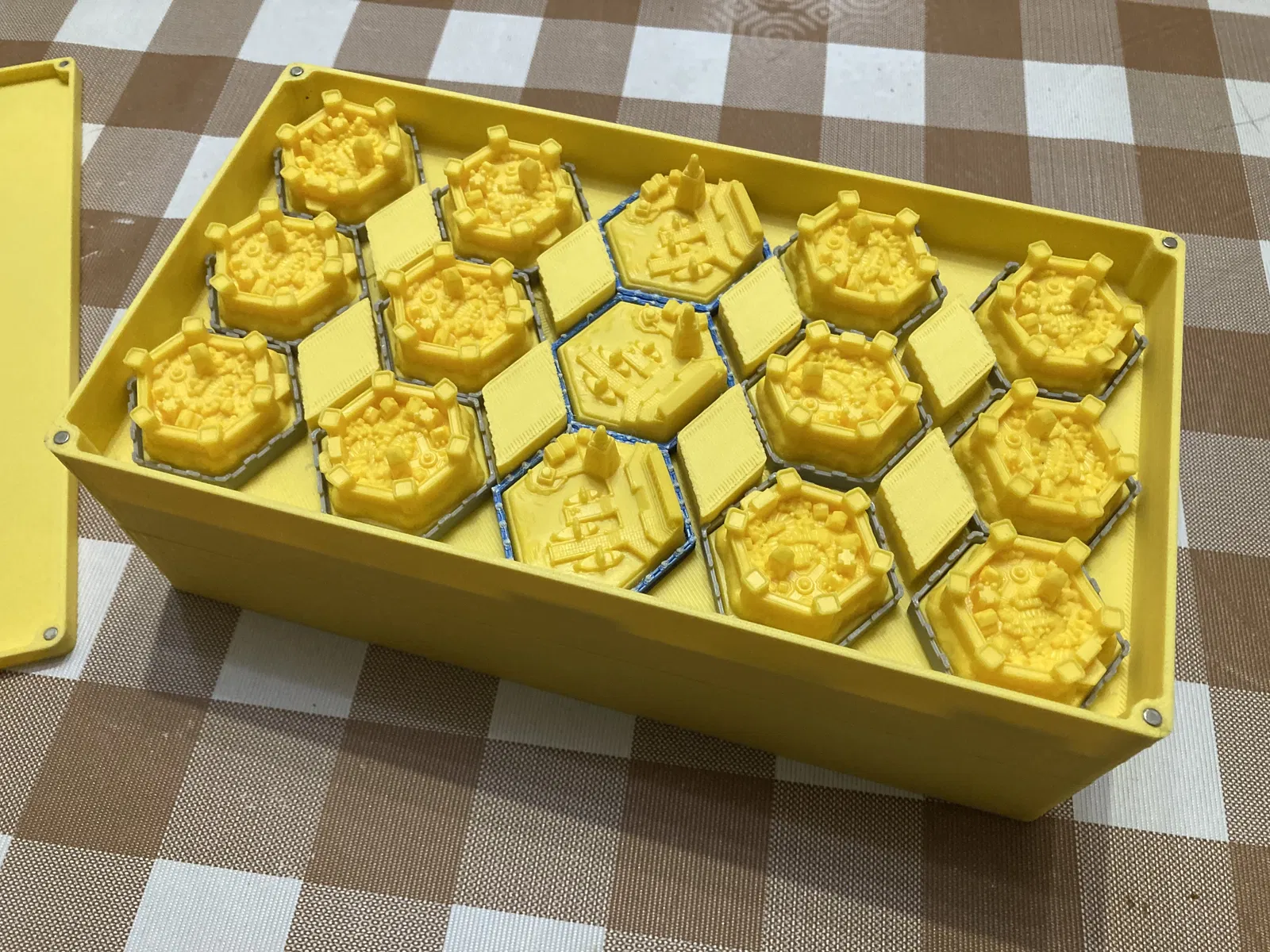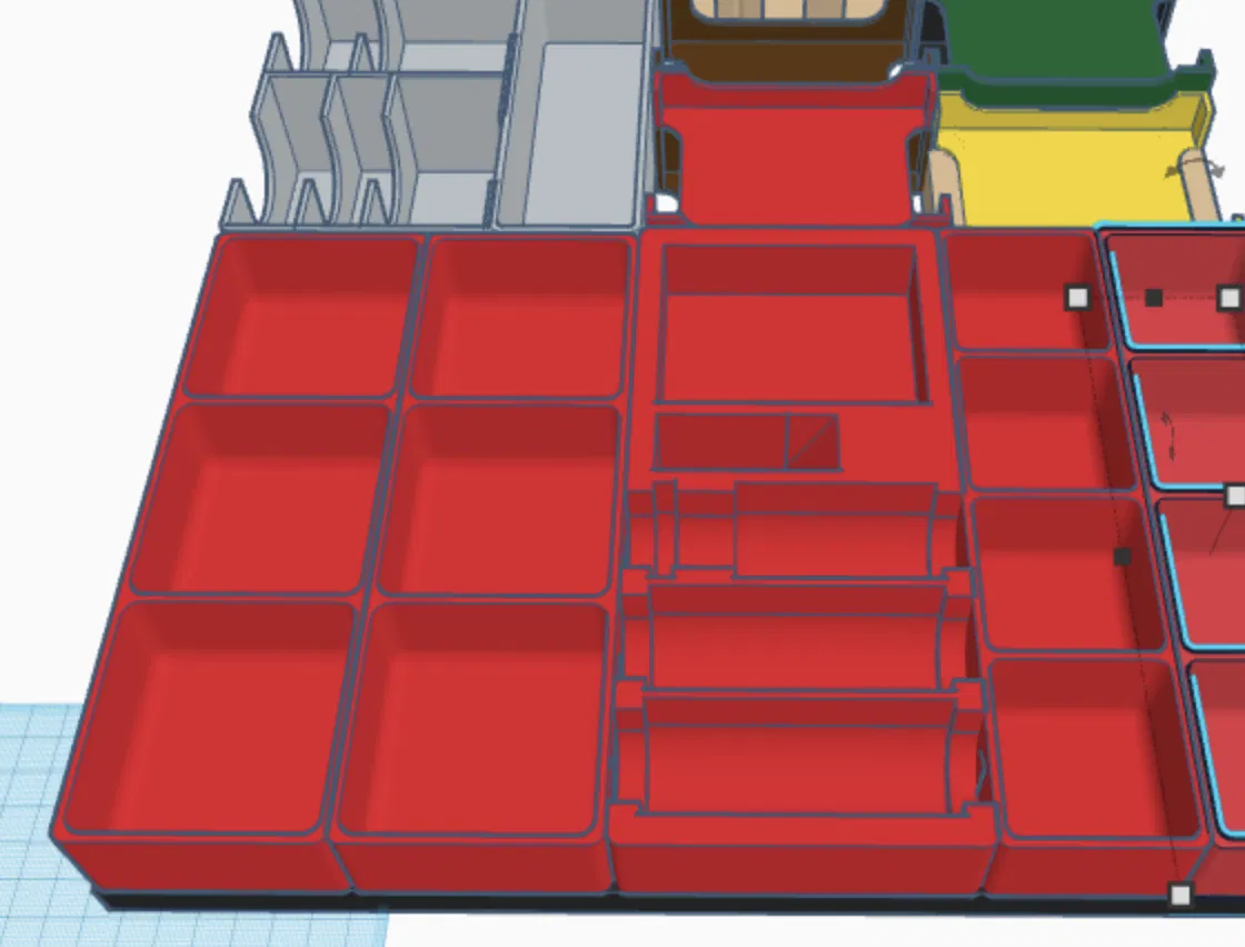 Các khay người chơi có khe để gắn nam châm neodymium 6mm (đường kính 3mm), giúp cố định khay khi di chuyển. Chúng được thiết kế để vừa với các phụ kiện như chân đế cảng, chân đế kỳ quan và vòng tài nguyên XL mà tôi bán trên Etsy, đồng thời bảo vệ các mô hình đã sơn. Một điều làm tôi hơi tiếc là không thể làm thêm không gian để tách riêng các loại quân sự, nhưng diện tích trong hộp có hạn. Nếu các bạn yêu cầu nhiều, tôi có thể làm thêm một phiên bản khay khác cho những người không dùng bảng XL để chứa mô hình tốt hơn.