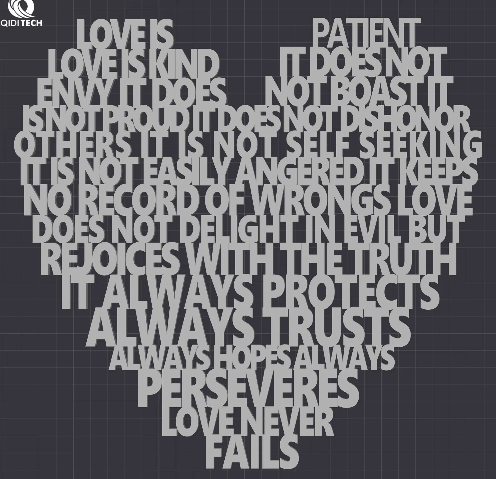 Tình yêu thương hay nhẫn nhịn; tình yêu thương hay nhân từ; tình yêu thương không ghen tị, không khoe mình, không lên mình kiêu ngạo, không làm điều trái phép, không tư lợi, không nóng giận, chẳng nghi ngờ sự dữ, không vui về điều không công bình, nhưng vui trong lẽ thật. Tình yêu thương hay dung thứ mọi sự, tin mọi sự, trông cậy mọi sự, nín chịu mọi sự.
