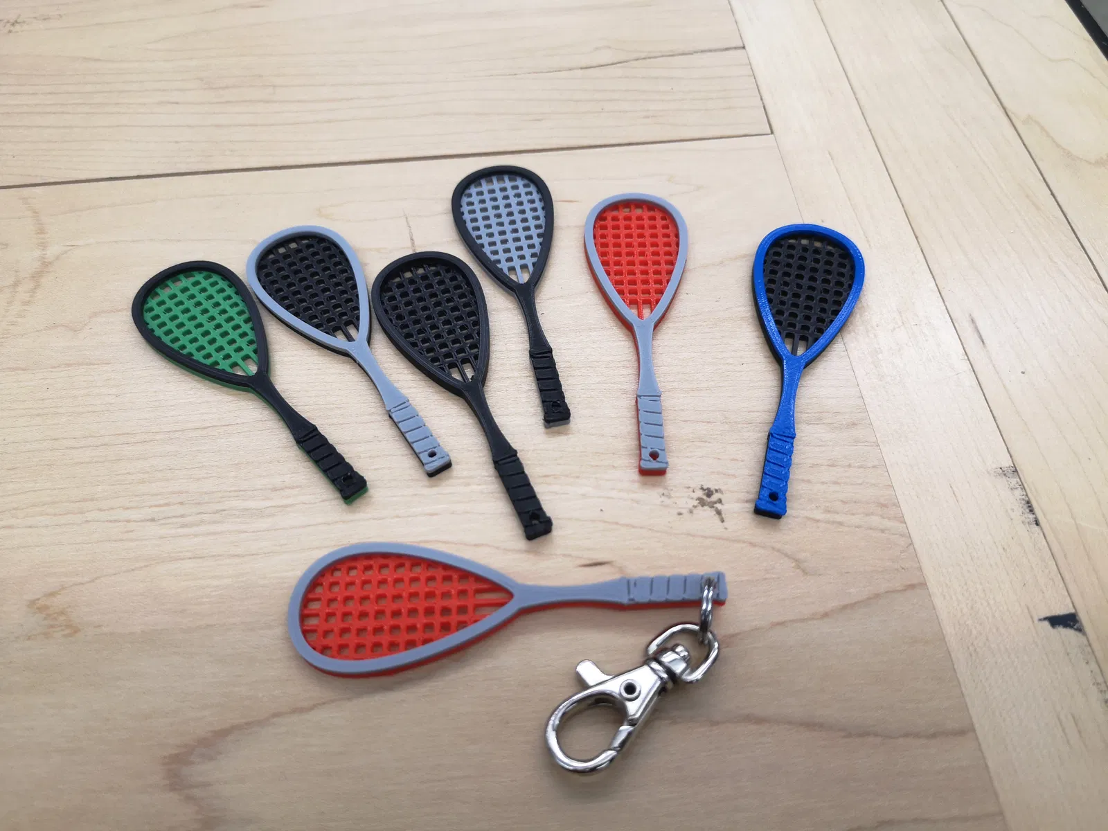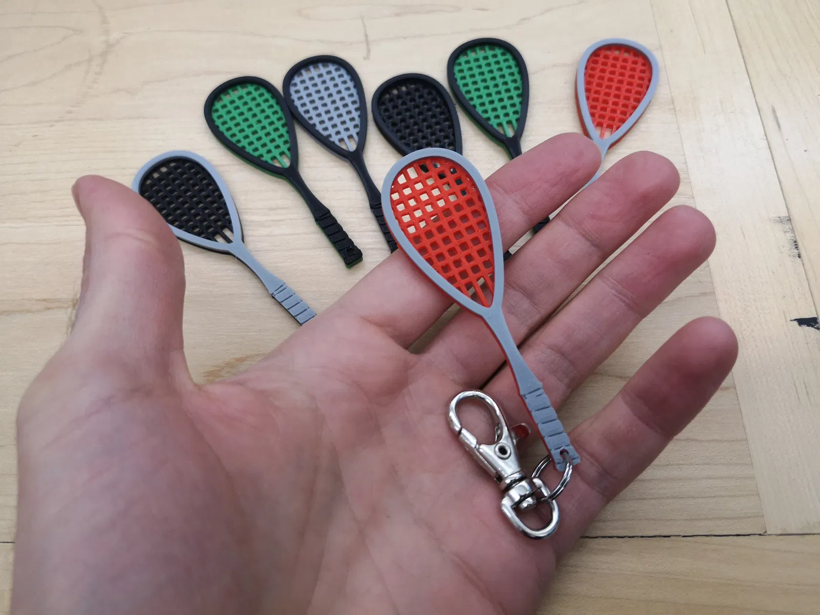 Tỉ lệ của mô hình được lấy cảm hứng từ cây vợt Tecnifibre Carboflex Cannonball 125. Lỗ xỏ móc khóa có đường kính 2.4 mm. Nếu bạn muốn in 2 màu bằng máy in một đầu phun, bạn có thể tìm thấy các phiên bản mô hình đã được tách rời thành phần "bottom + strings" (đế + dây) và "top" (phần trên) tại đây. Ngoài ra, đối với các loại máy in 2 đầu phun, mình đã đính kèm các file mô hình có phần dây và phần khung vợt tách biệt. Tất cả các file đều có sẵn tùy chọn có hoặc không có lỗ xỏ móc khóa.