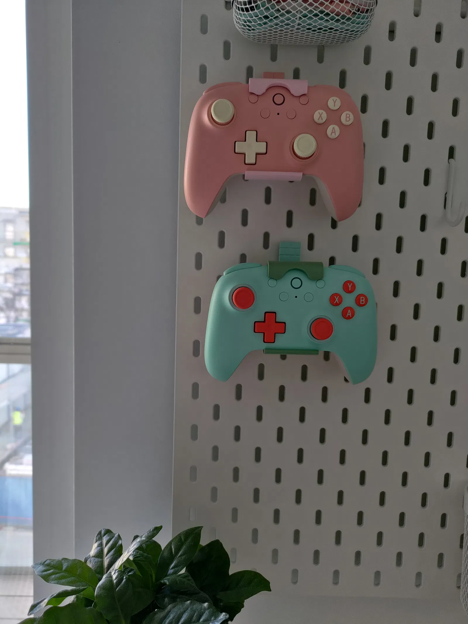 Mẫu giá treo IKEA Skadis tiện lợi giúp bạn cất giữ cả tay cầm chơi game 8BitDo Ultimate 2C và đầu thu 2.4GHz gọn gàng ngay trên bảng treo của mình.