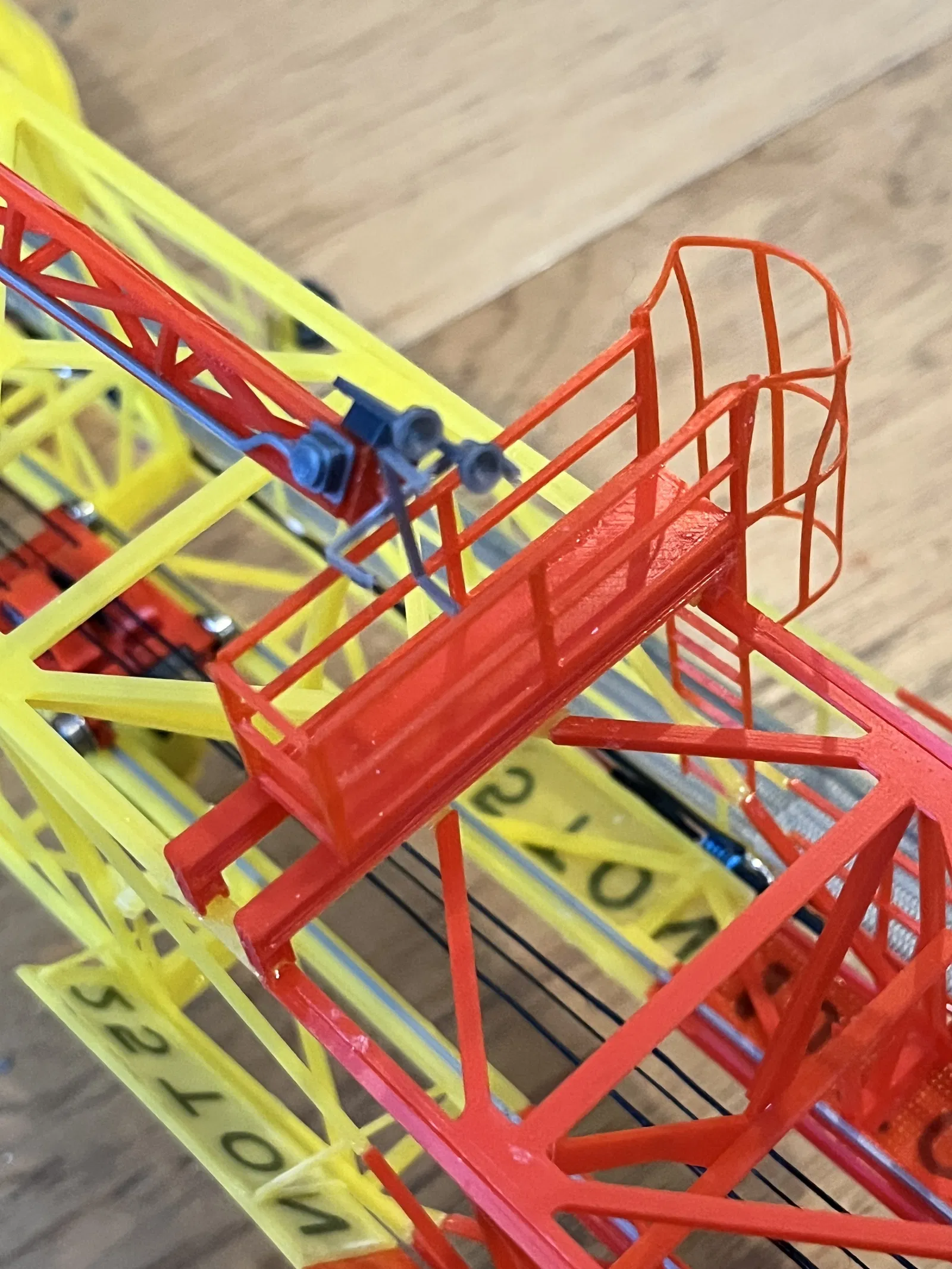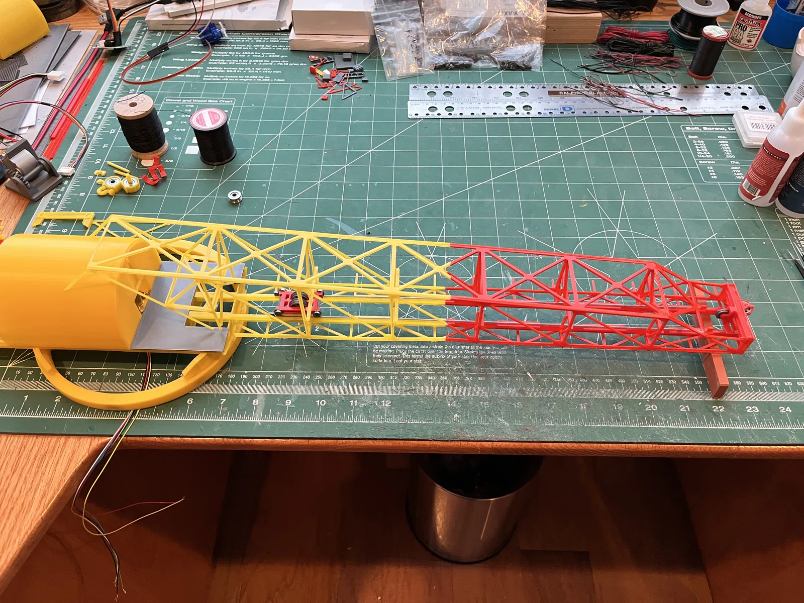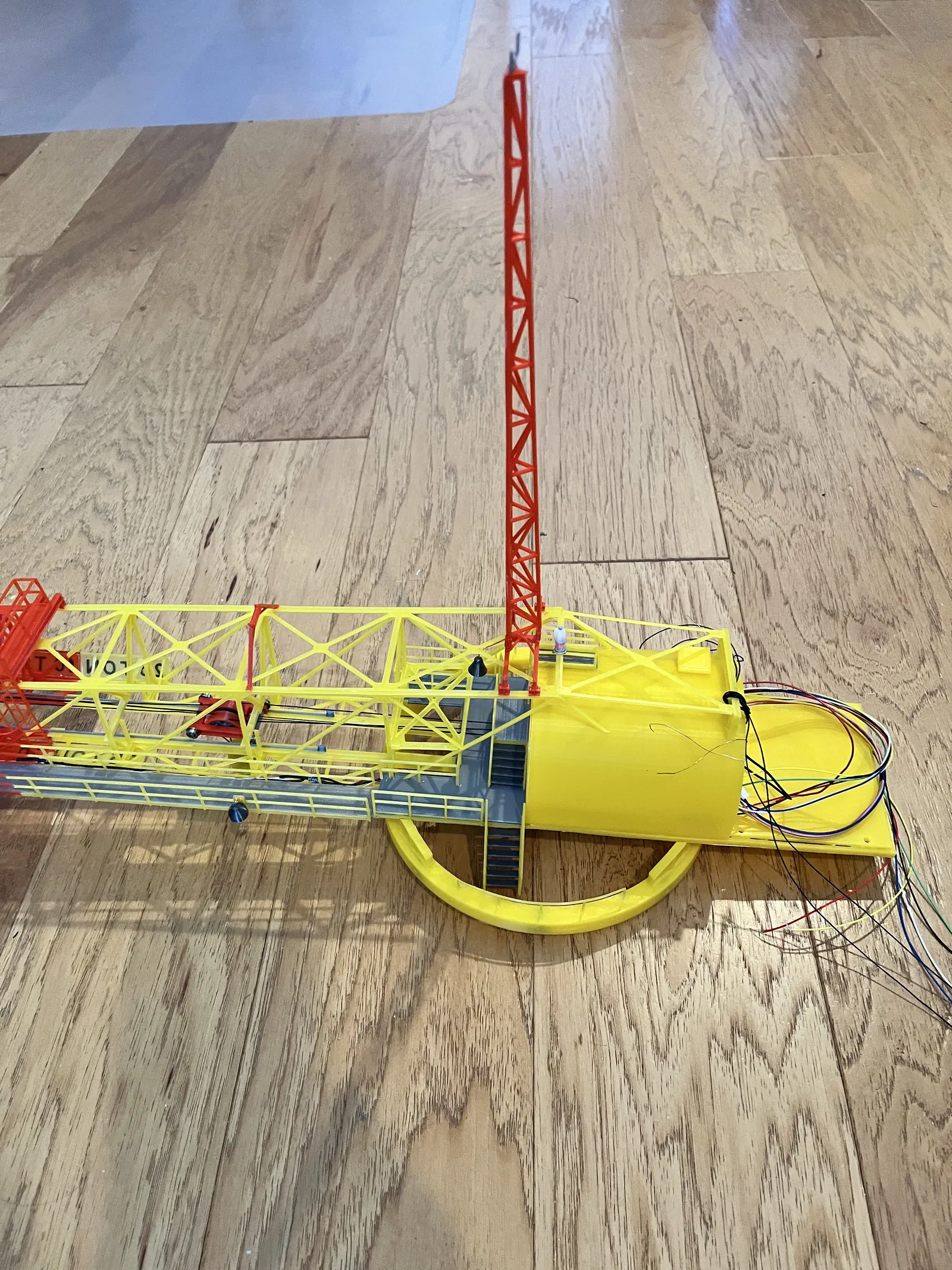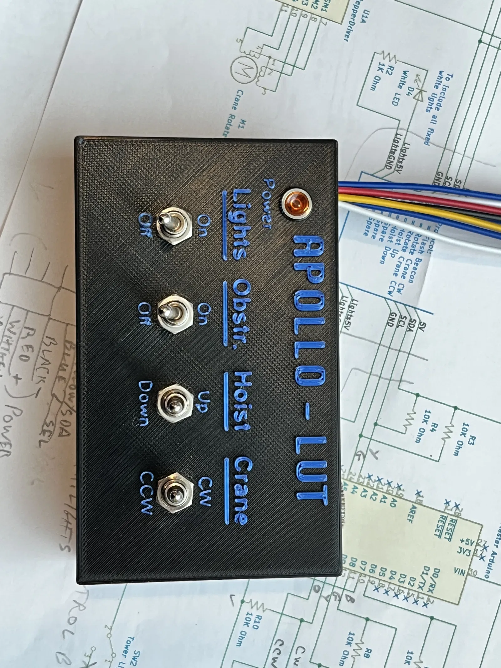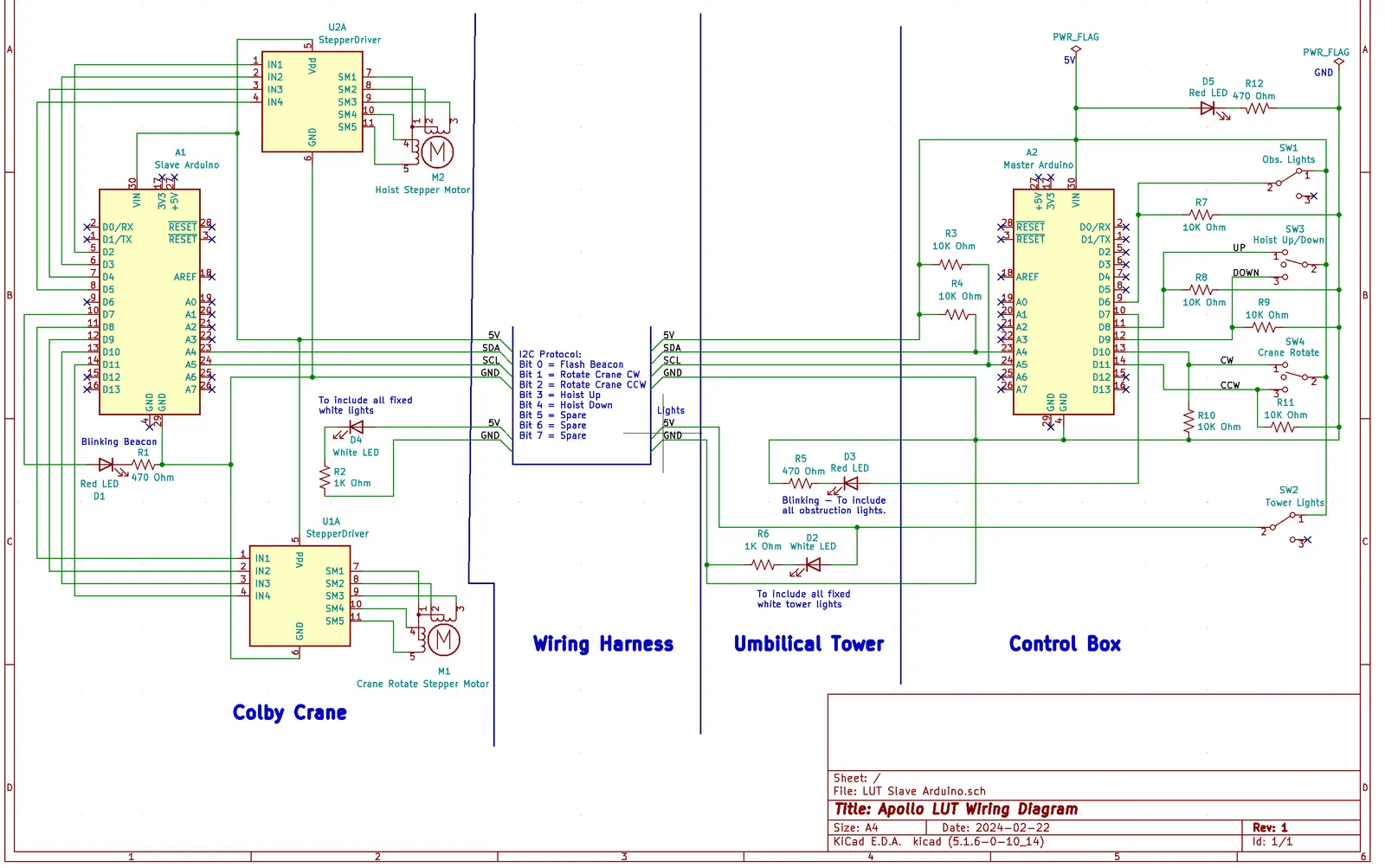 Mô hình này là cần cẩu Colby gắn trên đỉnh tháp phóng Apollo Umbilical Tower (LUT). Đây là một phần của bộ mô hình tháp Apollo Umbilical Tower lớn hơn. Mô hình này được thiết kế để có thể tự động hóa bằng hai động cơ bước (stepper motors) và hai bo mạch Arduino Nano Every. Nếu không muốn tự động hóa cần cẩu, anh em có thể bỏ qua phần động cơ, nhưng mình khuyên là nên cân nhắc thêm đèn, vì phần này sẽ cần vòng trượt (slip ring). Để đèn hiệu nhấp nháy cùng với các đèn cảnh báo vật cản khác, anh em sẽ cần bổ sung thêm hai bo mạch Arduino.