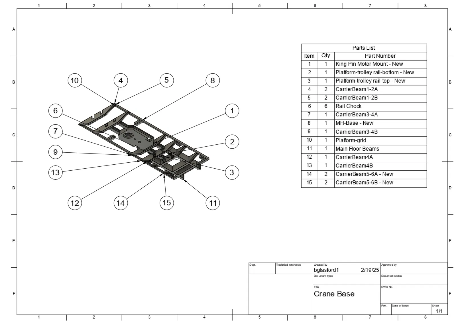 19/02/2025: Thêm tệp STL cho phần Đế cần cẩu (Crane Base) hiển thị vị trí các bộ phận và bản vẽ tên các chi tiết. Thêm phần Tổng quan về Đế cần cẩu và Vỏ bọc máy móc. Đã sửa đổi MainFloorBeams, tách CarrierBeam3-4A&B và sửa lại SmallFloorBeams.