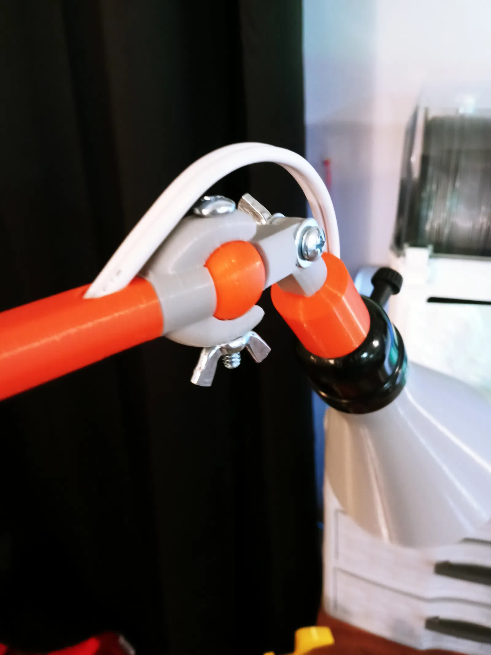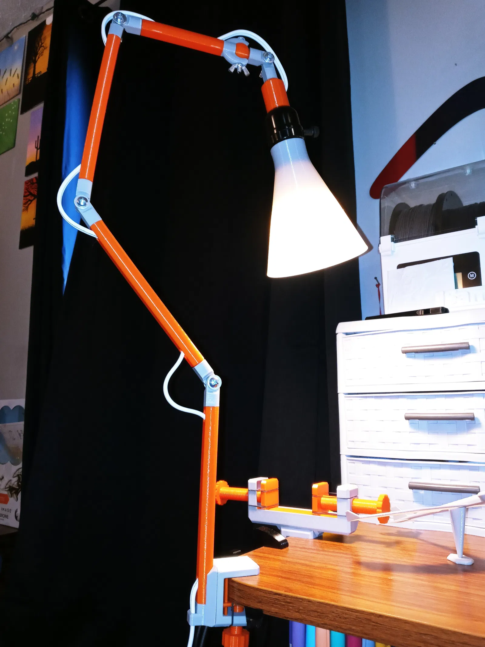 Đây là mẫu đèn đơn giản mà mình tự thiết kế cho bàn làm việc, kết hợp với phần C-Clamp của mình. Đèn có 4 khớp khuỷu tay và 1 khớp cầu, giúp bạn dễ dàng điều chỉnh hướng sáng sang trái hoặc phải chứ không chỉ lên xuống. Tất cả các chi tiết đều đã được đặt đúng vị trí để in ấn. Cần rất ít support, các bác xem chi tiết bên dưới nhé. Phần chụp đèn được thiết kế khá khít, nên các bác nhớ chỉ dùng bóng đèn LED thôi nha. Tuyệt đối không dùng bóng đèn sợi đốt vì nhiệt độ cao có thể làm chảy nhựa hoặc gây hỏa hoạn.