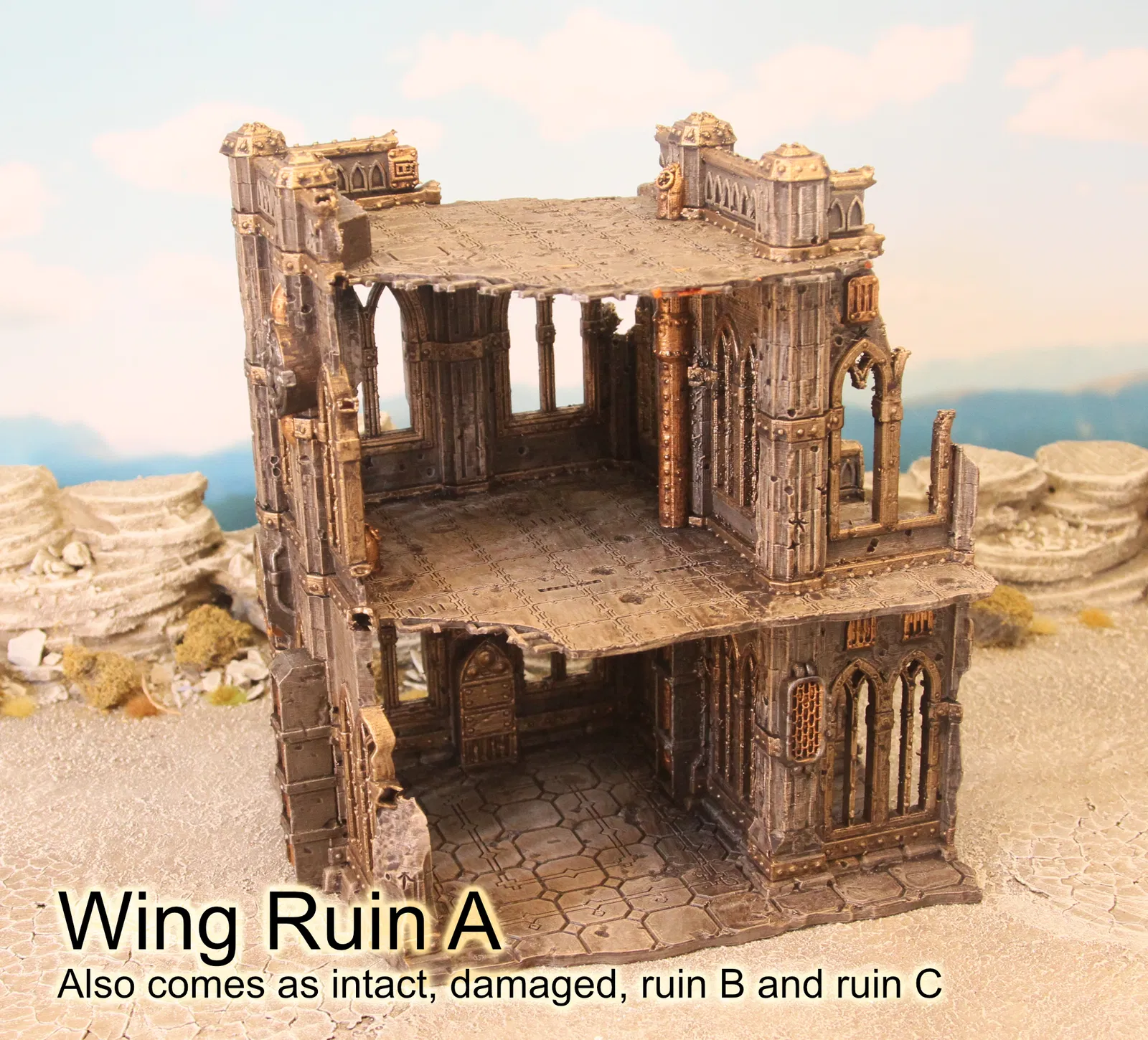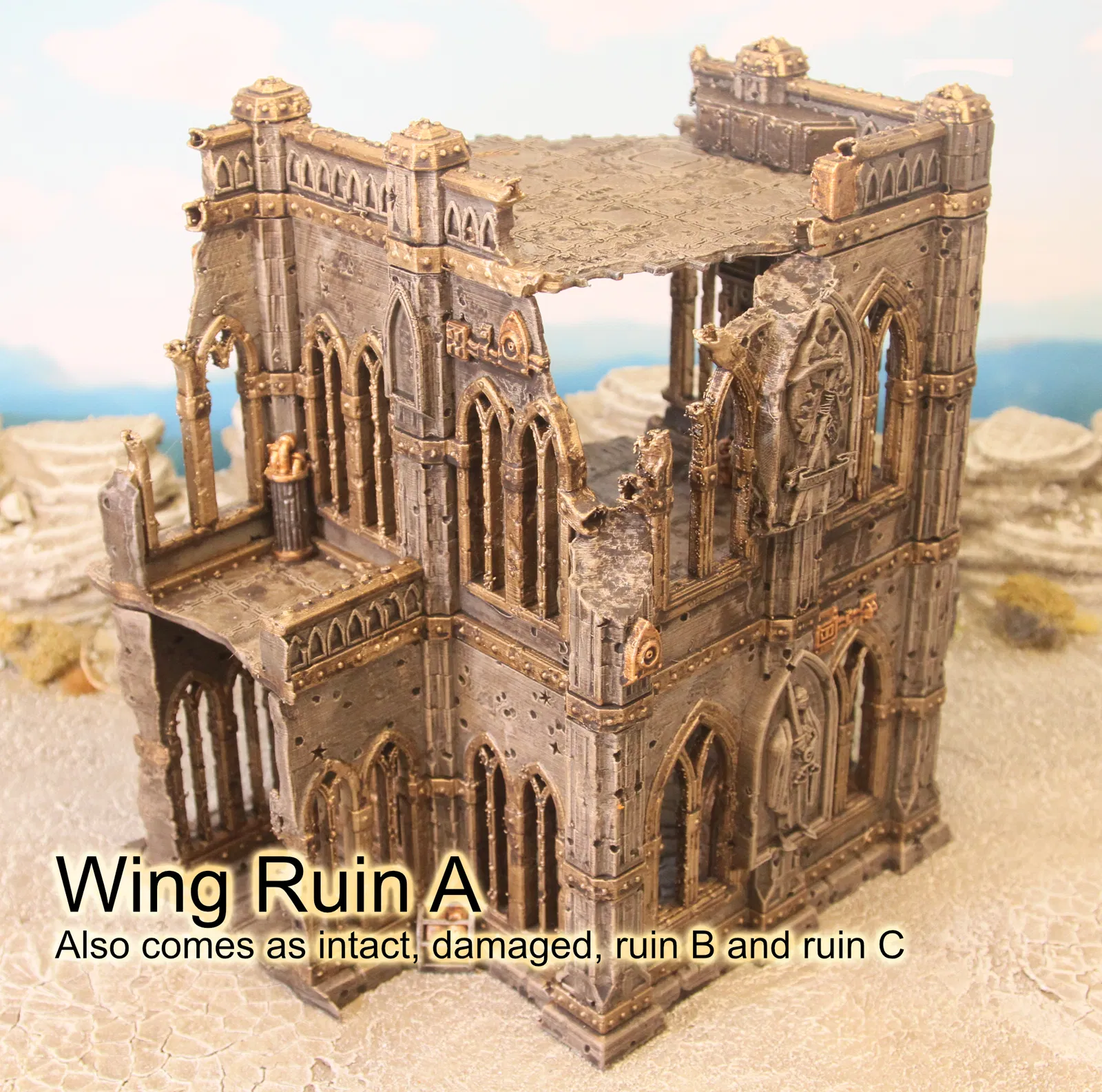 Mô hình này là phần “Cánh” thuộc phân đoạn “tàn tích A” (ruin A), đi kèm với một bộ các tấm che cửa sổ và phù điêu trang trí. Đây là sản phẩm được thiết kế cho dự án Kickstarter Domina Ferrum chuyên về địa hình cho các trò chơi wargaming và RPG.
