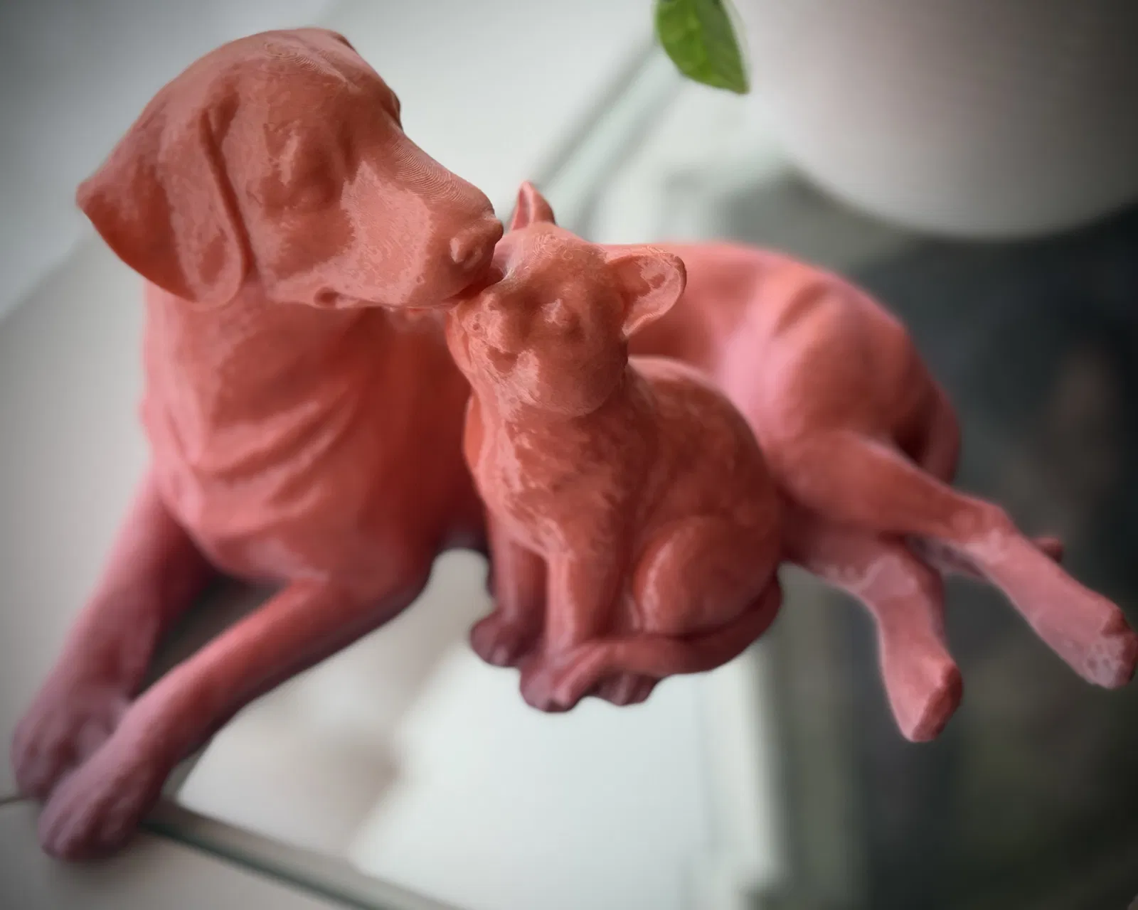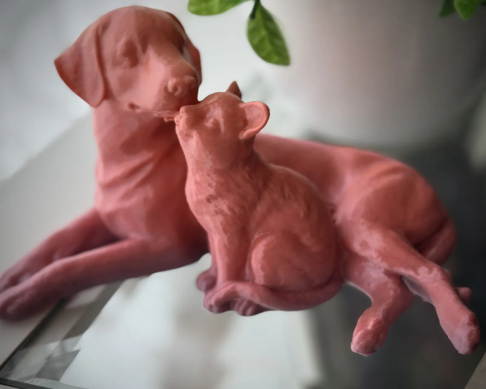 Một bức tượng điêu khắc chân thực mô tả cảnh chú chó và chú mèo đang nằm nghỉ ngơi bên nhau đầy âu yếm, thể hiện sự hòa hợp và tình bạn. Bản scan từ Poly.cam cho độ chi tiết rất ấn tượng, phù hợp để in 3D làm vật trang trí đầy ý nghĩa.