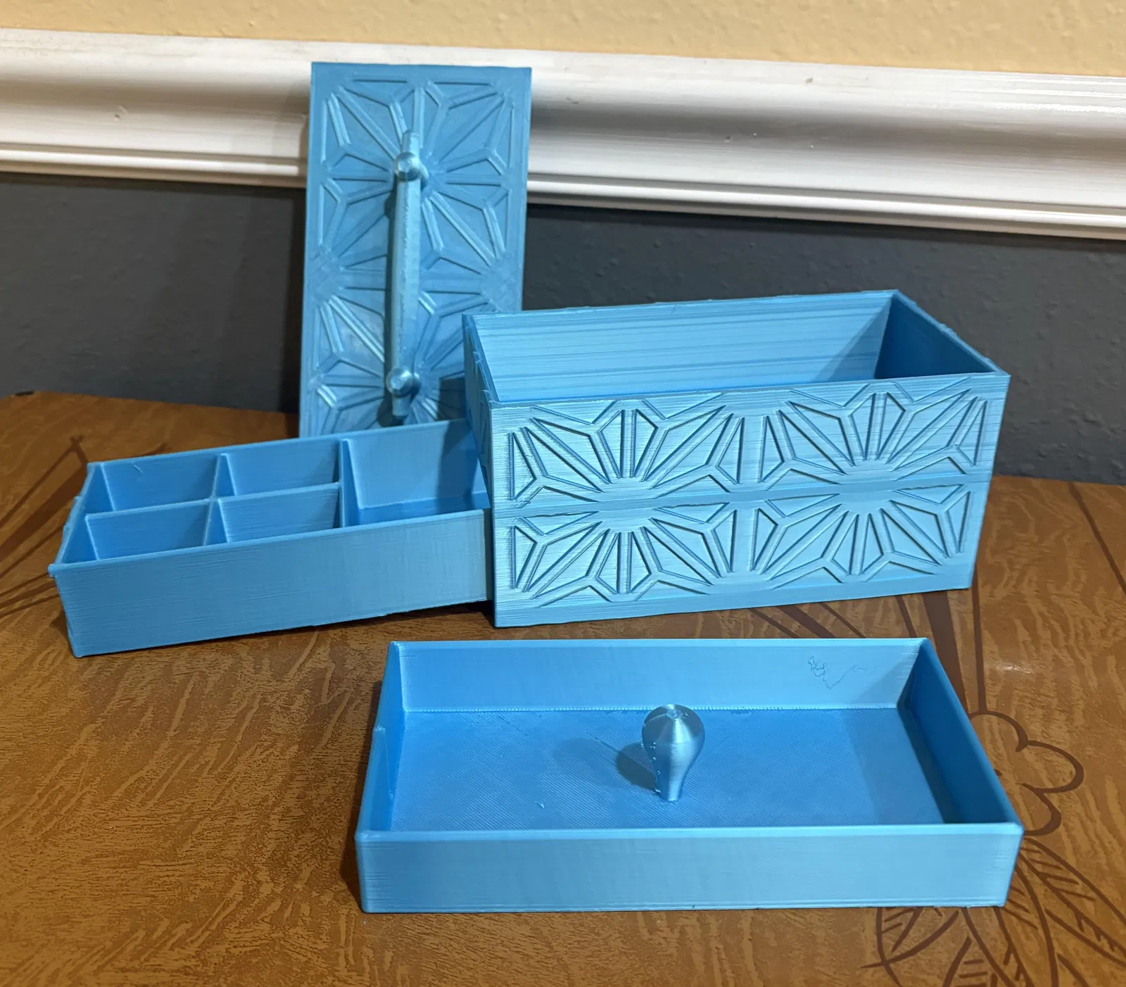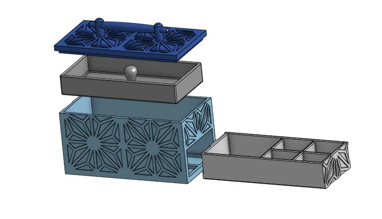 Hộp đựng trang sức thiết kế theo phong cách Kumiko với ngăn kéo trượt để đựng vòng tay, nhẫn và khay rời cho dây chuyền. Một món quà tinh tế và hữu ích, in bằng nhựa silk PLA rất sang trọng.