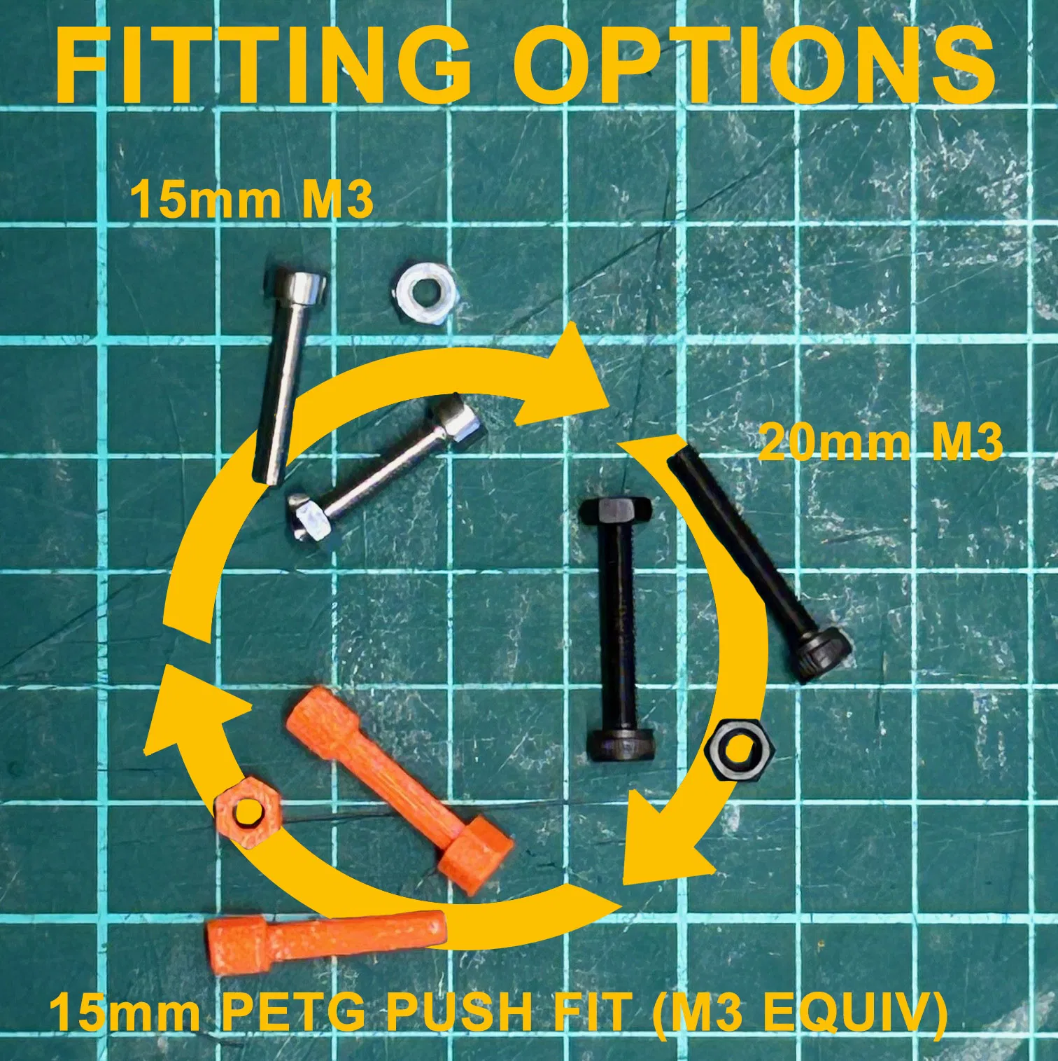 1. [Khuyên dùng] 2 ốc M3 inox (thân 15mm) kèm 2 đai ốc M3 – xem hình ảnh linh kiện [HOẶC dùng loại ốc M3 thân 20mm cho các tấm bên tương ứng] – Các file STL tấm bên đã được đánh dấu loại 15mm hoặc 20mm.