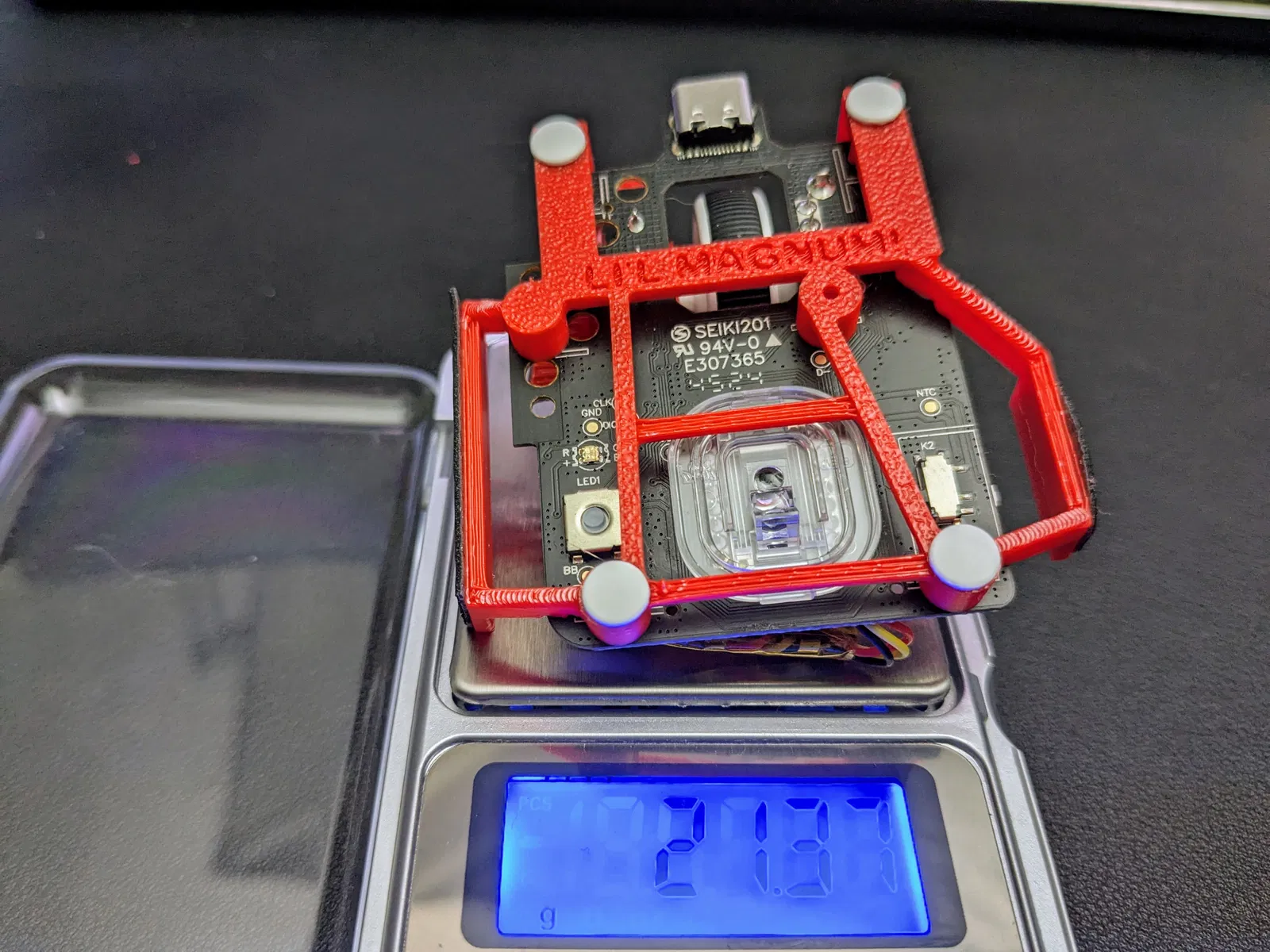 Con chuột này cần một cái tên, nên giờ nó được gọi là Li'l Magnum! Vì nó nhỏ mà! Đừng quên xem qua các mẹo để in thành công một chiếc Li'l Magnum nhẹ và chất lượng! Thiết kế này lấy cảm hứng từ Zeromouse và Zeromouse Blade của Optimum Tech, nhưng sử dụng công nghệ FDM và tận dụng một con chuột cũ rẻ tiền hơn làm linh kiện. Vị trí đặt ngón cái và các ngón tay khá ổn, các nút bấm cũng được căn chỉnh tốt. Tuy nhiên, vỏ chuột này đòi hỏi RẤT NHIỀU công đoạn uốn nắn và căn chỉnh tỉ mỉ phần lẫy nút để lắp vừa bo mạch (PCB) của chuột cũ. Mô hình này mang tính tham số nhưng cần được làm sạch thêm. Tôi muốn giúp việc điều chỉnh độ lệch của các phần kẹp ngón tay dễ dàng hơn, nhưng hiện tại cấu trúc vẫn còn khá lộn xộn. Tôi sẽ đăng file OpenSCAD sau khi hoàn thiện. Thiết lập hiện tại của tôi in bằng nhựa PLA có trọng lượng 20.58 gram với bản R1 Pro. Các lẫy nhấn nút sẽ có ít độ đàn hồi hơn nếu chỉ in một lớp bao (perimeter) thay vì hai lớp, và chiều dài của thanh nhấn đã được điều chỉnh để bù đắp cho điều này. Tôi đang dùng chế độ in lightning infill, và phải hạ thông số “minimum sparse infill threshold” trong Orcaslicer xuống 1 mm khối để đảm bảo các cánh tay nút vẫn rỗng. Độ rộng và độ dày của các cánh tay được tinh chỉnh để phù hợp với độ đàn hồi của nhựa PLA. v0.1 - Nguyên mẫu hoạt động đầu tiên v0.2 - Chuyển sang miếng căn chỉnh trục lăn rời, thêm cột đỡ dưới nút, thêm góc nghiêng cho phần cầm ngón tay và ngón cái v0.2b - Thanh nhấn dài hơn một chút để hoạt động với bản in nhẹ hơn v0.3 - Lẫy trái thấp hơn một chút, lẫy phải thấp hơn nhiều, thêm các khớp nối mỏng dọc đáy, khớp nối nút hẹp hơn, chốt chặn để cảm giác nhấn tốt hơn v0.4 - Thay đổi nhỏ để khớp với file STL của R1-SE, hạ PCB xuống 0.8 mm và hạ lẫy nút 1 mm v0.5 - Việc khớp chiều cao PCB của R1-SE ở bản v0.4 làm chuột của tôi bị rung! Đã chia đôi khoảng cách chiều cao để cả bản Pro và SE đều dùng được v0.6 - Thêm vát cạnh (chamfer) cho nút để tăng độ bền v0.7 - Tinh chỉnh nút để tăng độ bền, thêm ray đỡ thấu kính (tăng khoảng 0.12 gram), hỗ trợ thêm support và nâng các thanh nối khỏi bàn in v1.0 - Sao chép chính xác thiết lập giá đỡ thấu kính từ mẫu R1 và R1 SE, các cánh tay cầm bên hông được tạo góc nghiêng khỏi bàn di chuột, cánh tay cứng cáp hơn (việc loại bỏ vật liệu support ở đây khá khó khăn) v1.2 - Giảm trọng lượng thêm hơn 0.25 gram, loại bỏ các phần khung dưới cồng kềnh, thêm thanh giằng bên hông dạng tham số * v2.0 - Thay đổi về cấu trúc, trọng lượng và giúp in dễ dàng hơn! Trọng lượng phần trước giảm 0.2 đến 0.3 gram, nút nhấn chắc chắn hơn dù nhẹ đi, thanh nhấn nút được điều chỉnh (đế vuông thay vì tròn để in hỗ trợ sạch hơn, mặt dưới lẫy được vát góc để giảm bớt nhu cầu dùng support).