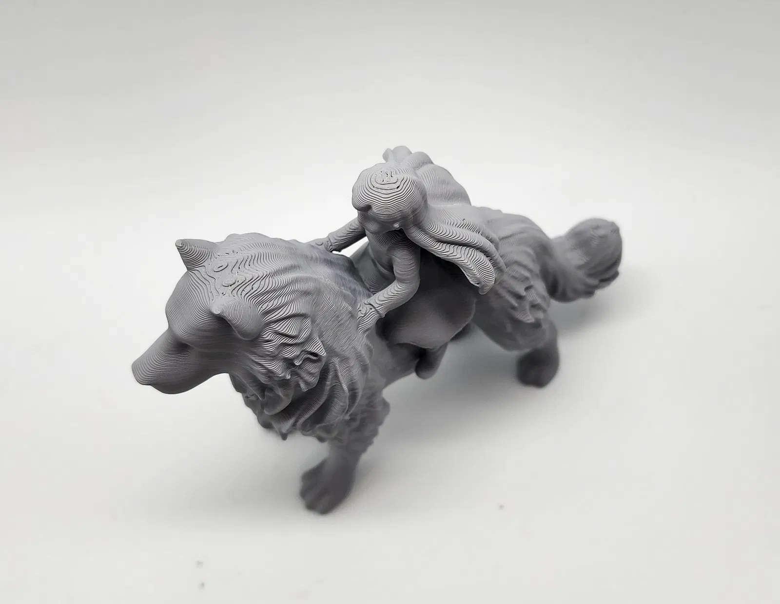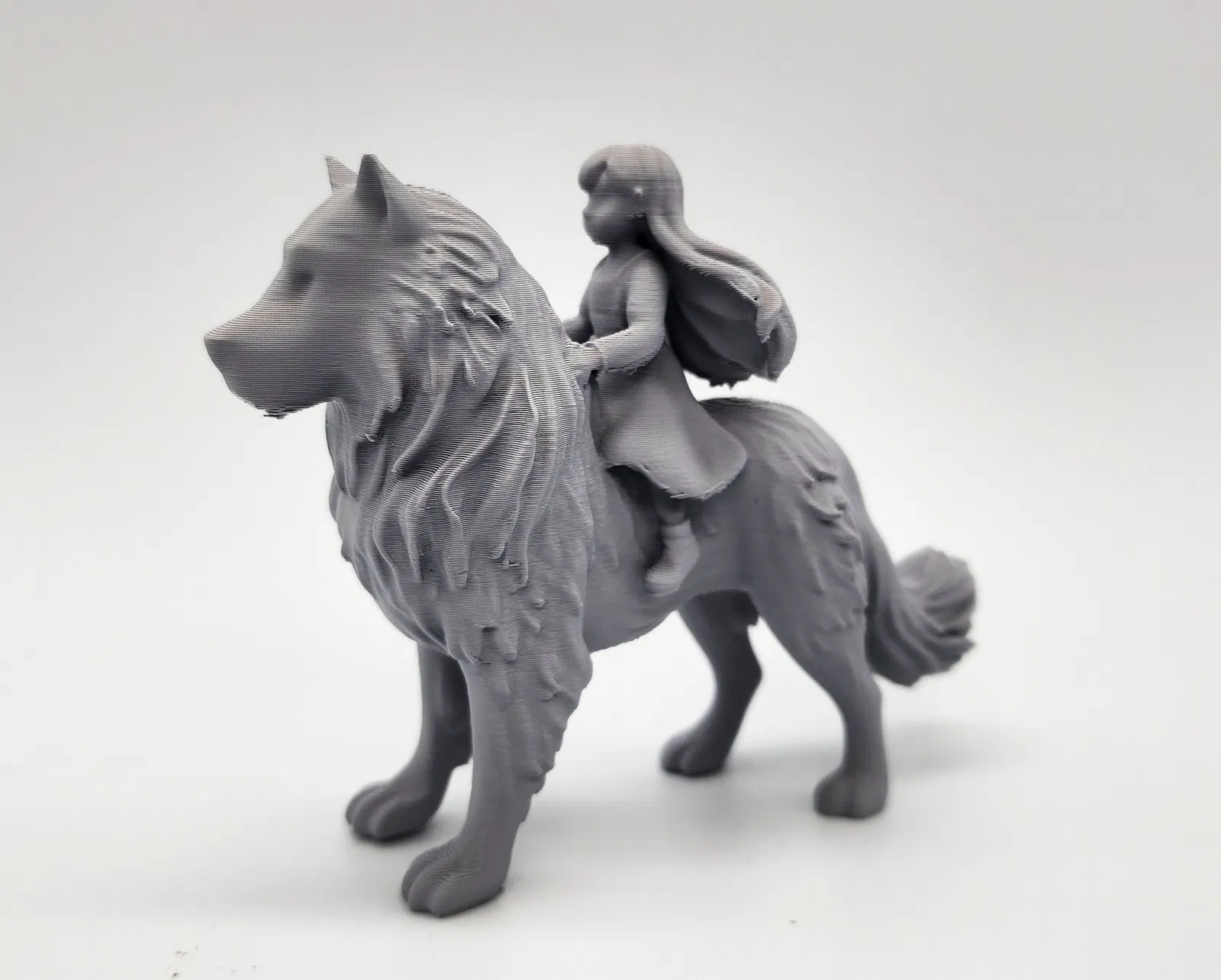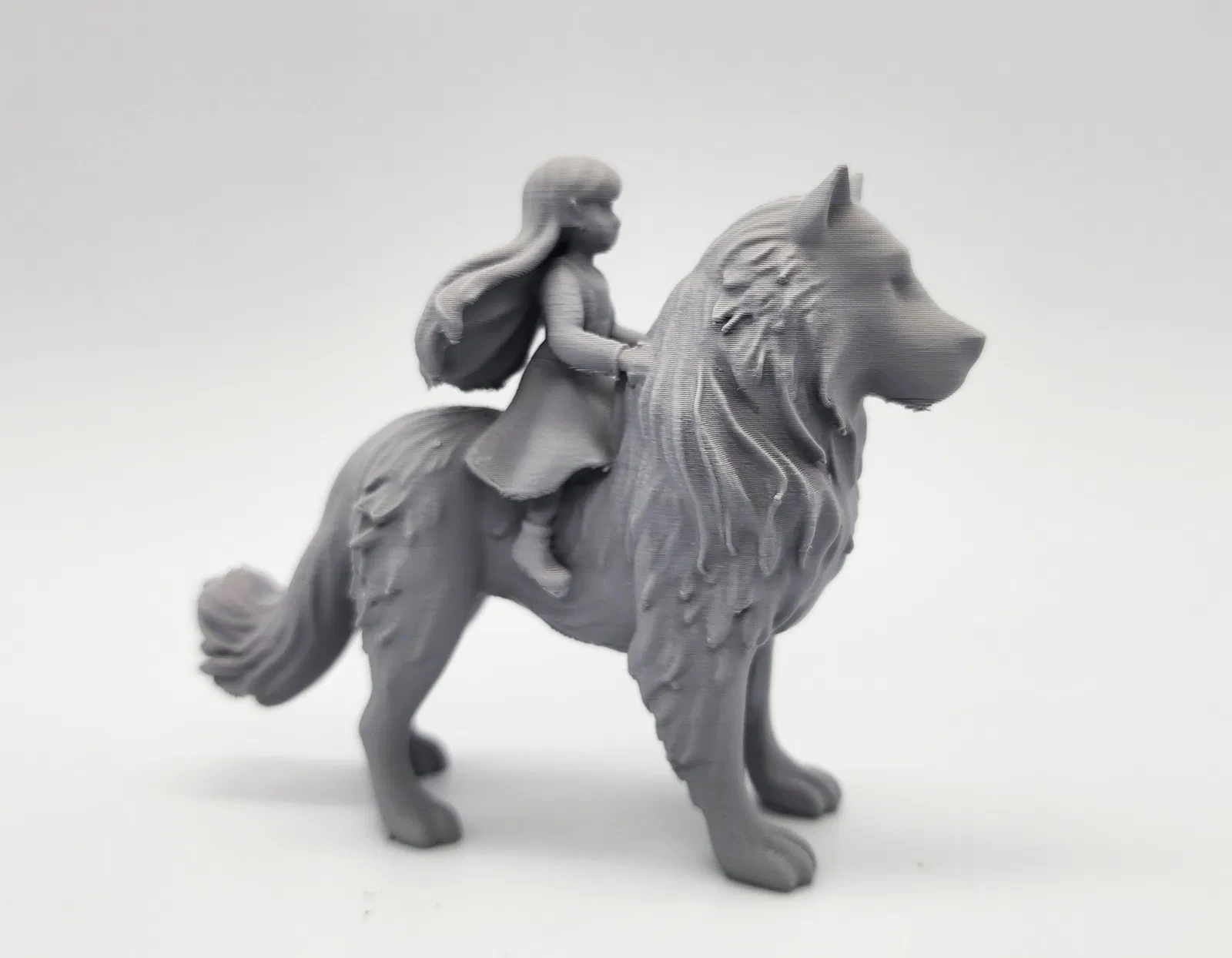 Mô hình một chú chó lớn hoặc sói với một cô bé đang cưỡi trên lưng. Cần dùng Tree Supports khi in.