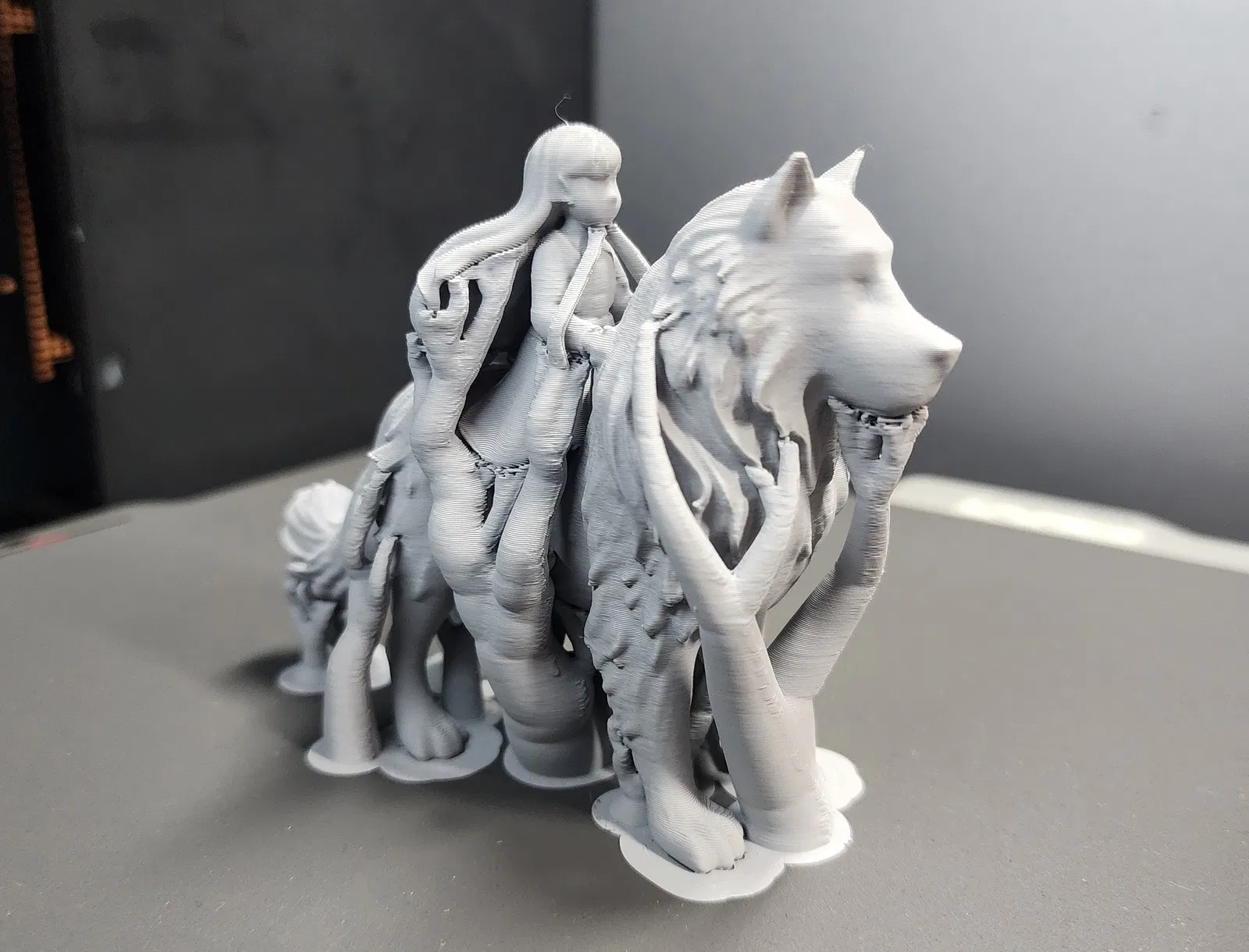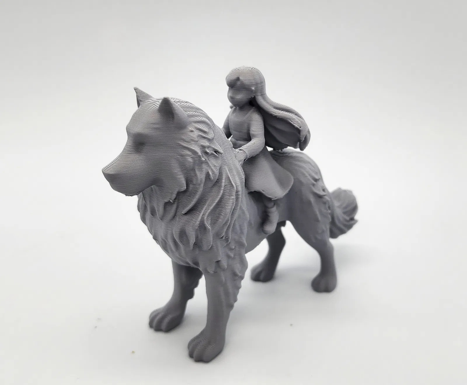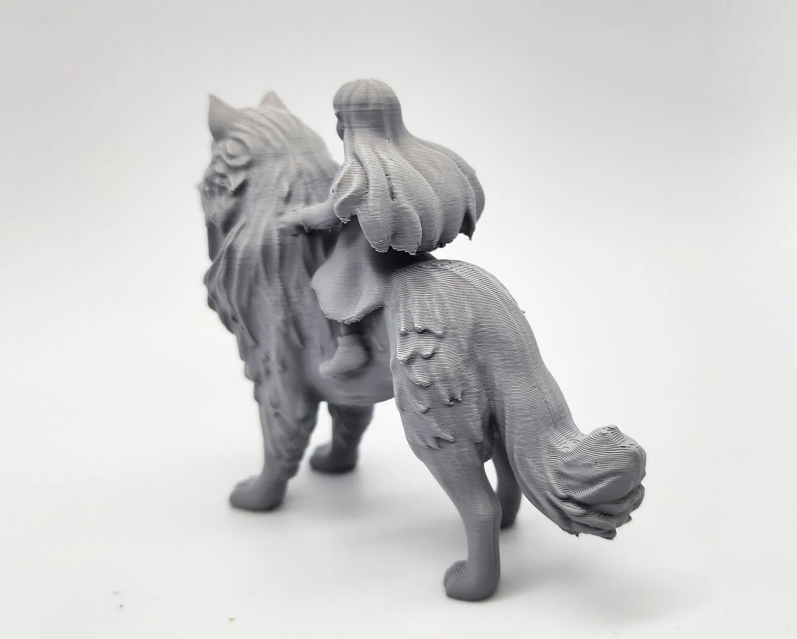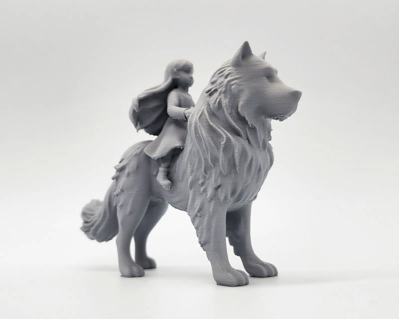 Mô hình một chú chó lớn hoặc sói với một cô bé đang cưỡi trên lưng. Cần dùng Tree Supports khi in.