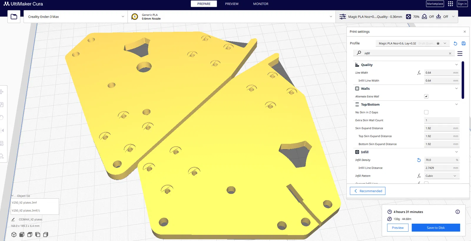 Thông số in: infill 70%, 3 tường (walls), 3 lớp trên/dưới, đầu phun 0.6mm.
