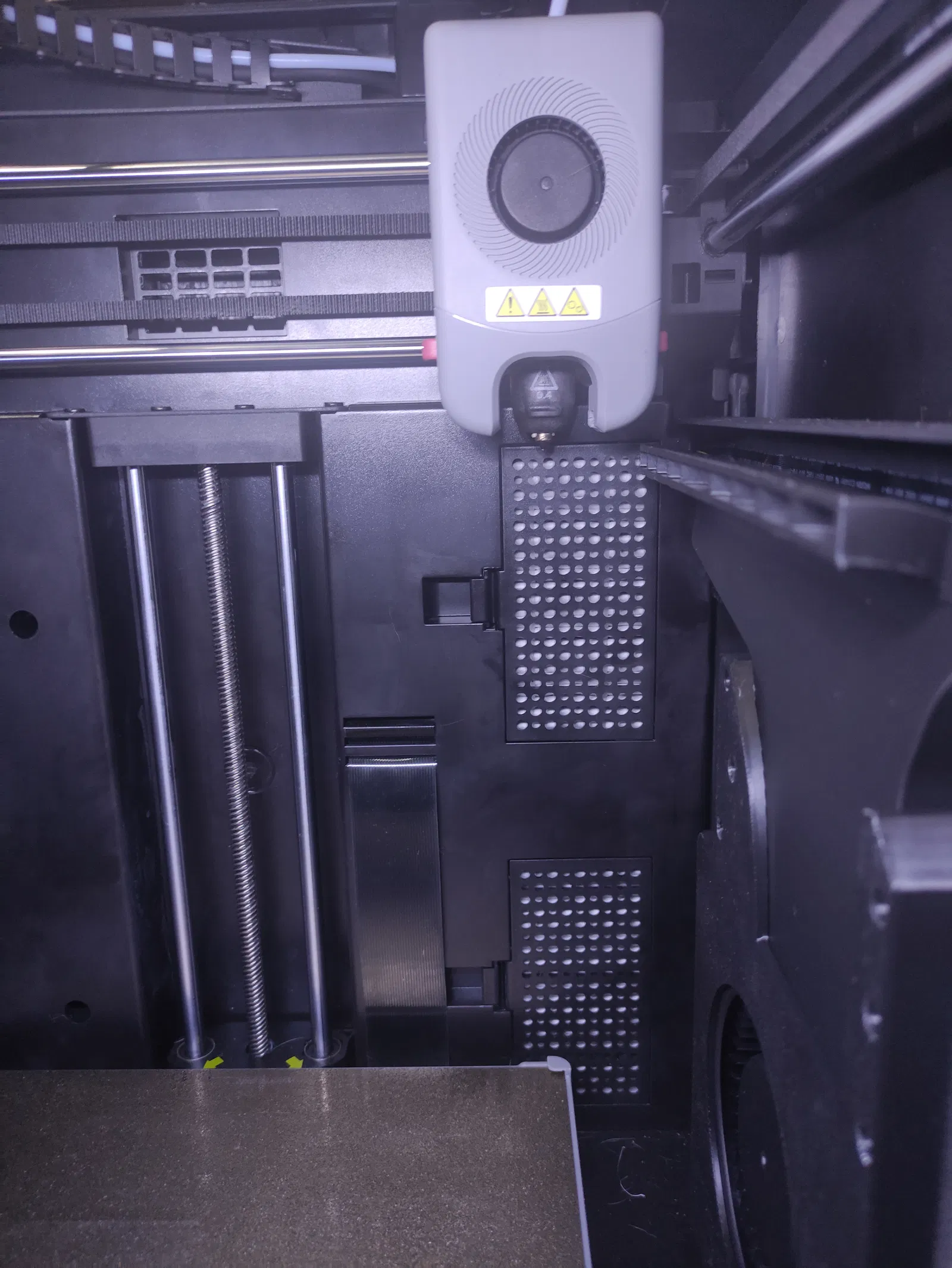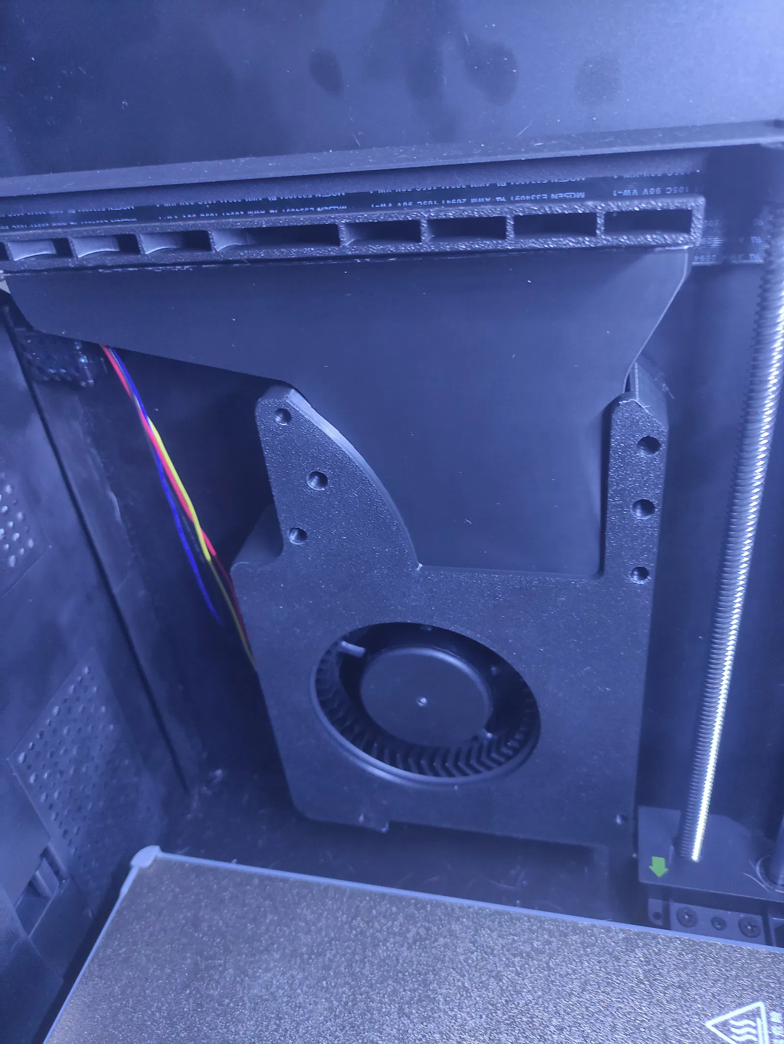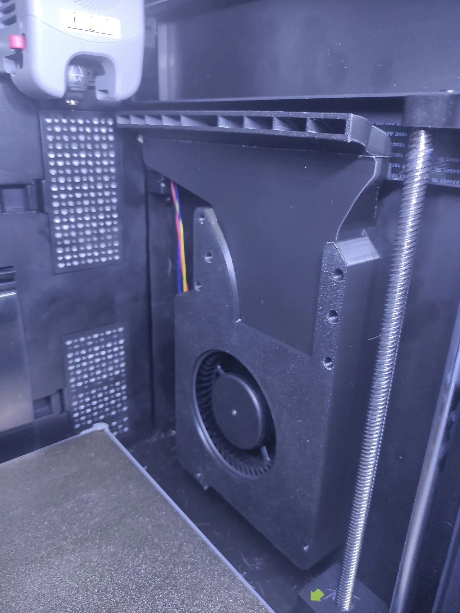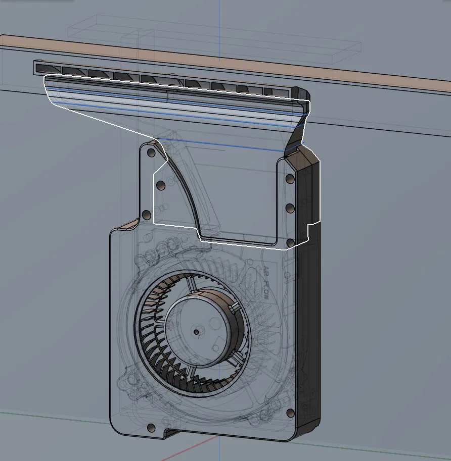 Máy Flashforge Adventurer 5M Pro của mình có sẵn các trụ ốc (standoffs) và một phần gờ trên vách phải, nên mình nghĩ nó được thiết kế cho quạt phụ thứ hai. Tuy nhiên, ống dẫn gió gốc lại không vừa, thế là mình tự thiết kế lại hoàn toàn. Mình đã sử dụng phần trên từ mô hình Trident rồi kéo dài ra, còn các chi tiết khác thì tự dựng lại từ đầu. Bạn sẽ cần chuẩn bị: 6 ốc nhiệt m3, 4 ốc m3x12, 2 ốc m3x6, 4 ốc vít tự ren m3x8, 1 quạt ly tâm 12032 24V 4Pin (loại bạc đạn kép). Bạn hãy đấu nối quạt này song song với quạt hiện có nhé. Nên in bằng nhựa ABS ngay trên máy của bạn, nhớ sử dụng brim và hỗ trợ (supports) cho linh kiện thứ hai.