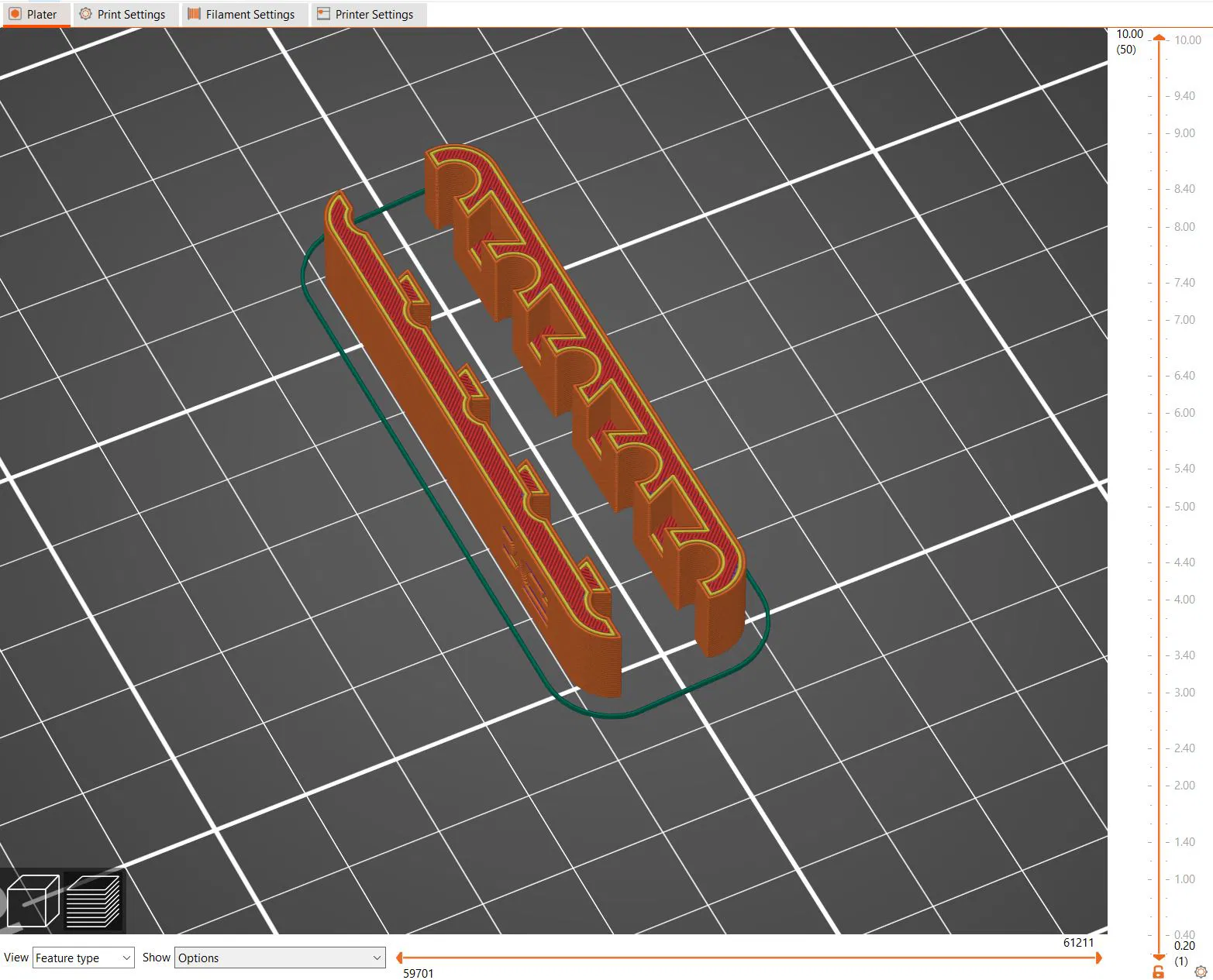 Thông số in: Dùng nhựa PLA, đầu phun 0.4mm, chiều cao lớp in 0.2mm, độ phủ 15% (kiểu Grid) và 2 tường (perimeters). Đặt hai nửa lên bàn in như hình minh họa, không cần dùng support.