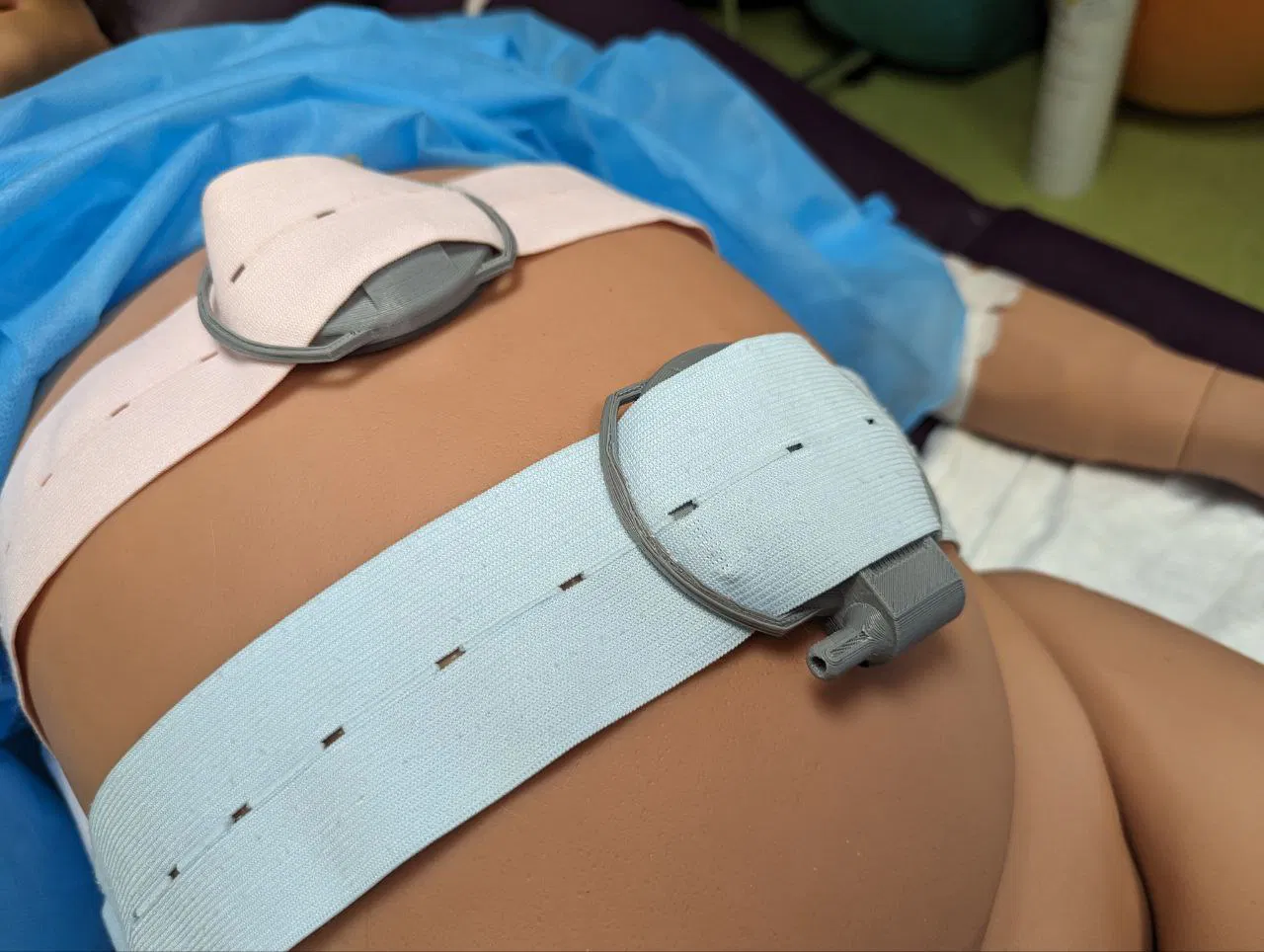 Mô hình đầu dò máy theo dõi tim thai (Đầu dò siêu âm, đầu dò TOCO) dùng làm đạo cụ cho các buổi mô phỏng lâm sàng. Một công cụ giáo dục hỗ trợ thực hành kỹ năng cho sinh viên y khoa.