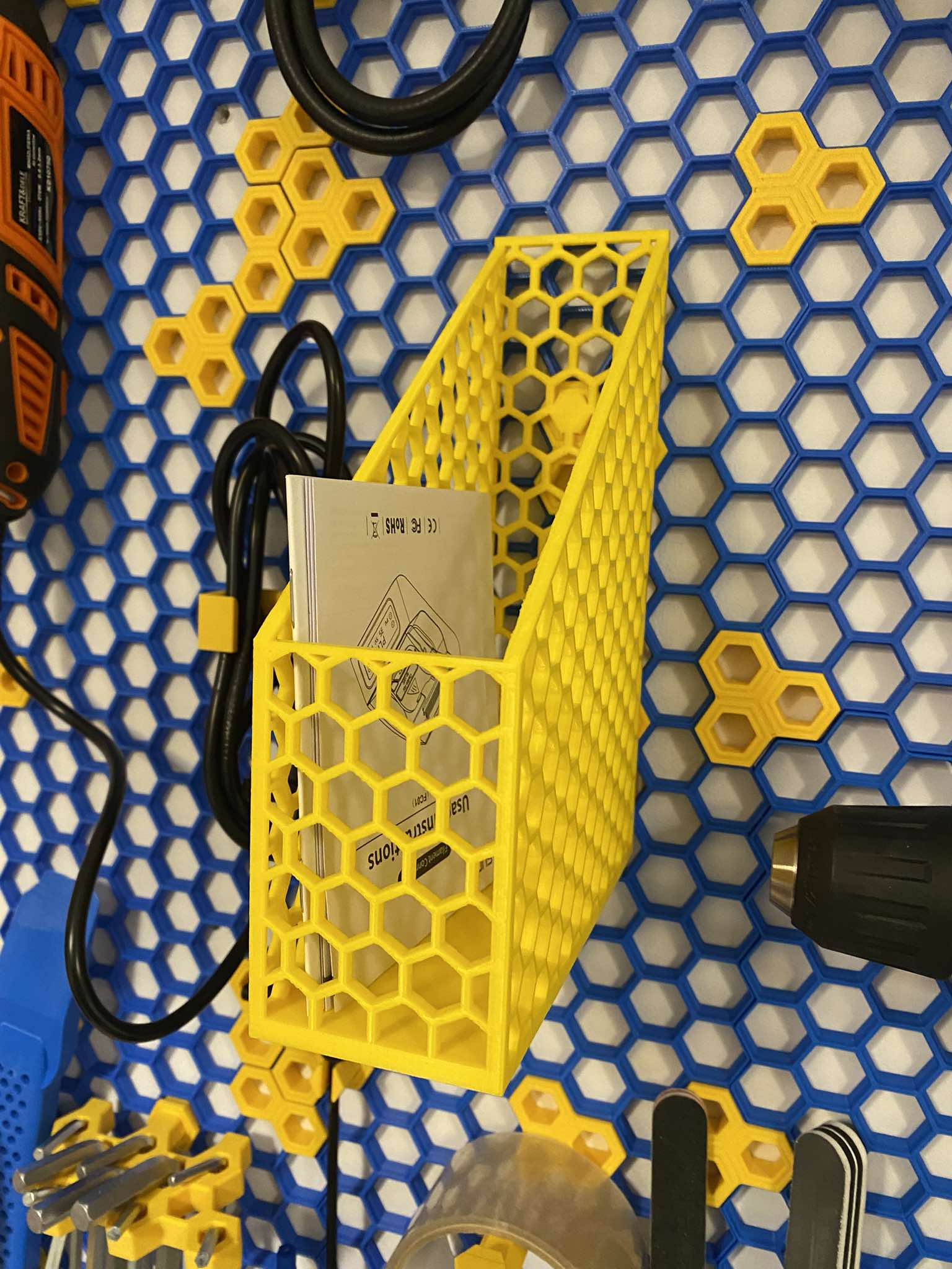 Khay đựng tài liệu khổ A5 được thiết kế tối ưu cho hệ thống HSW. Với họa tiết lục giác tiết kiệm nhựa, đây là phụ kiện hoàn hảo để sắp xếp giấy tờ của bạn một cách gọn gàng và đẹp mắt trên bảng treo HSW.