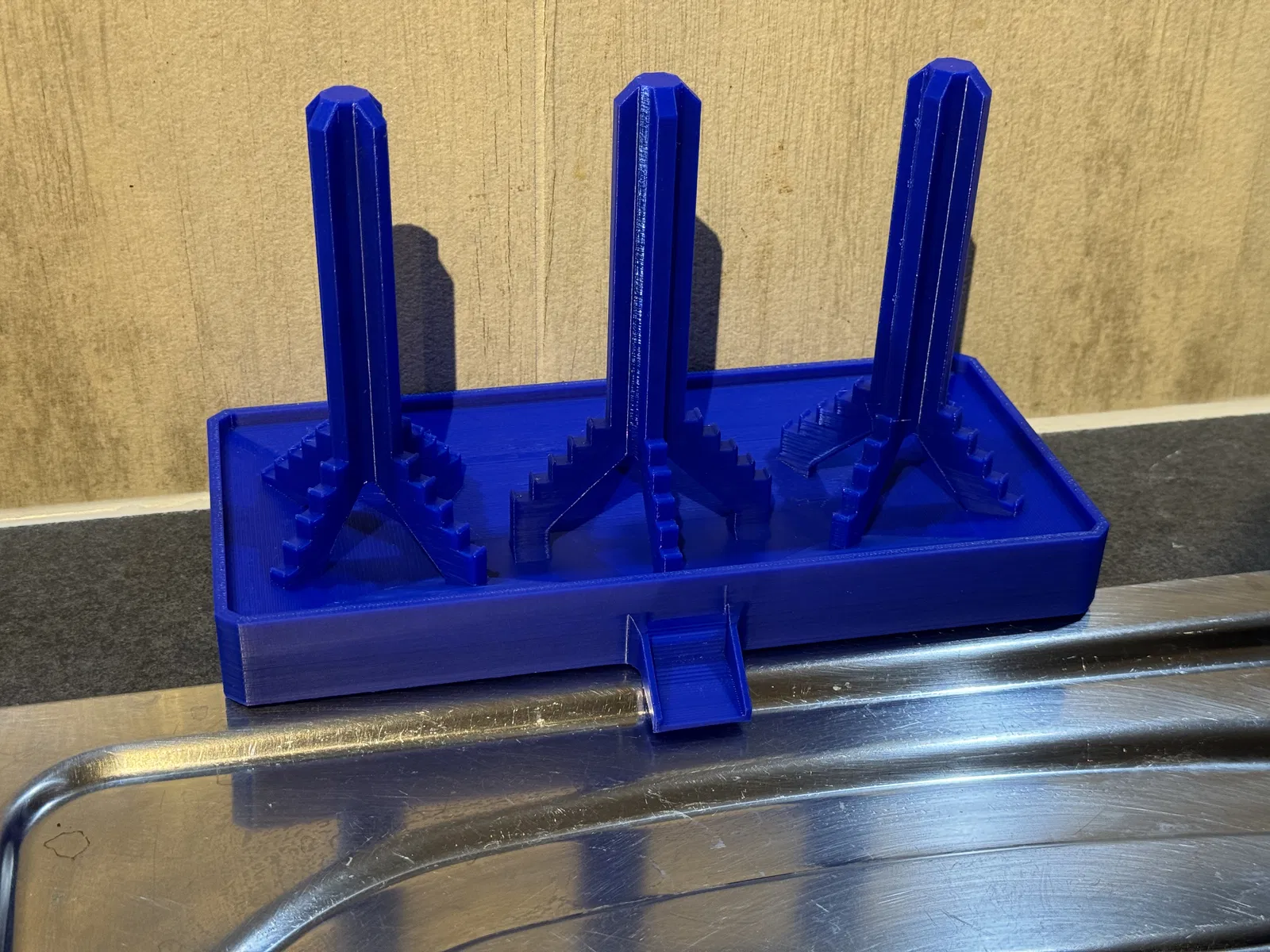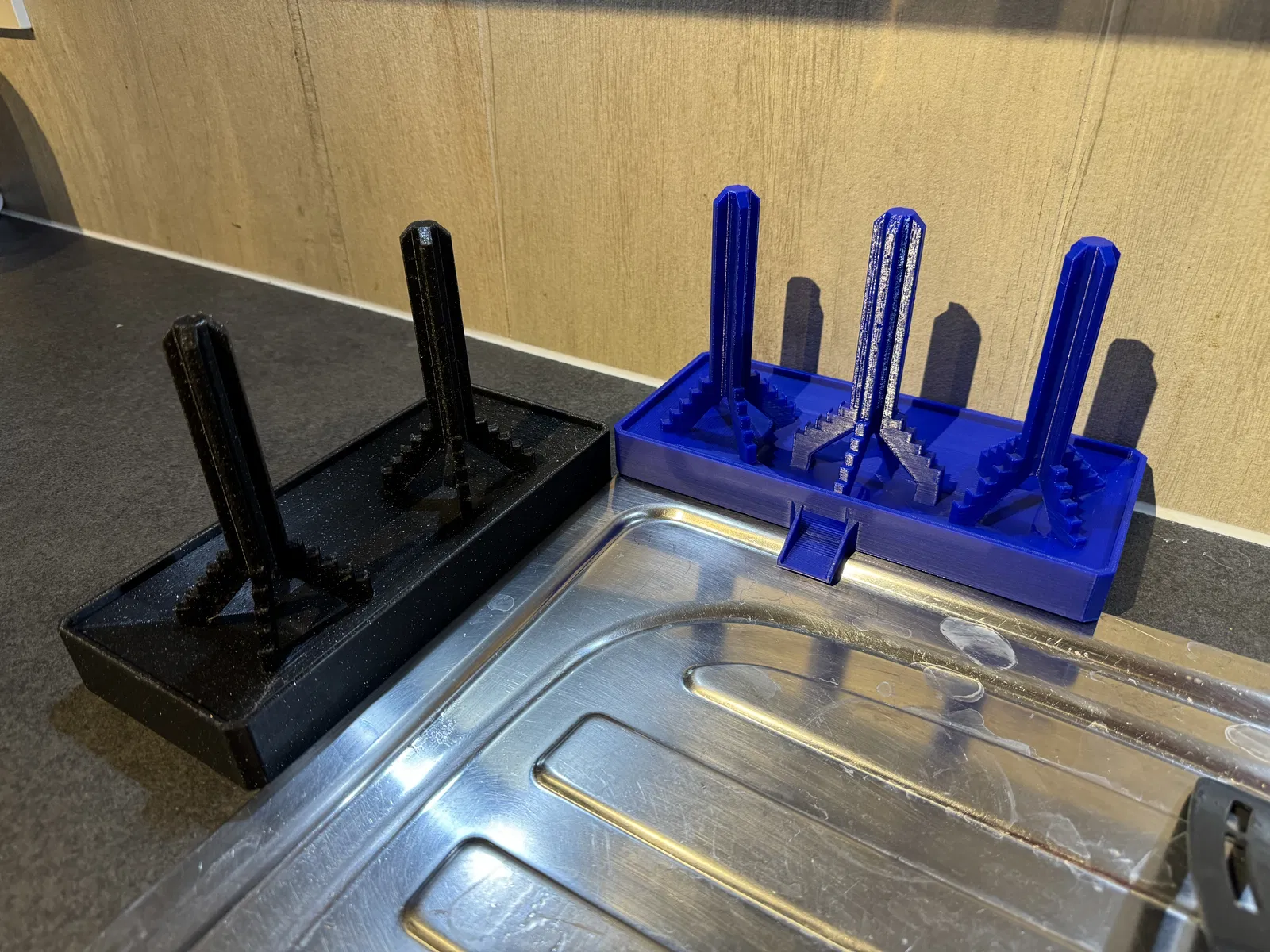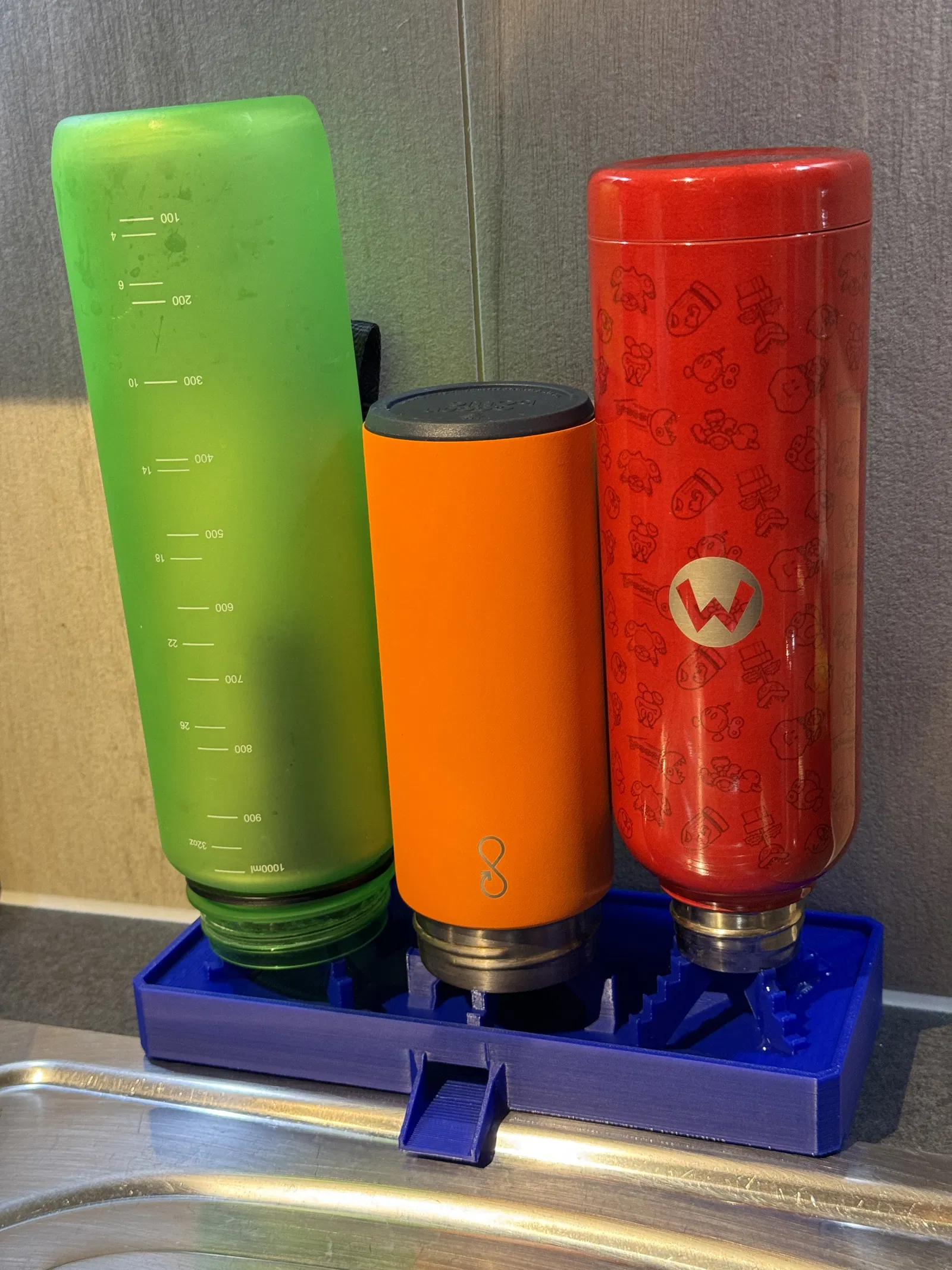 Đây là cái giá phơi bình nước cuối cùng mà bạn cần in ;o) Sau khi đã in và dùng thử vô số loại giá phơi, kệ và thiết bị cho các bình nước thể thao, mình không tìm được cái nào ưng ý cả. Chúng thường quá hẹp, ọp ẹp hoặc dễ bị đổ khi để đầy bình vì phần đế không đủ rộng. Vì vậy, mình đã tạo ra “Dry-Pod”, một chiếc giá phơi đa năng cho hầu hết các loại bình. Phần đế rộng và cứng cáp giúp giữ thăng bằng cực tốt ngay cả khi treo các loại bình cao hoặc nặng như bình giữ nhiệt thủy tinh. Hai hoặc ba tháp phơi có thể giữ chắc chắn các loại bình có miệng từ 25 - 70 mm. Nước từ bình sẽ chảy xuống phần đế và thoát ra ngoài qua khe thoát nước ở phía trước, dẫn thẳng vào bồn rửa chén. Để đảm bảo nước thoát hoàn toàn mà không làm ướt mặt bếp, phần đế được thiết kế một hốc kích thước 10x15mm để gác lên cạnh bồn rửa. Nếu không cần tính năng thoát nước, bạn có thể chọn in phiên bản không có khe thoát. Dry-Pod hiện có sẵn 4 phiên bản: 3 tháp có thoát nước (Lựa chọn của mình) 3 tháp không có thoát nước 2 tháp có thoát nước 2 tháp không có thoát nước Các phiên bản có lỗ thoát nước cần hỗ trợ (supports) cho phần hốc và có thể cho cả lỗ thoát (tùy vào khả năng bắc cầu - bridging của máy in). Phiên bản lớn nhất mất khoảng 6 tiếng để in trên máy Mk3.5S của mình (layer 0.2 mm, infill 15%, 2 lớp vỏ). Nếu bạn có góp ý gì để cải thiện, hãy để lại bình luận cho mình nhé (mình vẫn còn khá mới trong việc thiết kế 3D). Mình cũng đã làm một chiếc giá để miếng rửa chén với thiết kế tương tự, bạn có thể tham khảo thêm. Chúc bạn in vui vẻ :) Cập nhật: Nếu bạn không cần phần hốc để gác lên bồn, hãy xem thử bản remix của Adeta.