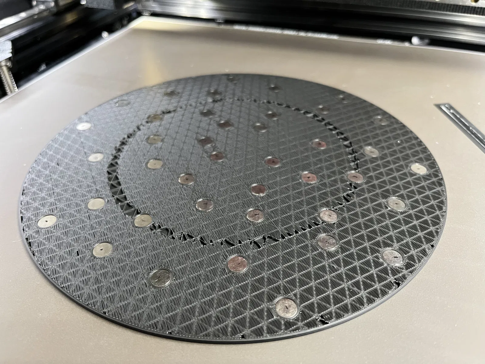 Bên dưới mỗi chấm tròn sẽ đặt một viên nam châm, ví dụ như để dùng với bộ “Magnetic Markers for 3D Scanning” của mình. Kích thước nam châm cũng có thể tùy chỉnh dễ dàng trong F360: