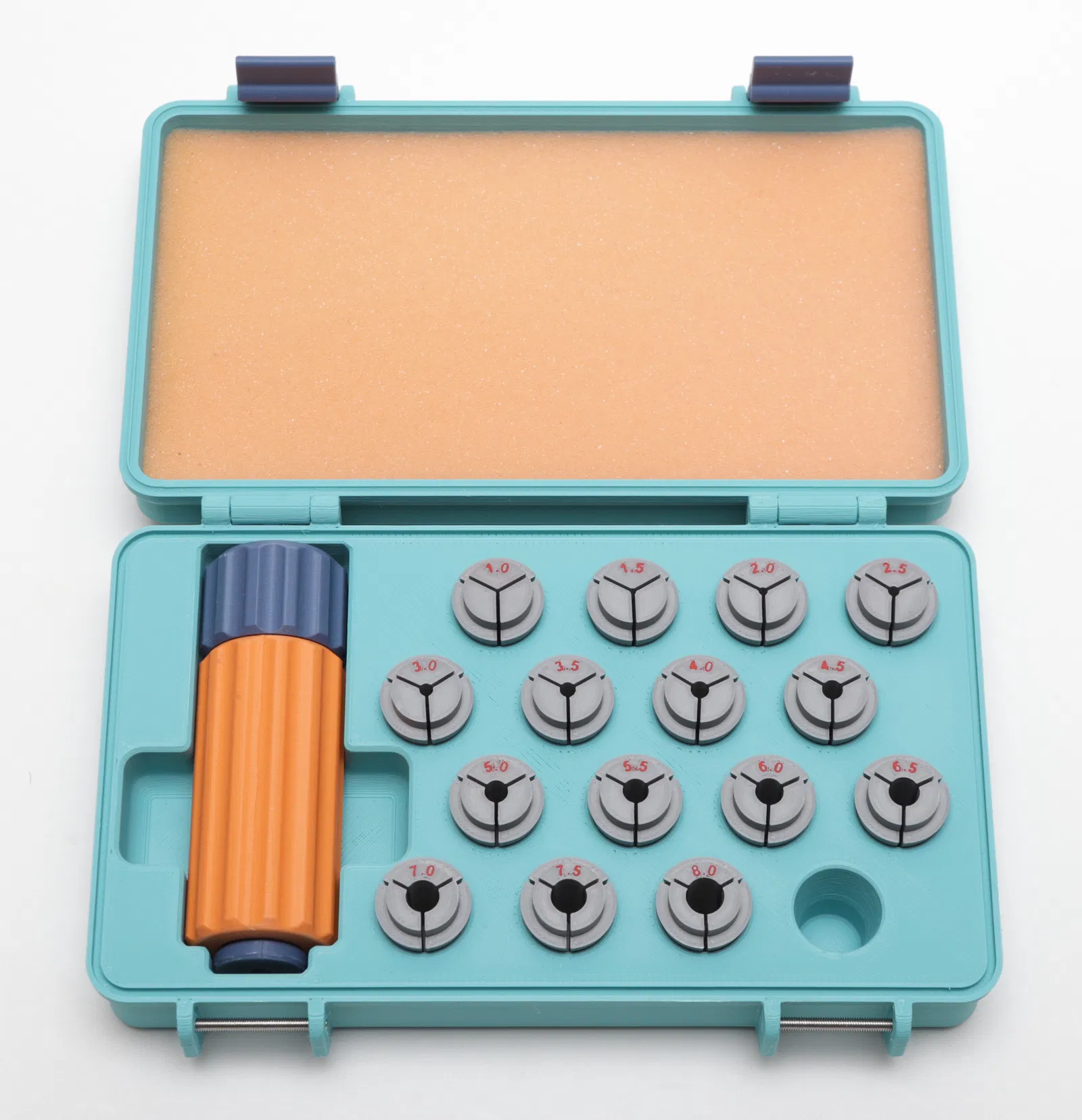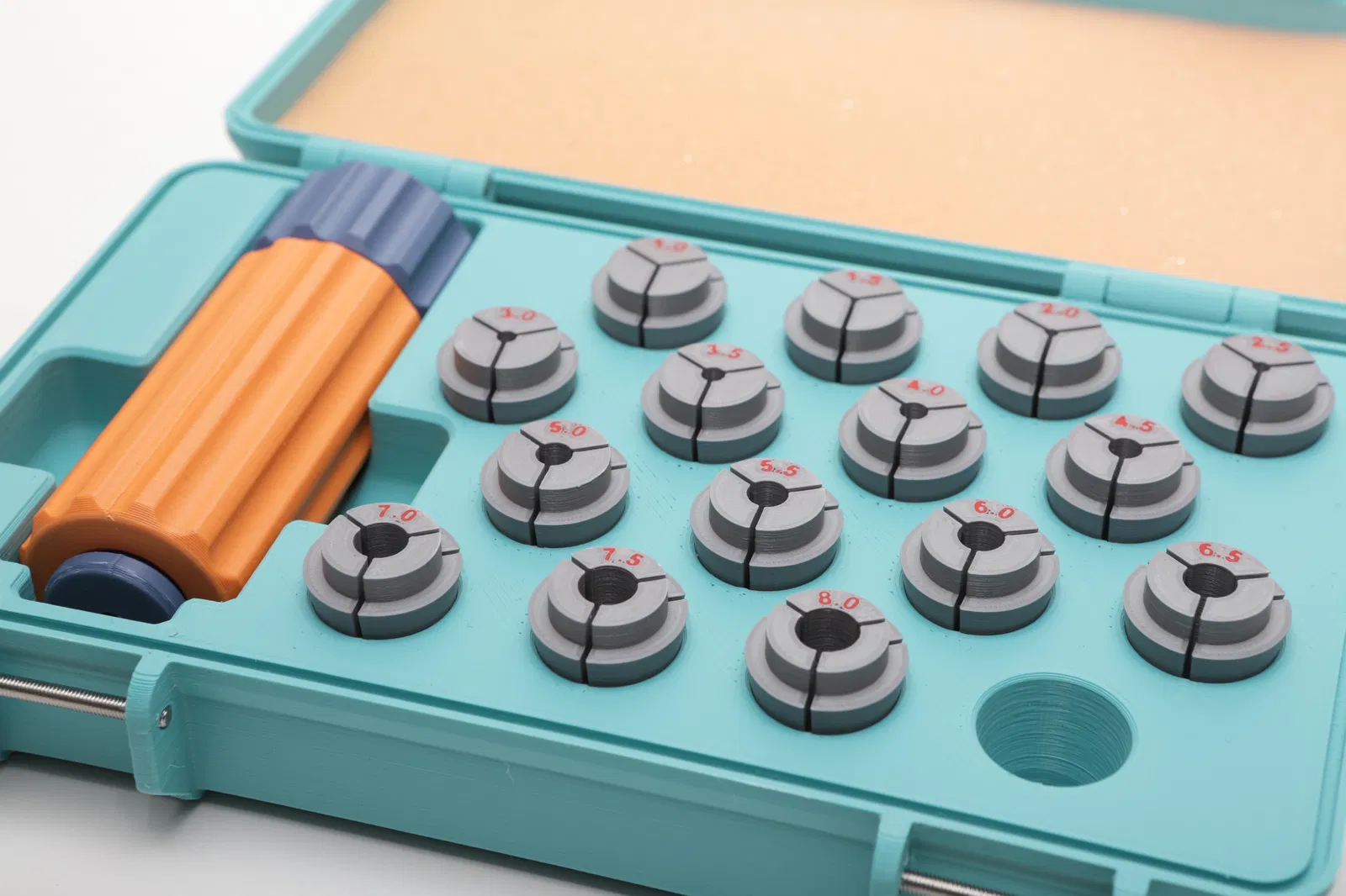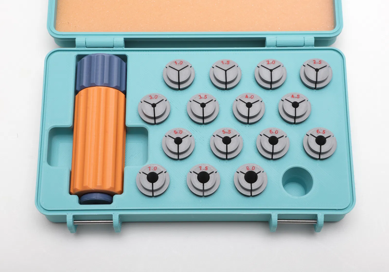 Chiếc hộp này được thiết kế dựa trên mẫu “Rugged Box” tùy biến của mình, vừa vặn hoàn hảo với Drill Handle của Sisul và có thể chứa đến 16 đầu collet.
