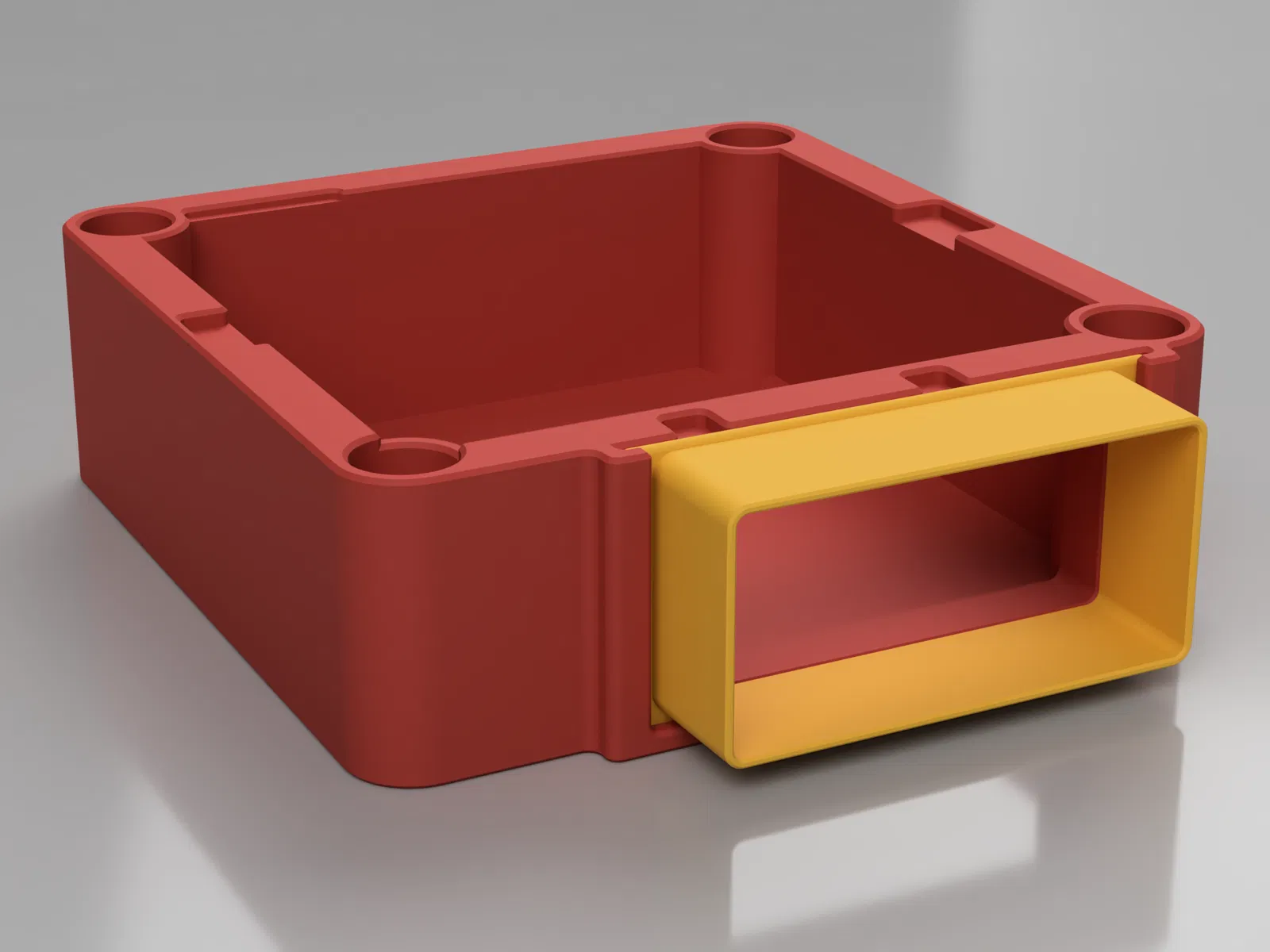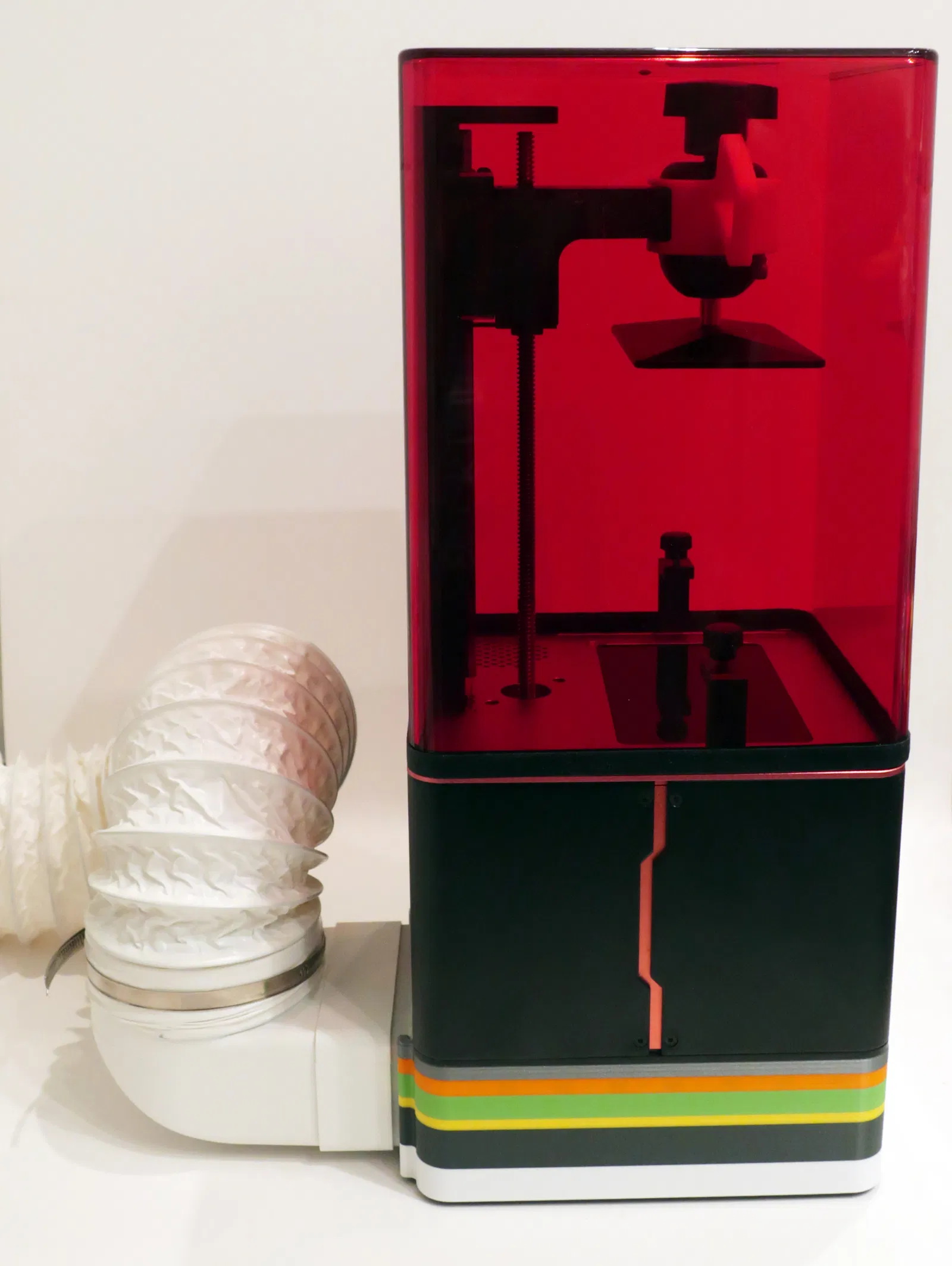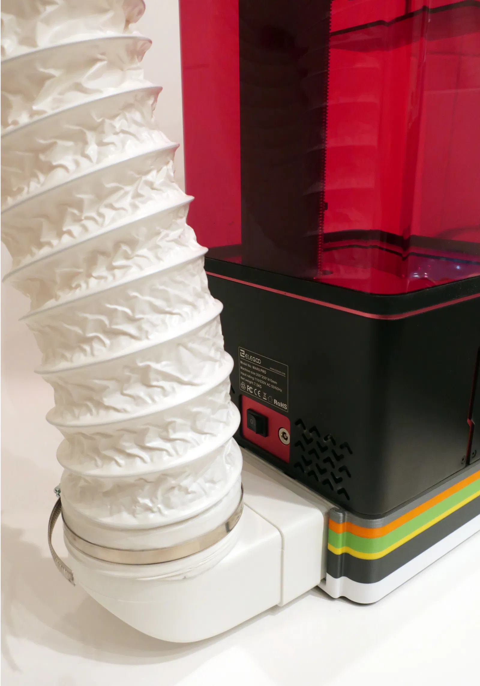 Vì Elegoo Mars (Pro) có lỗ thoát khí nằm dưới đáy, mình đã thiết kế một cái đế để kết nối với hệ thống ống hút mùi. Giải pháp này giúp loại bỏ hoàn toàn mùi nhựa resin khó chịu trong phòng làm việc của bạn.