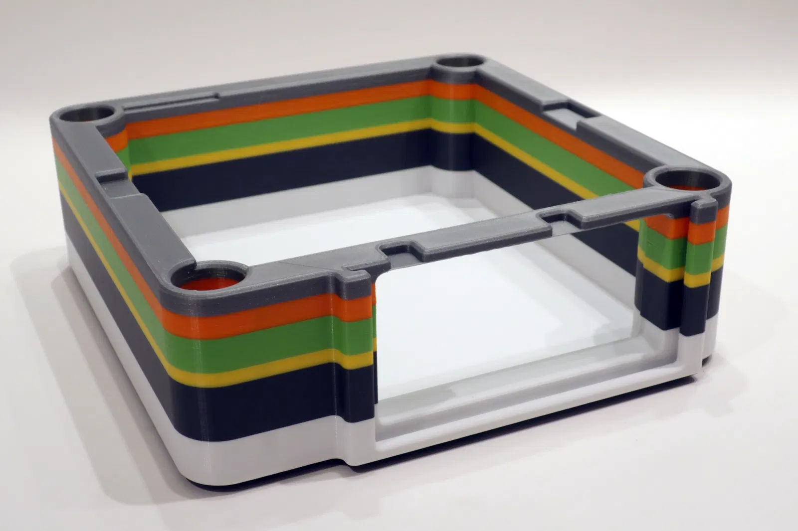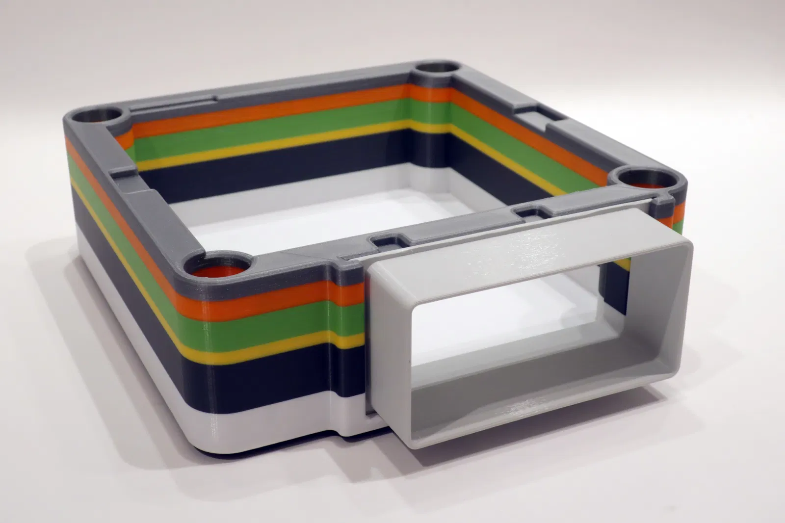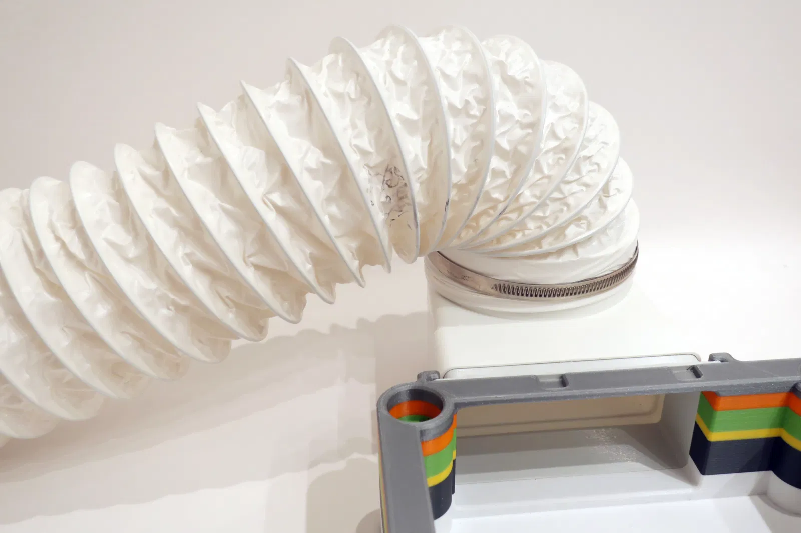 Vì Elegoo Mars (Pro) có lỗ thoát khí nằm dưới đáy, mình đã thiết kế một cái đế để kết nối với hệ thống ống hút mùi. Giải pháp này giúp loại bỏ hoàn toàn mùi nhựa resin khó chịu trong phòng làm việc của bạn.