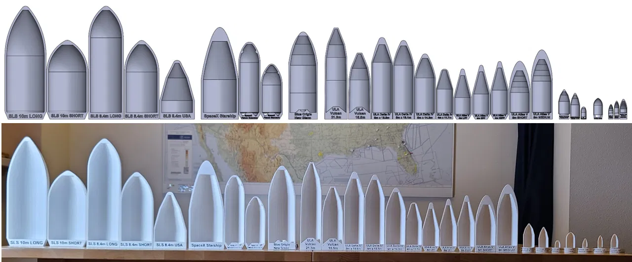 Chào bạn! Tại đây bạn sẽ tìm thấy các tệp STL cho toàn bộ 27 thể tích tải trọng (payload volumes) được công bố chính thức, áp dụng cho tất cả 11 hệ thống phóng quỹ đạo của Hoa Kỳ hiện đang hoạt động, dựa trên các tài liệu công khai sau: