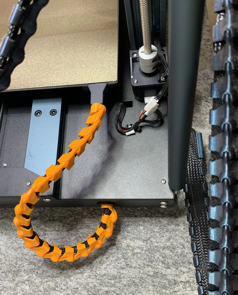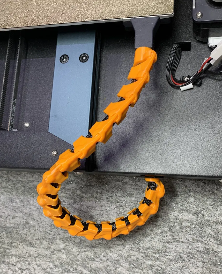 Tôi nhận thấy cáp bàn in trên máy của mình tạo ra độ cong không mấy mượt mà từ đế lên bàn in. Bộ xích này giúp khắc phục bằng cách ép cáp uốn cong theo chiều dài lớn hơn, hy vọng sẽ giảm thiểu tình trạng mòn cáp khi bàn in di chuyển.