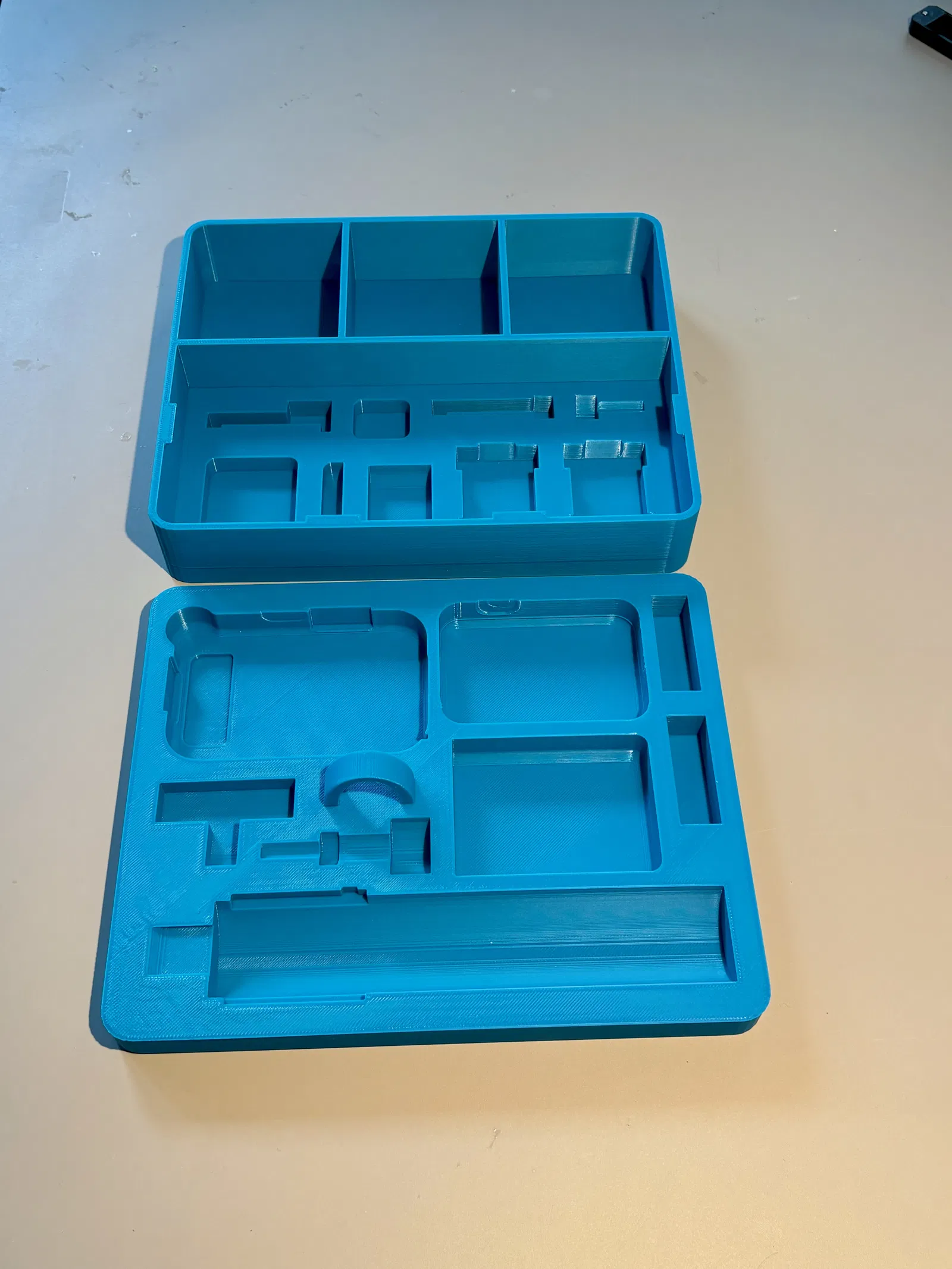 Mẫu thiết kế này là bộ hai khay giúp bạn sắp xếp gọn gàng các linh kiện của GoPro Hero 13 Creator Edition ngay trong hộp đựng gốc. Khay trên có các hốc để giữ máy ảnh GoPro, Media Mod, Volta, ốc vít lớn, khớp nối từ tính, bộ sạc và hai viên pin. Khay dưới được thiết kế với các hốc để chứa đế gắn, Light Mod, bộ khuếch tán ánh sáng, đế dán cong, ốc vít nhỏ, bộ chuyển đổi hai ngàm cùng với nắp pin tiêu chuẩn và nắp pin có cổng USB. Ba ngăn trống còn lại của khay dưới giúp bạn đựng thêm các phụ kiện khác như cáp sạc USB và miếng chắn gió rời như trong hình. Mẫu này được in với độ cao lớp 0.2 bằng nhựa HatchBox Peacock Blue trên máy Prusa MK3.5.
