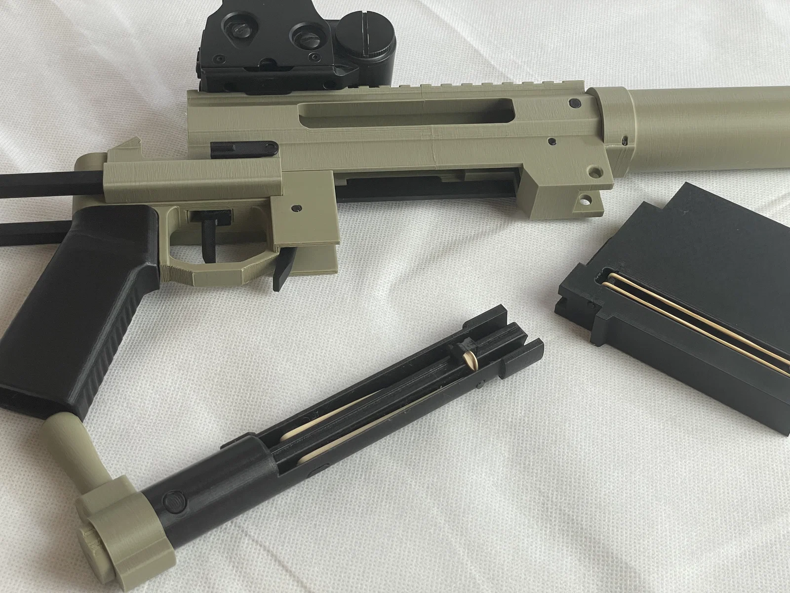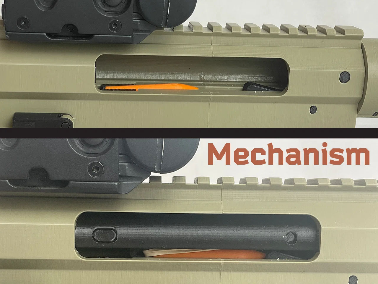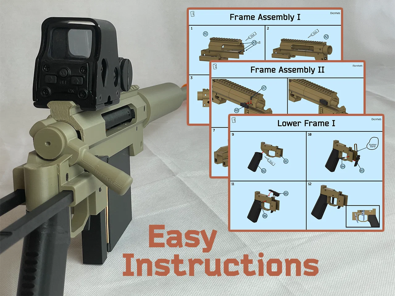 “E200” được tạo ra như một món đồ chơi dựa trên các hệ thống/cơ chế thường thấy trong những mô hình súng Lego hoạt động được. Ưu điểm của in 3D là các cơ chế này có thể được thu nhỏ và tối ưu hóa tốt hơn nhiều. Với in 3D, bạn không còn bị giới hạn bởi các mảnh ghép mà Lego sản xuất, mà chỉ bị giới hạn bởi trí tưởng tượng của chính mình. Cả mô hình Lego lẫn các mẫu in 3D hiện nay đều có chung một mục tiêu là phóng một mảnh nhựa ra khỏi nòng súng theo cách ngầu nhất hoặc chân thực nhất có thể.